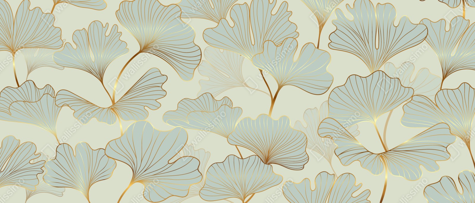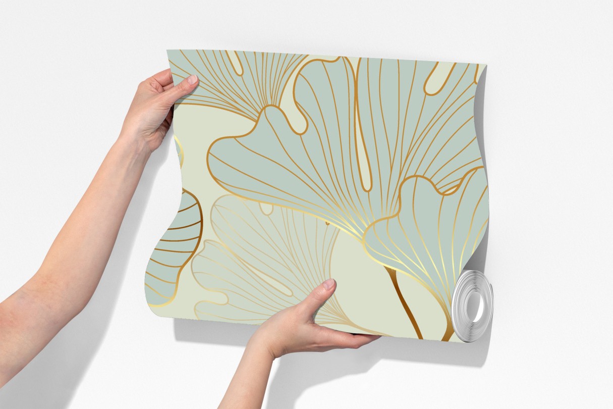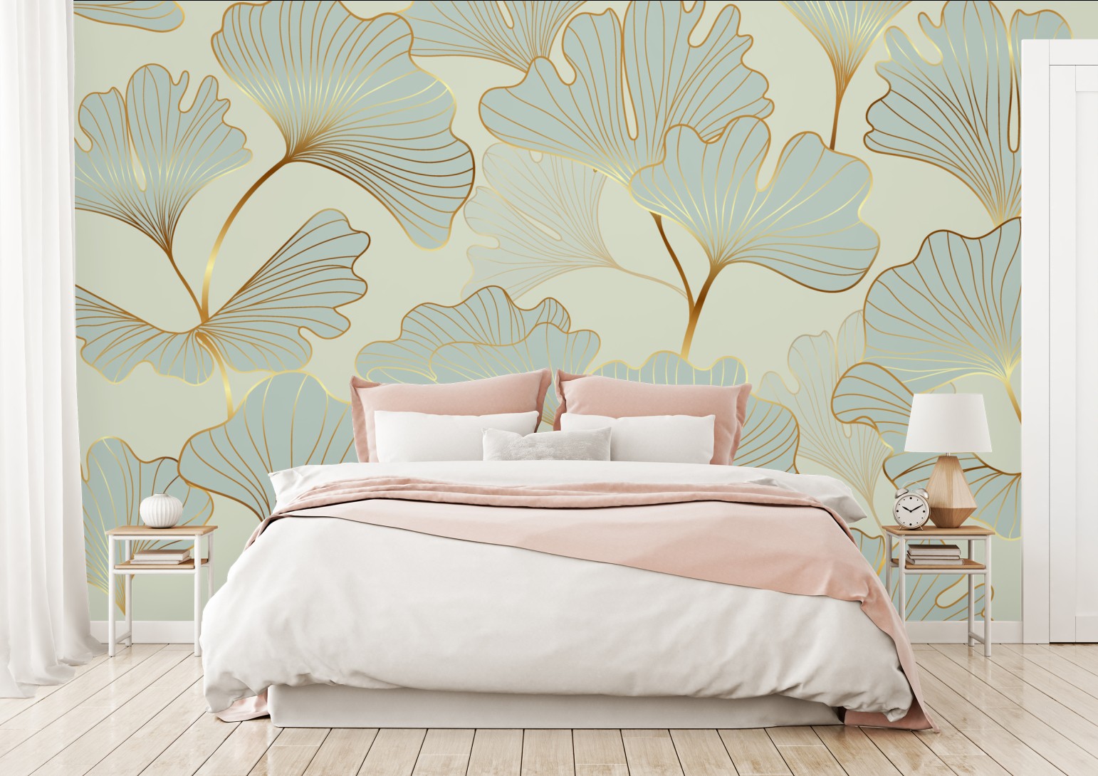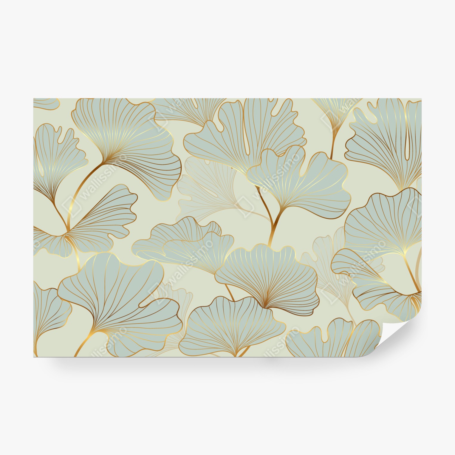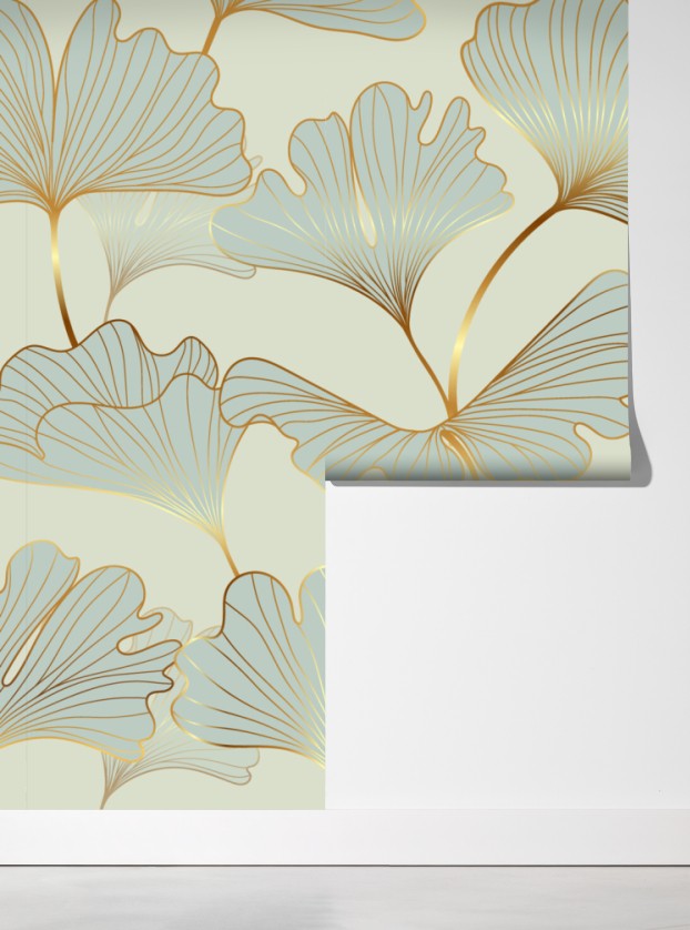 Wprowadź spokojną elegancję do wnętrza dzięki pastelowemu wzorowi liści miłorzębu z delikatnymi złotymi akcentami.