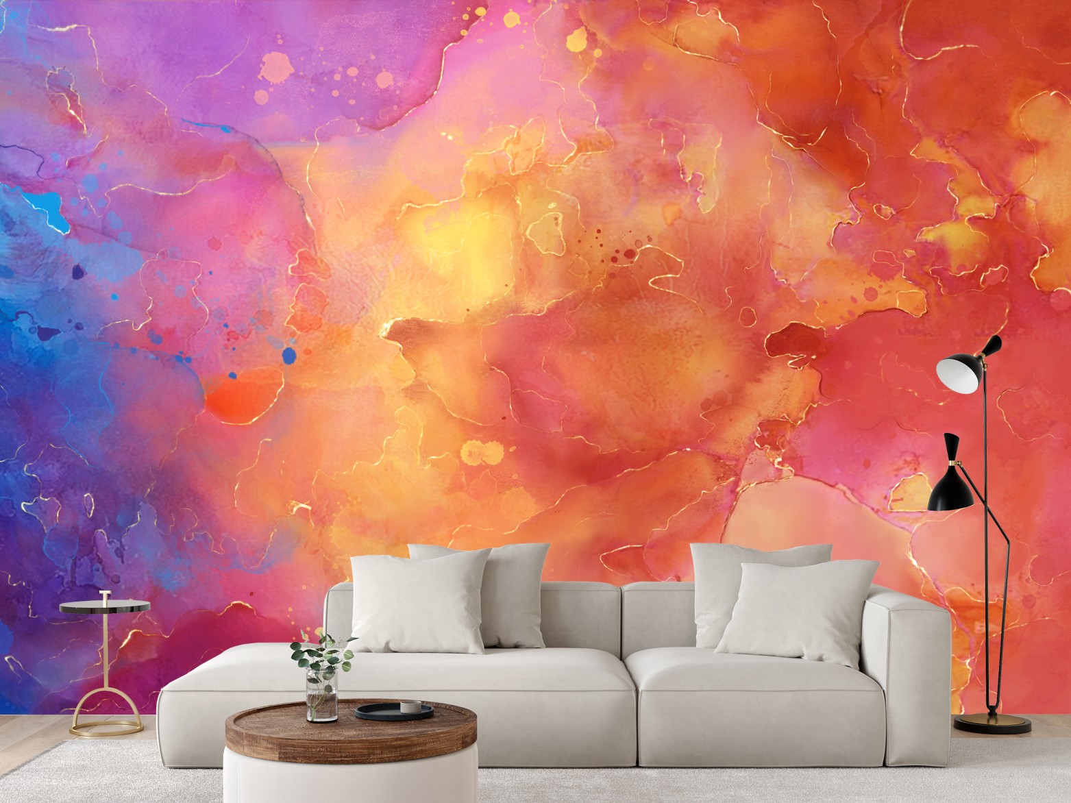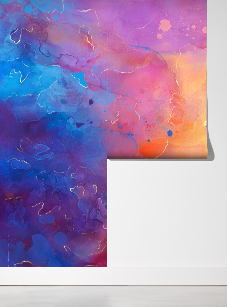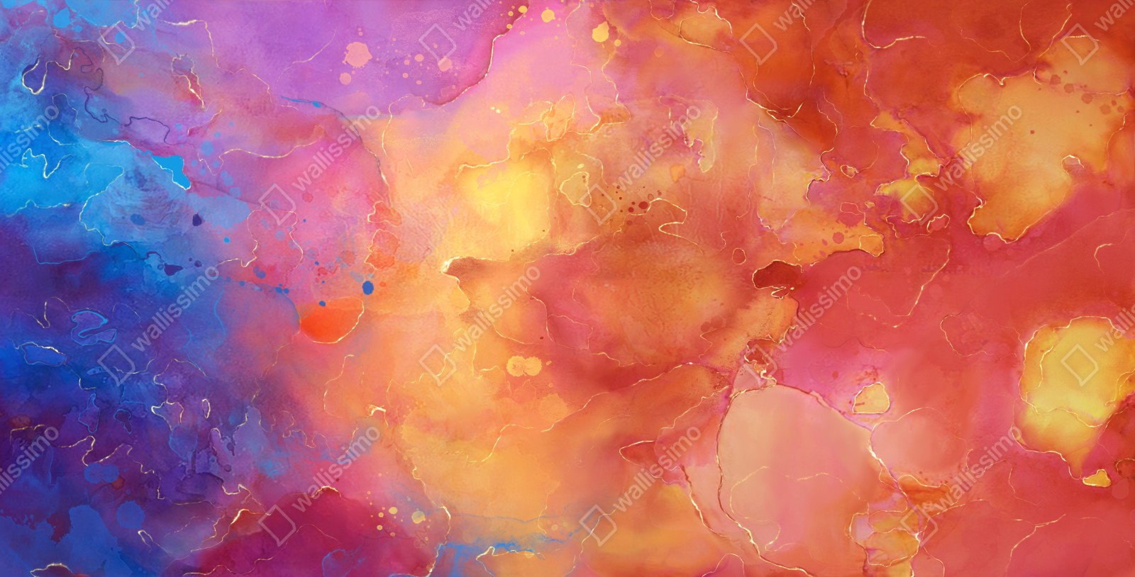 Wprowadź energetyczny kolor do wnętrza dzięki tej żywej akwarelowej abstrakcji z płynnymi formami i złotymi akcentami, idealna jako nowoczesny punkt centralny.