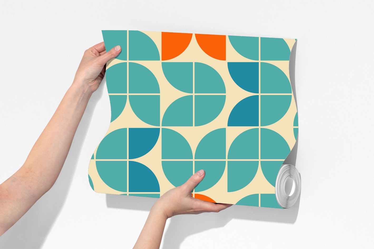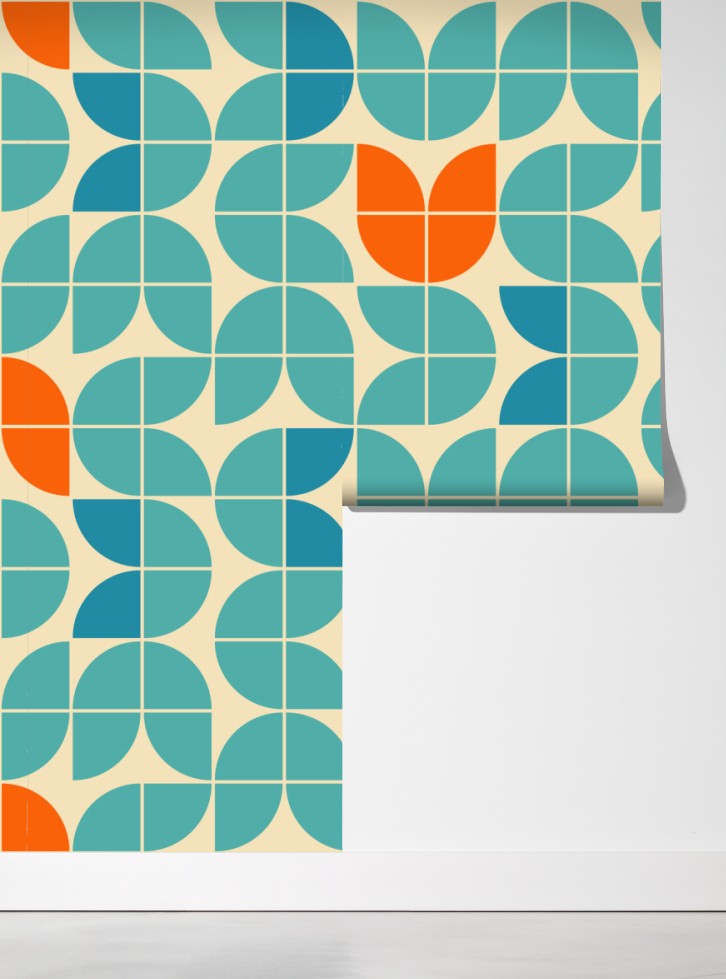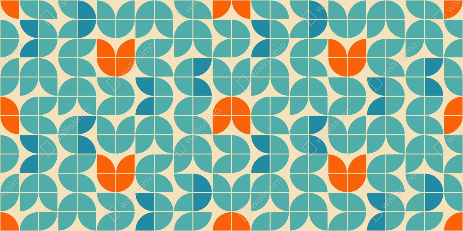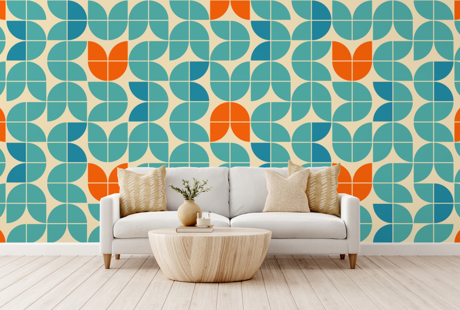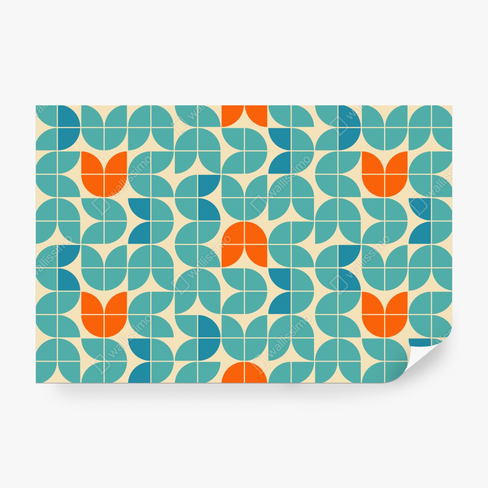 Dodaj retro akcent do wnętrza dzięki geometrycznemu wzorowi w turkusie i pomarańczy, idealnemu do nowoczesnych pomieszczeń.