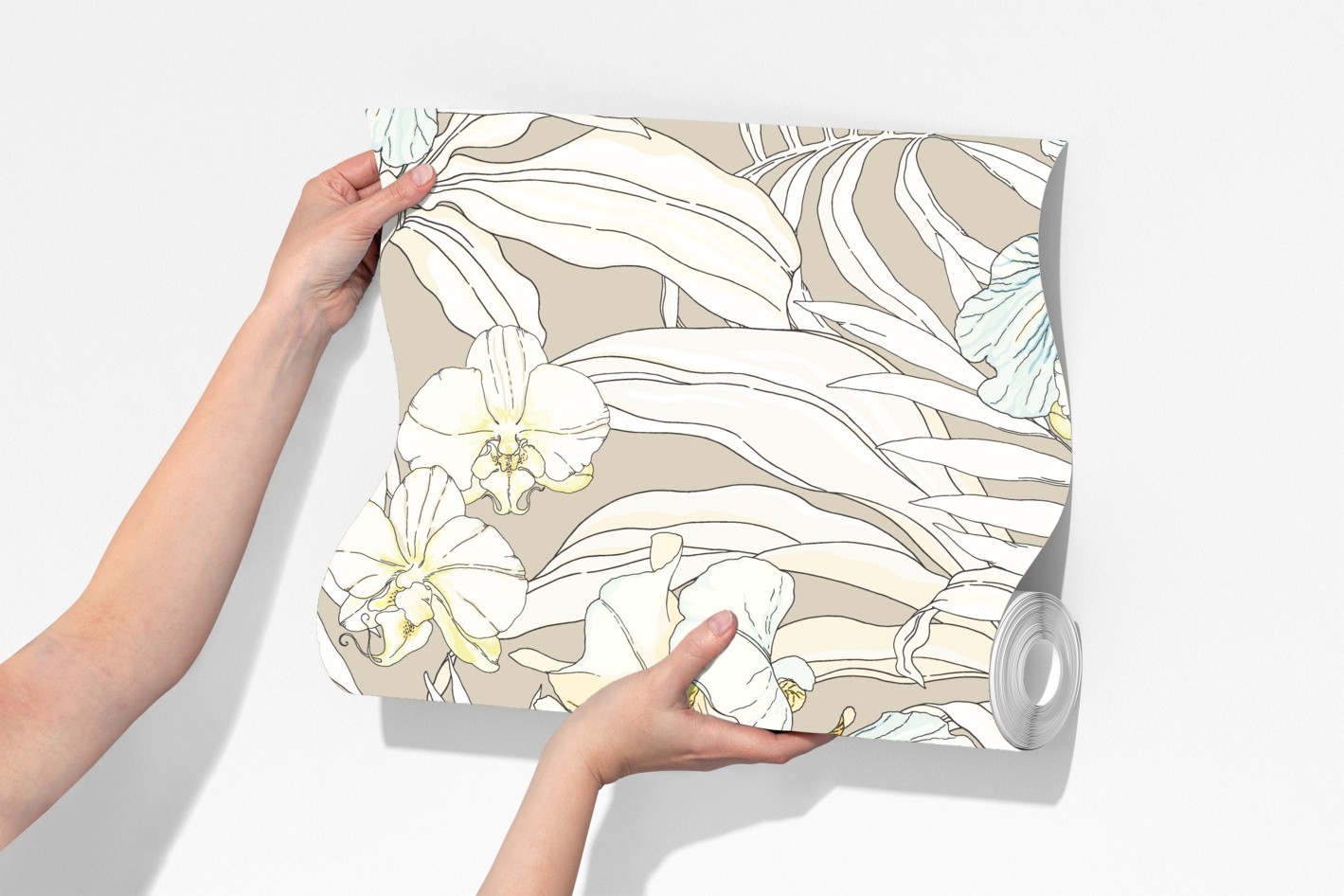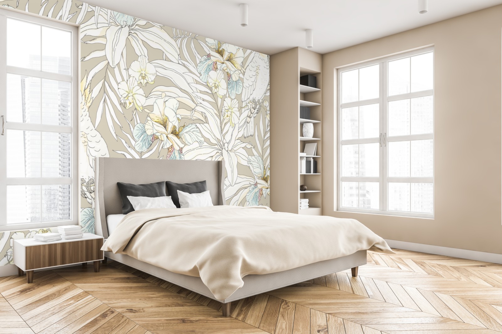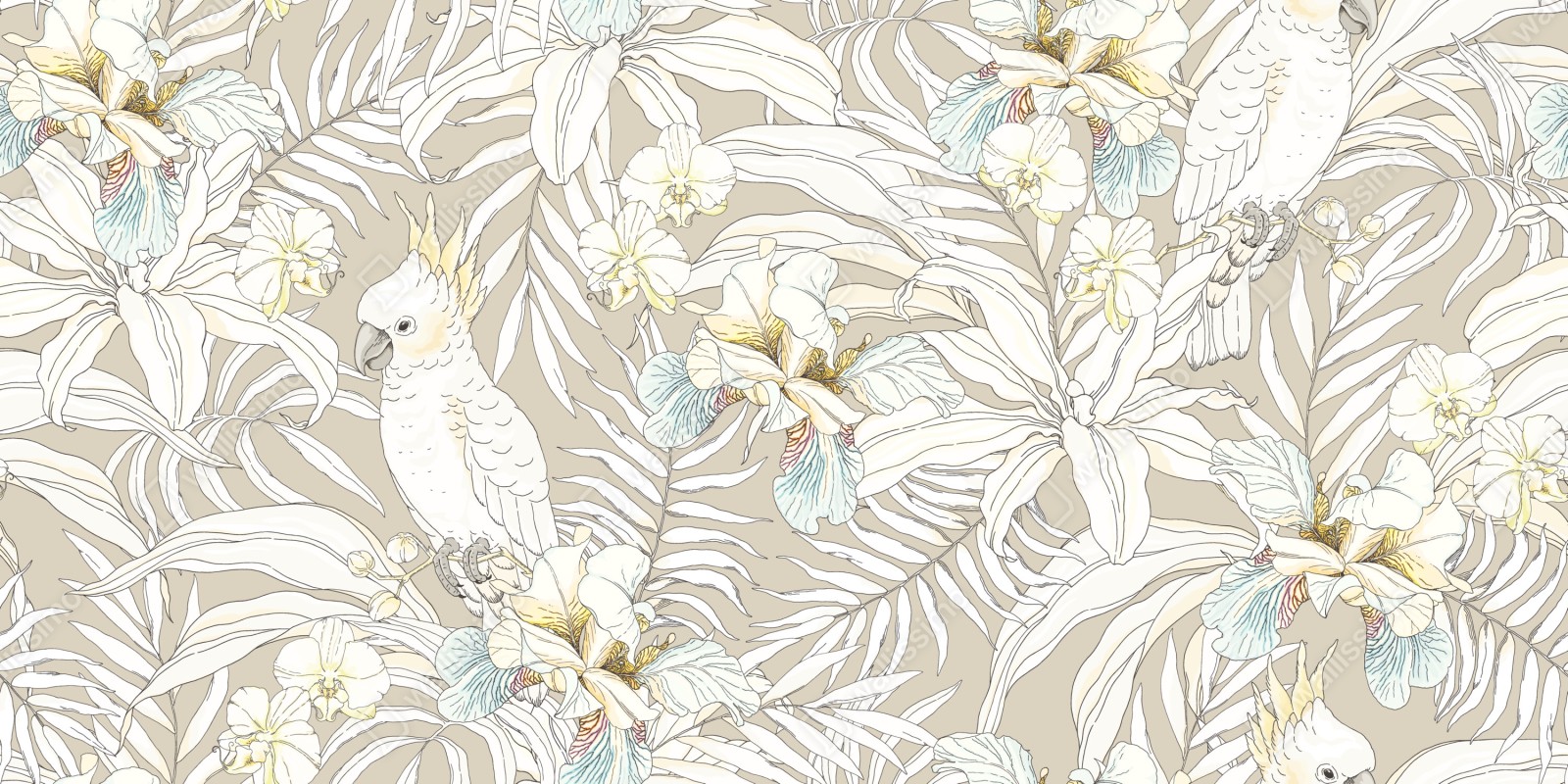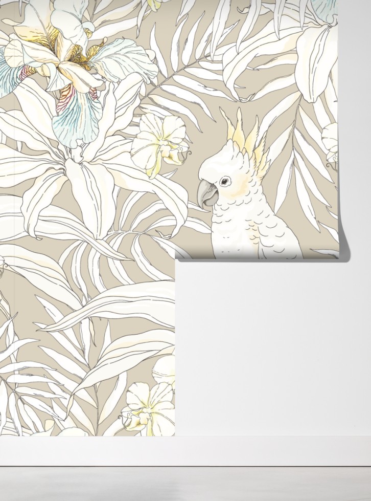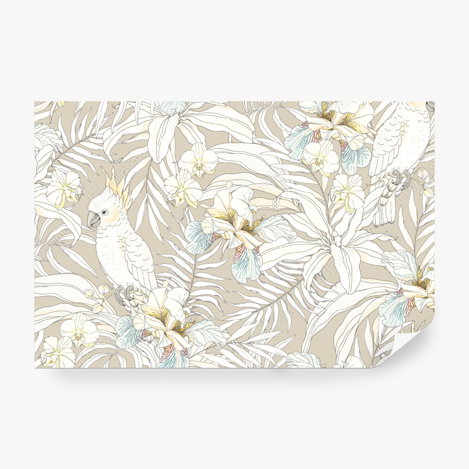 Dodaj tropikalny, spokojny nastrój do swojego wnętrza dzięki delikatnym kakadu i subtelnym kwiatowym motywom w stonowanej beżowej palecie.