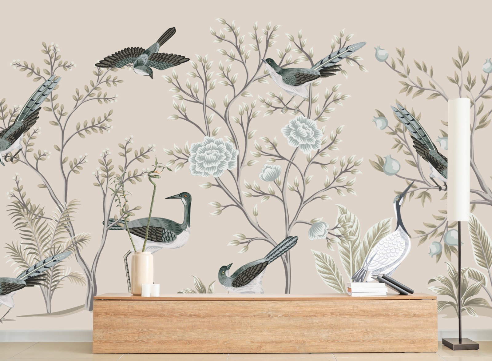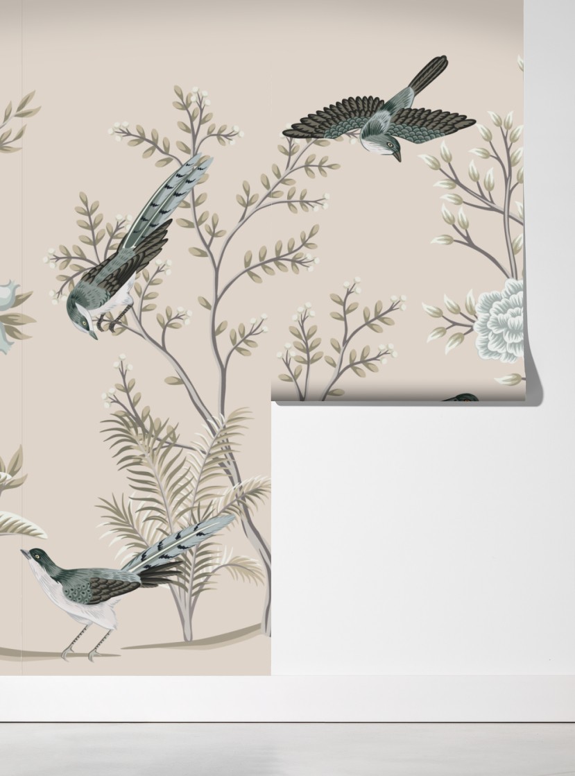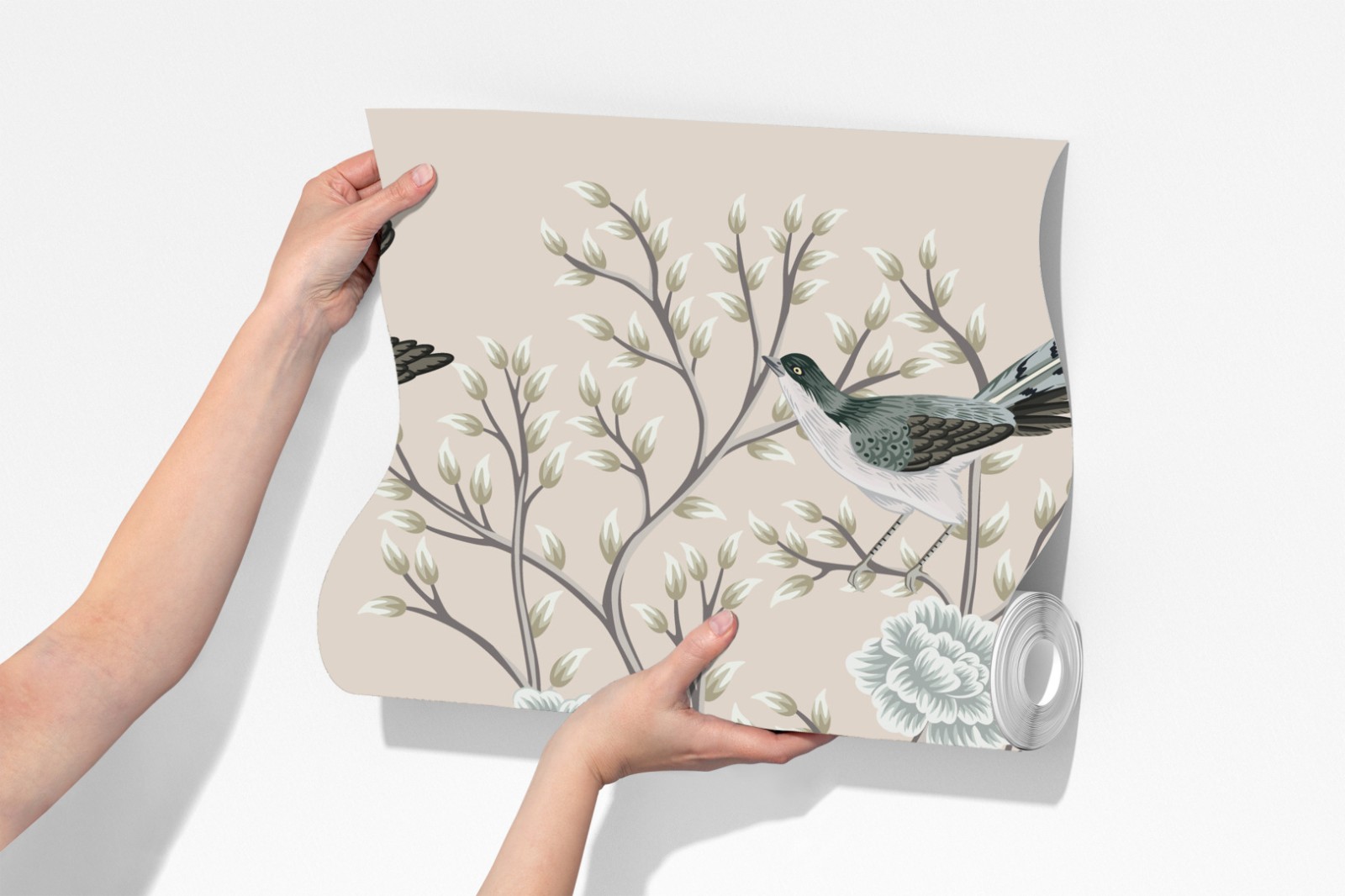 Wprowadź spokojny, vintage-inspirowany urok dzięki delikatnym ptakom zatopionym w subtelnych kwiatach na neutralnym tle.