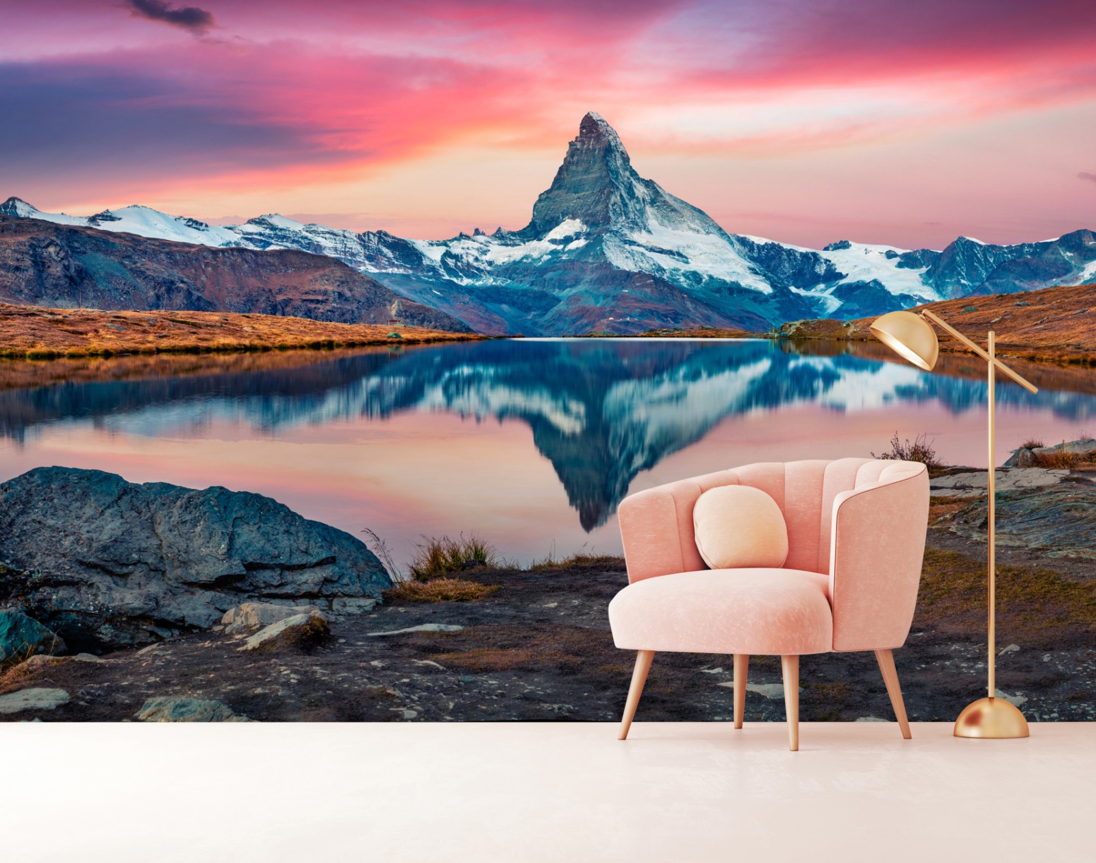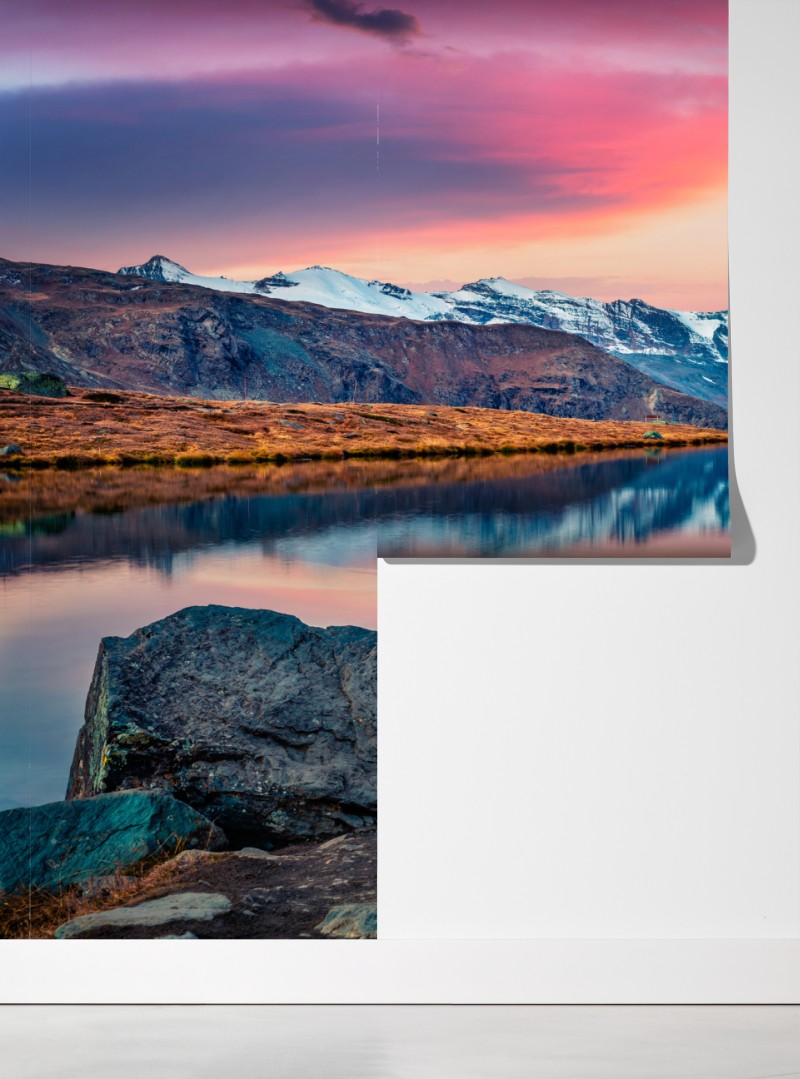Odkryj spokojne odbicie Matterhornu w jeziorze Stellisee o poranku, idealne do wnętrz i nadania alpejskiego charakteru.