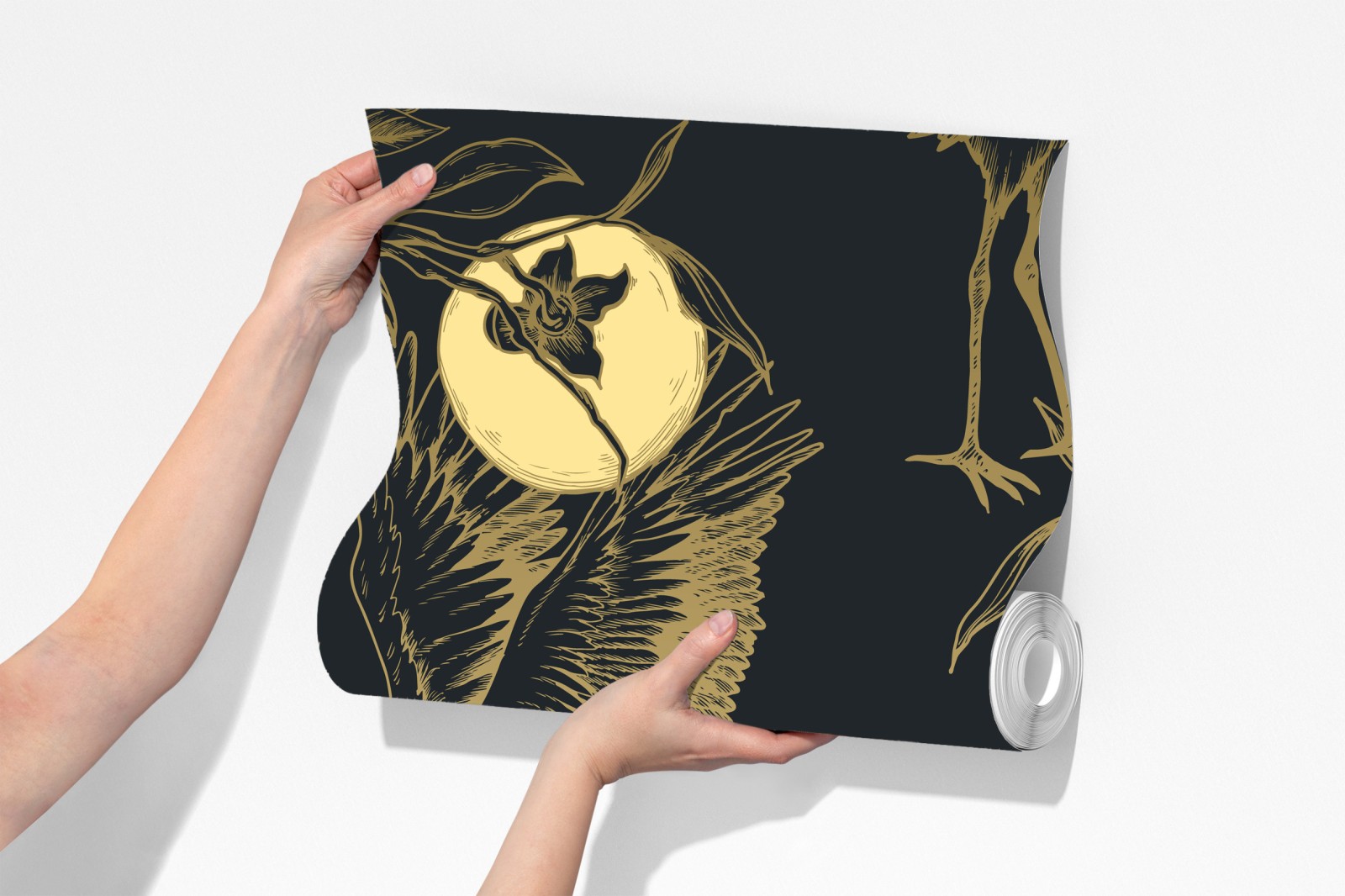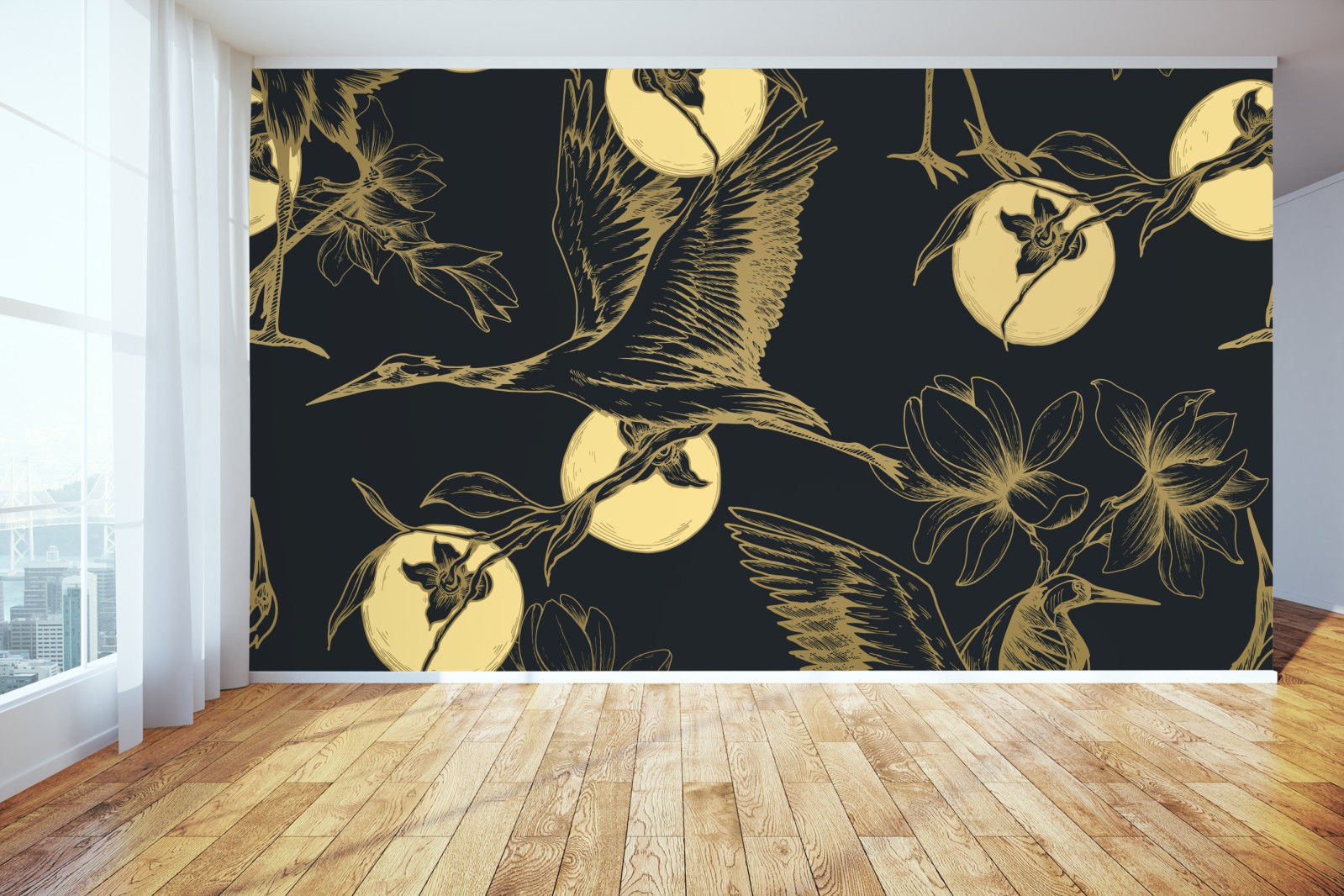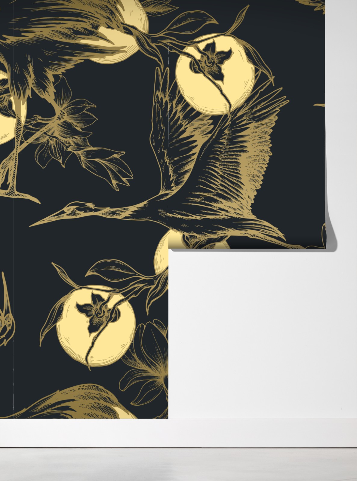 Podkreśl wnętrze eleganckim motywem złotych żurawi na grafitowym tle, który wnosi orientalną sofistykację i ponadczasowy urok.