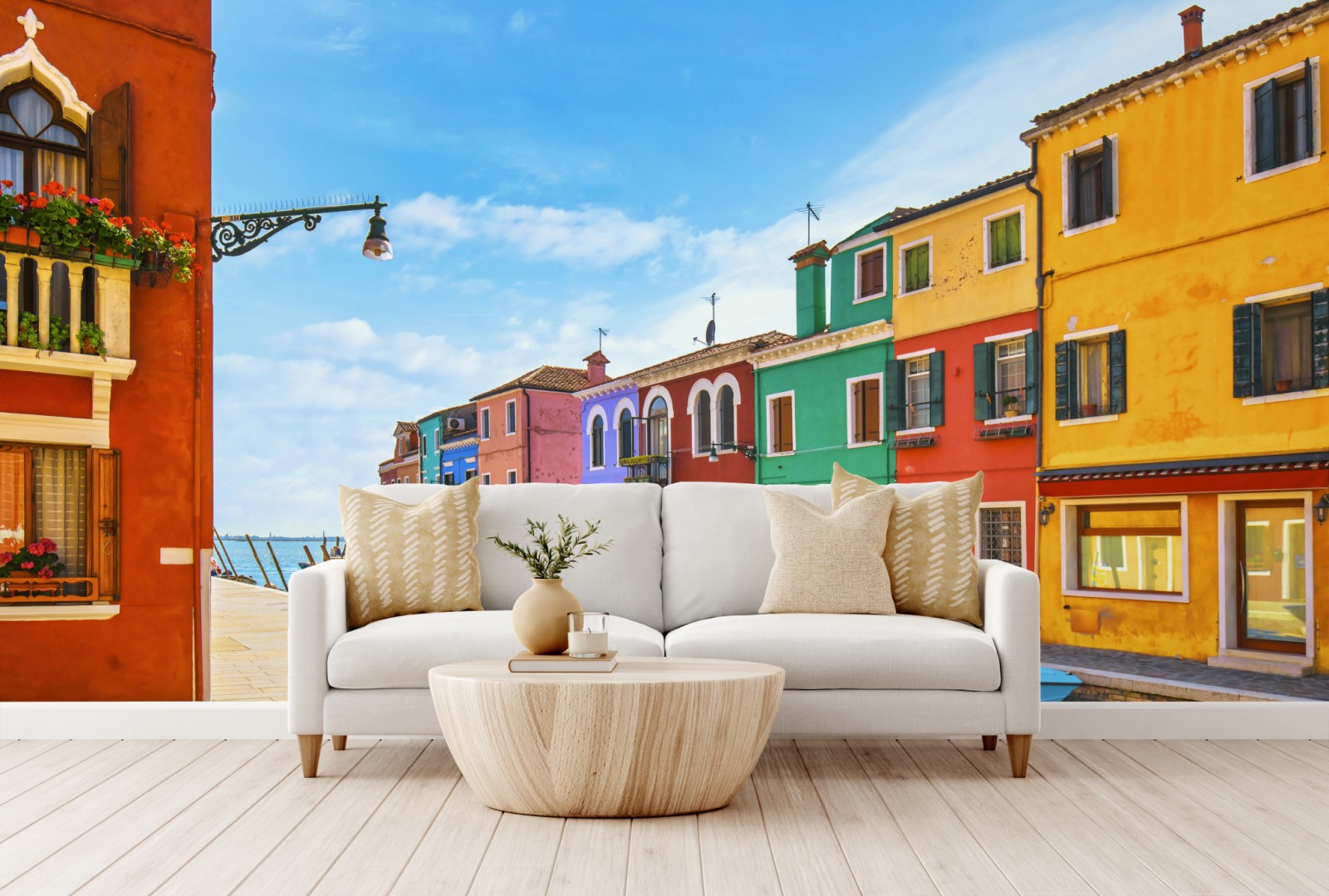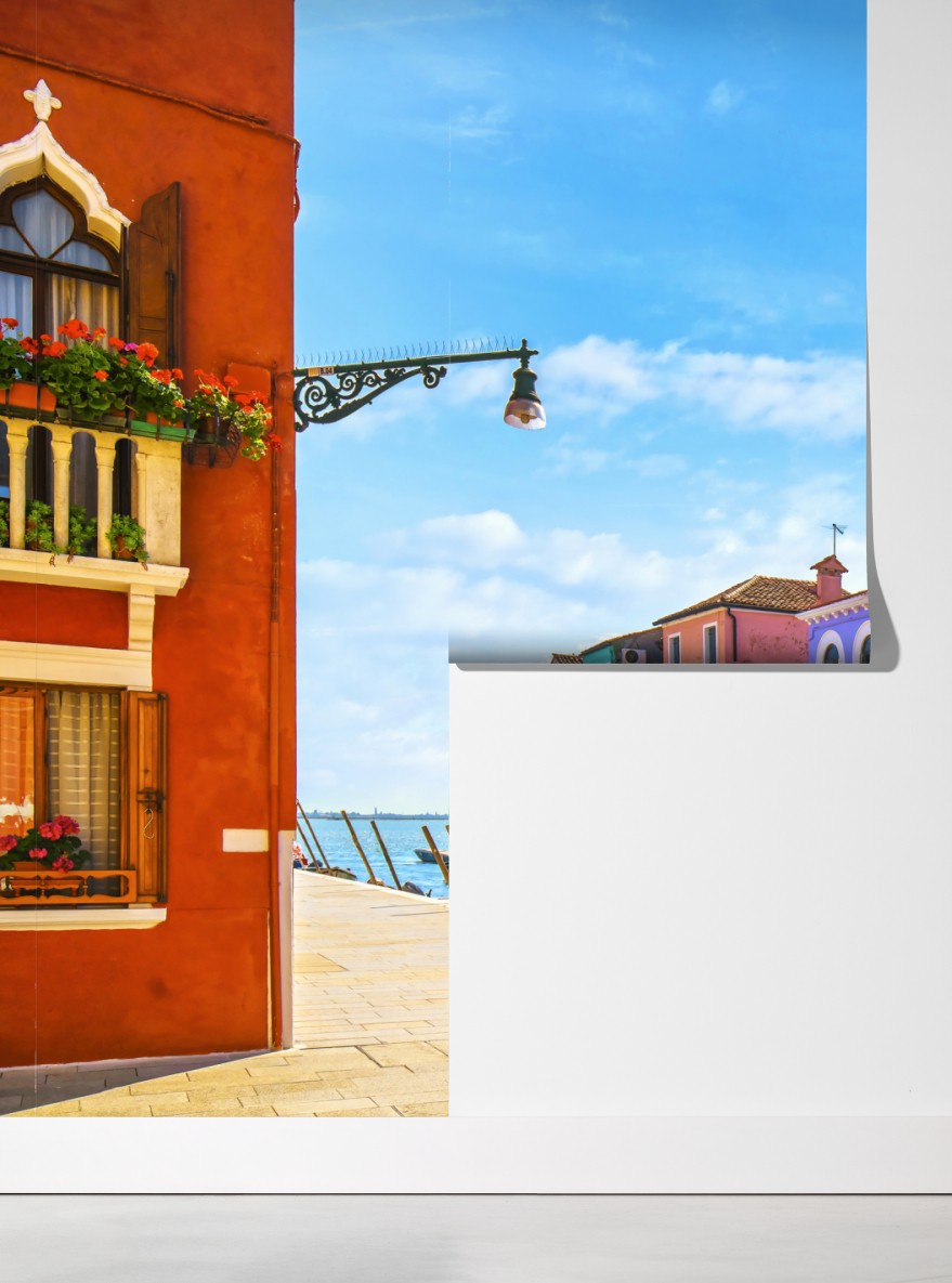 Dodaj wnętrzu żywy włoski klimat dzięki temu zdjęciu kolorowych domów w Burano nad malowniczym kanałem.