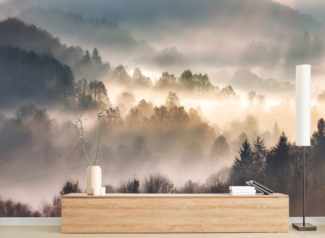 - góry, krajobraz, drzewa, las, natura, spokój, malowniczy, mgła, poranek, tajemniczy
