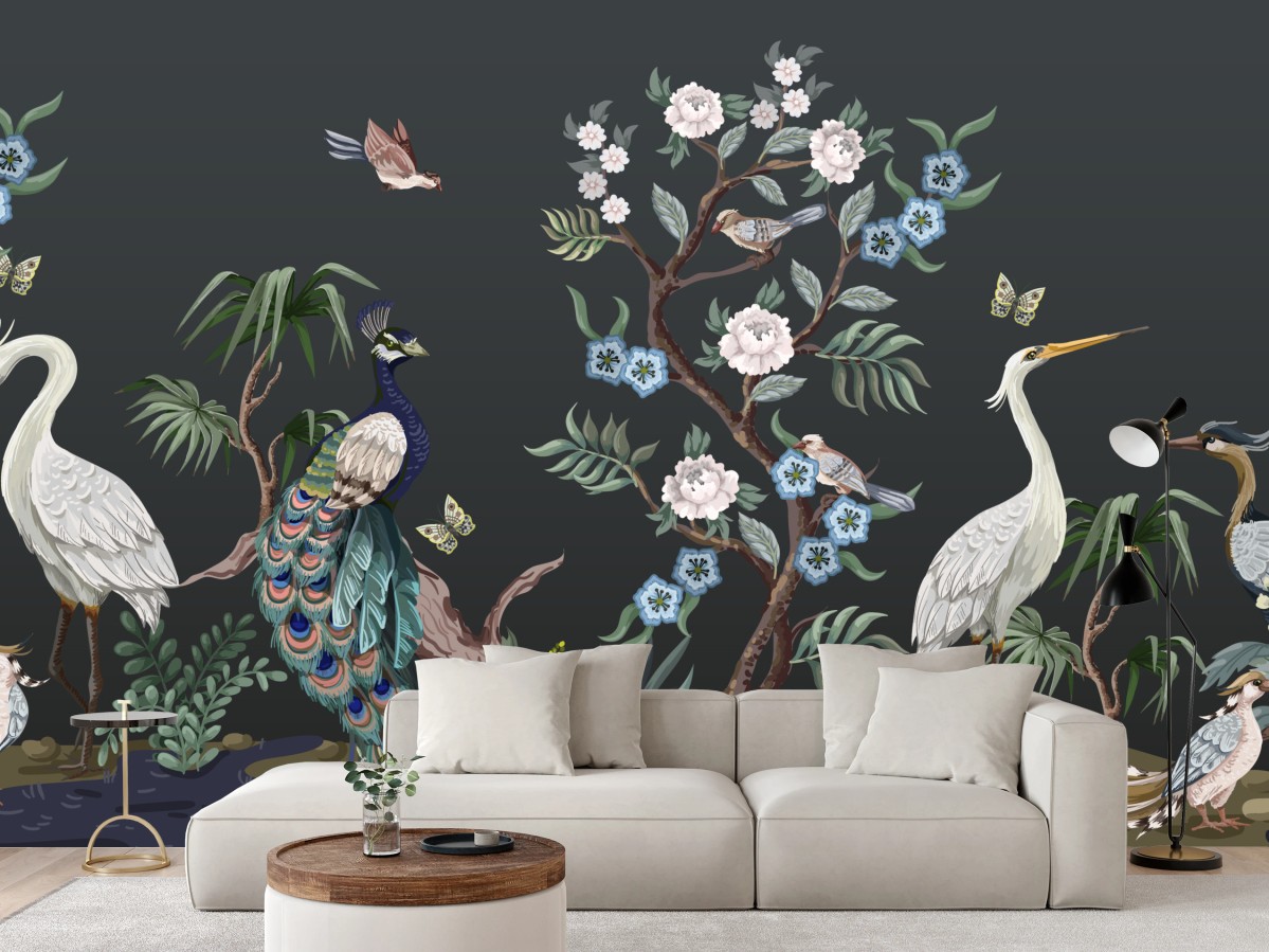 Fototapeta Pawie i czaple w kwiatowej scenie