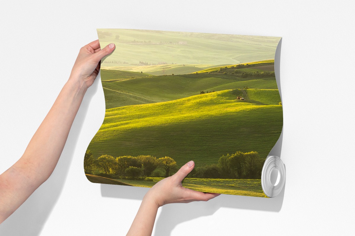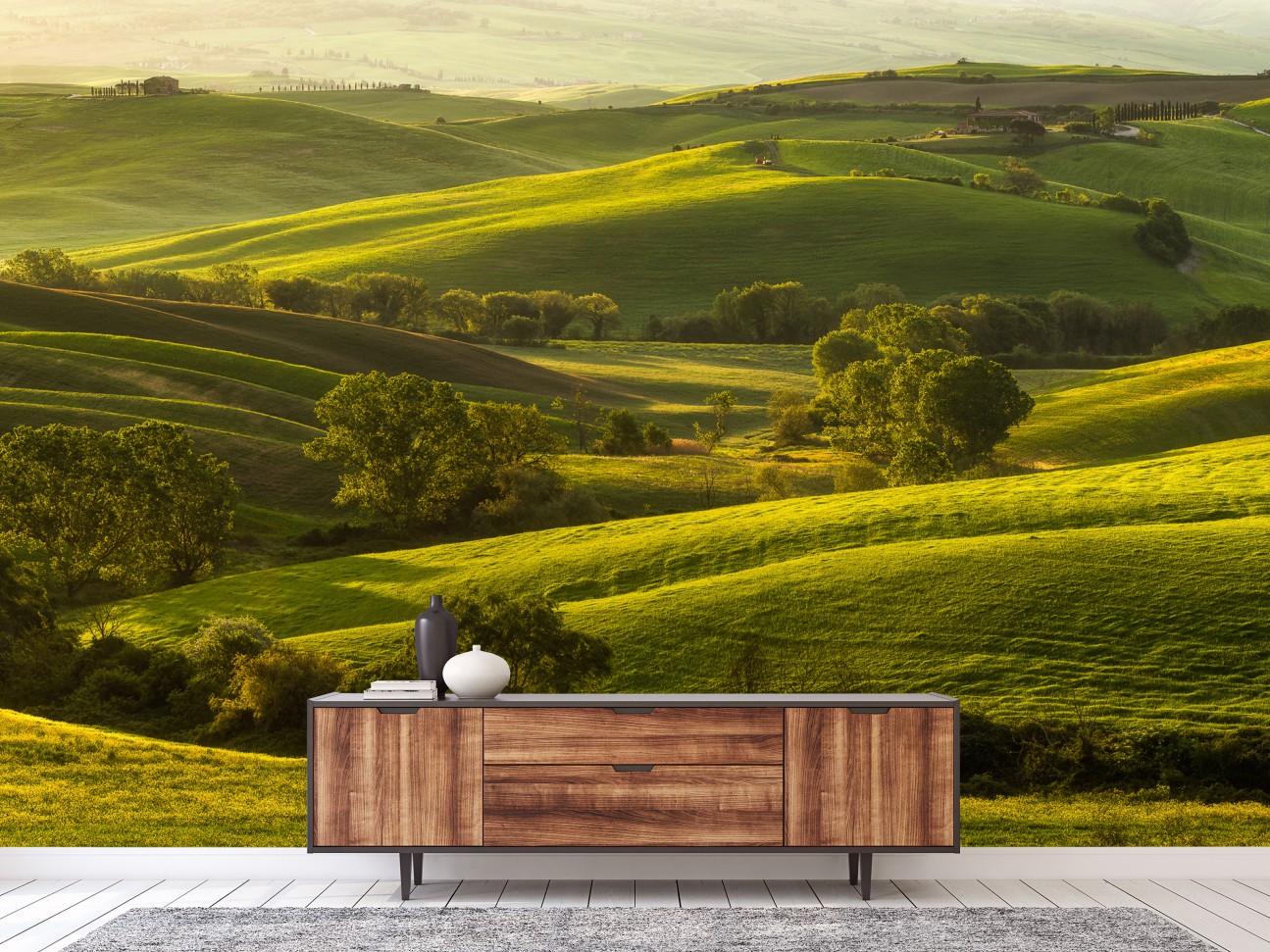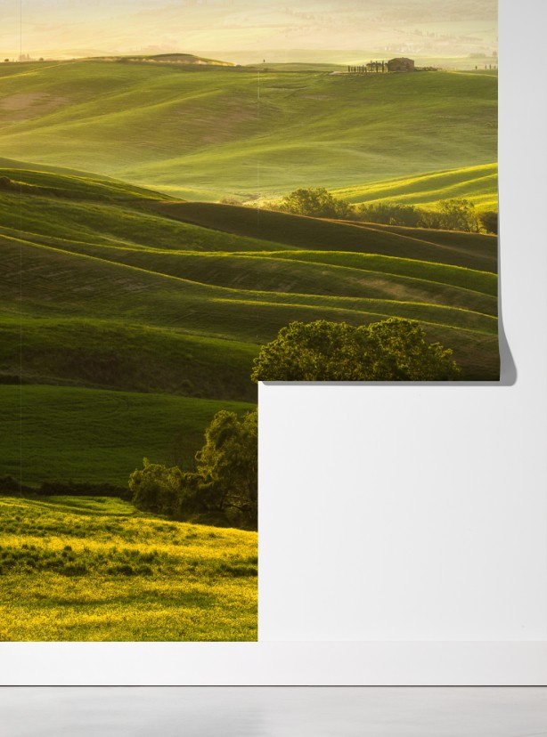 Wprowadź do wnętrza spokój dzięki słonecznym zielonym pagórkom uchwyconym w żywych kolorach, idealne jako centralny element dekoracji.