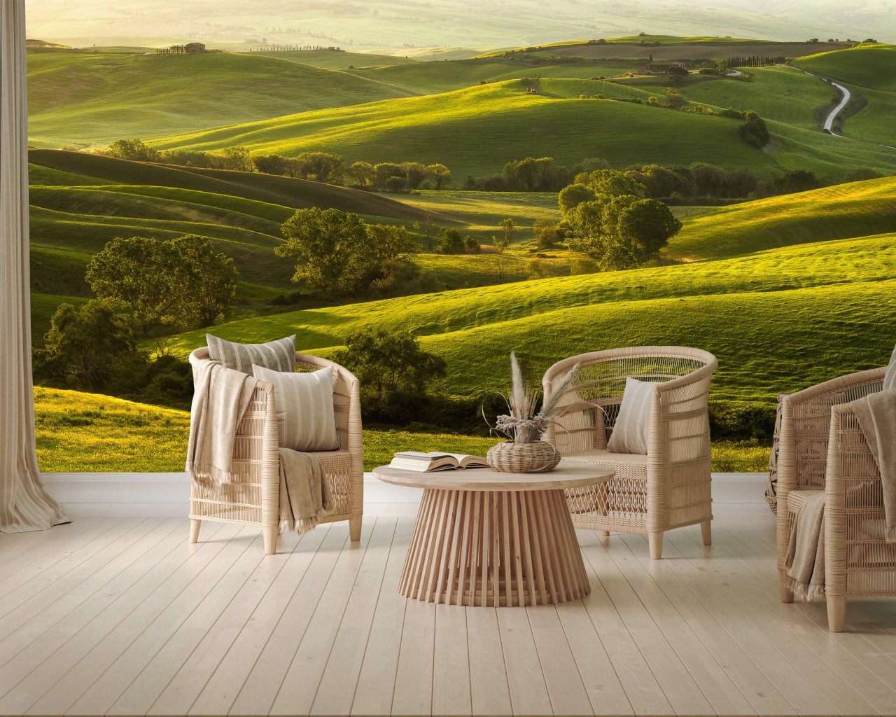 - drzewa, natura, fotografia przyrodnicza, spokojna sceneria, krajobraz wiejski, pagórki, zielone łąki, pola oświetlone słońcem, pagórkowaty teren, sielski widok