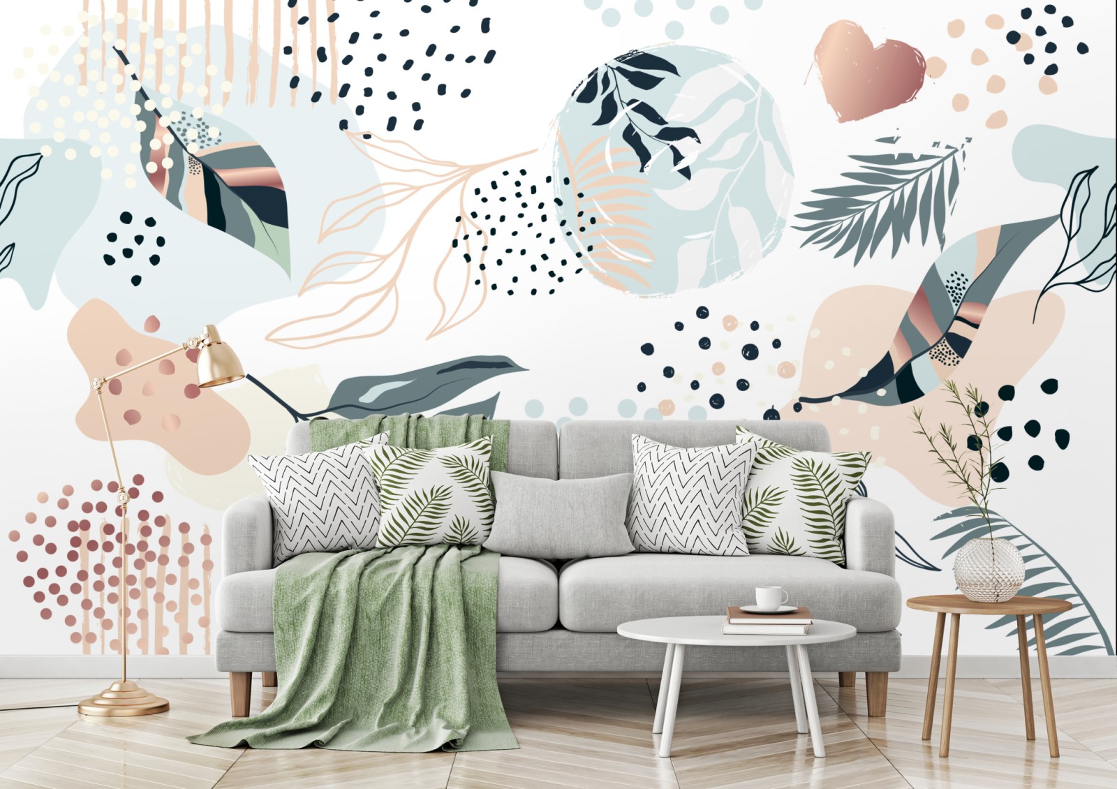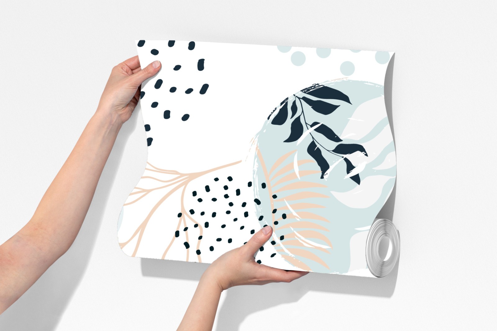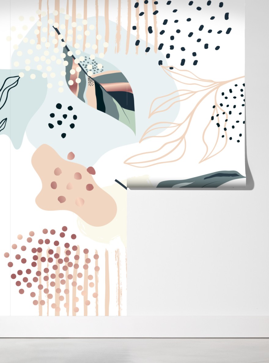Dodaj uspokajające pastelowe tony i organiczne motywy liści do swojego wnętrza dzięki temu nowoczesnemu abstrakcyjnemu wzorowi botanicznemu, idealnemu do subtelnej dekoracji.