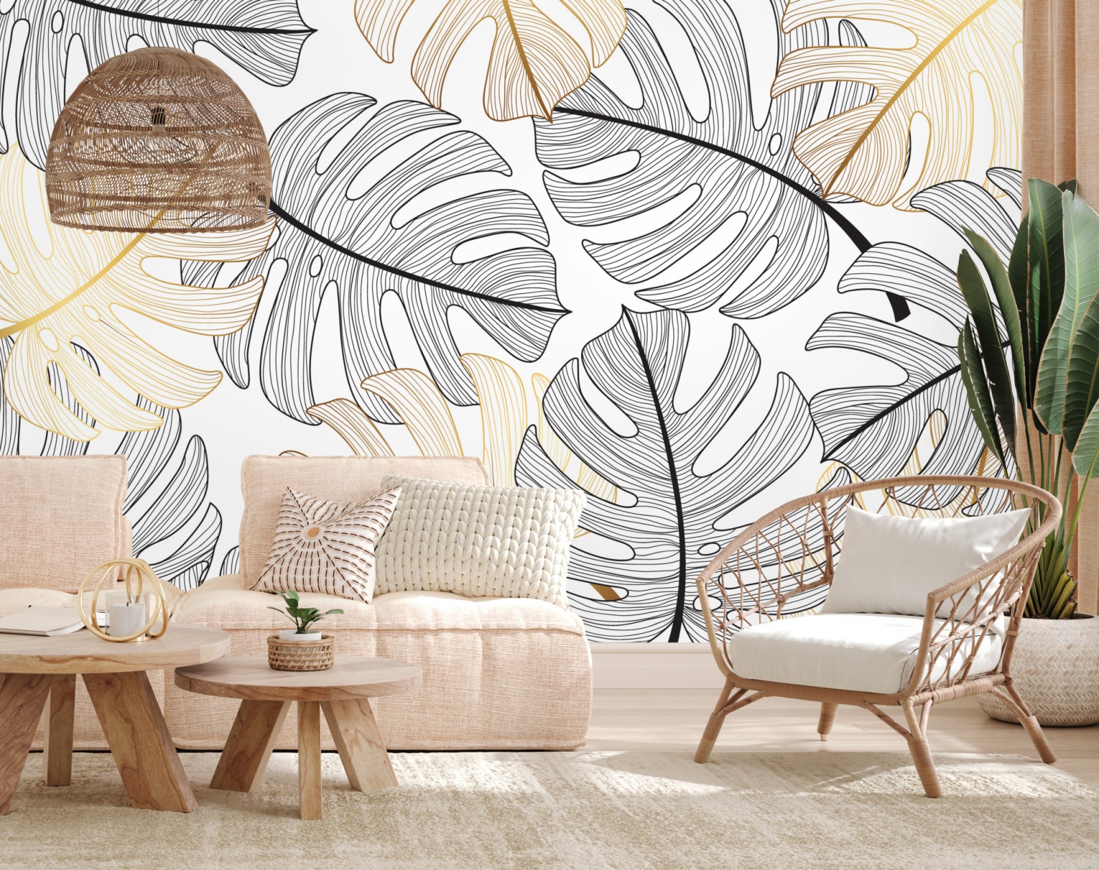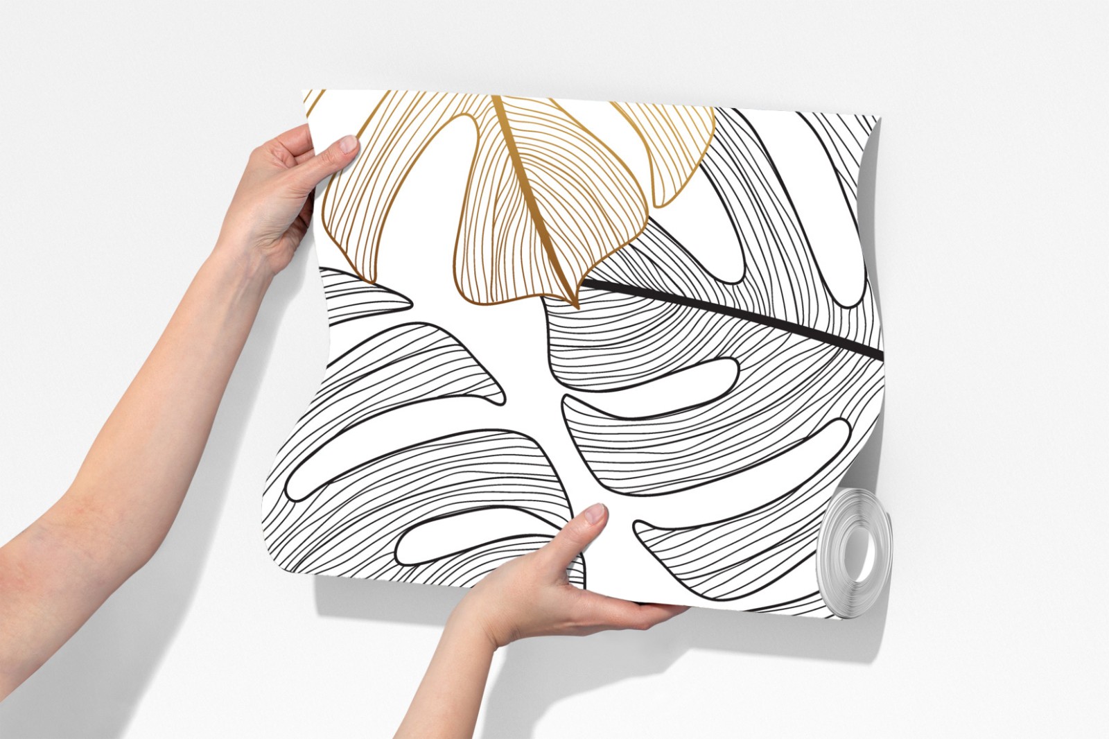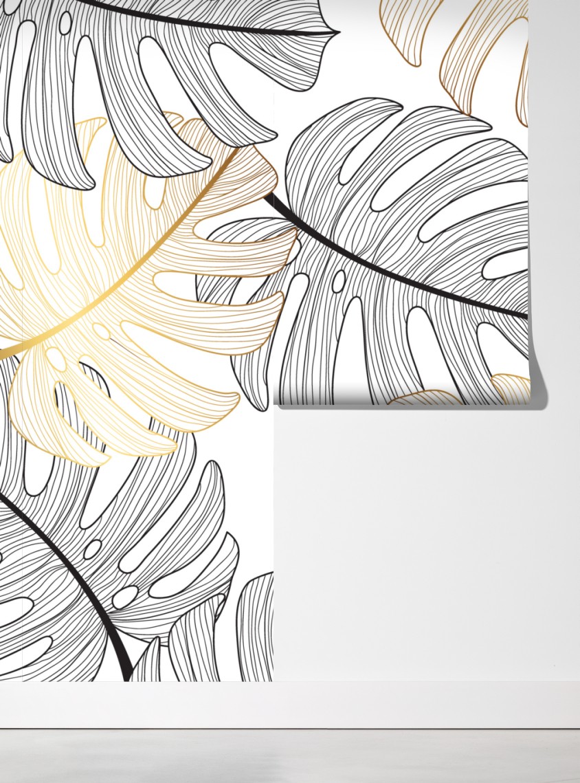 Elegancki, minimalistyczny wzór liści monstera z delikatnym złotym i czarnym rysunkiem, idealny do nowoczesnych wnętrz.