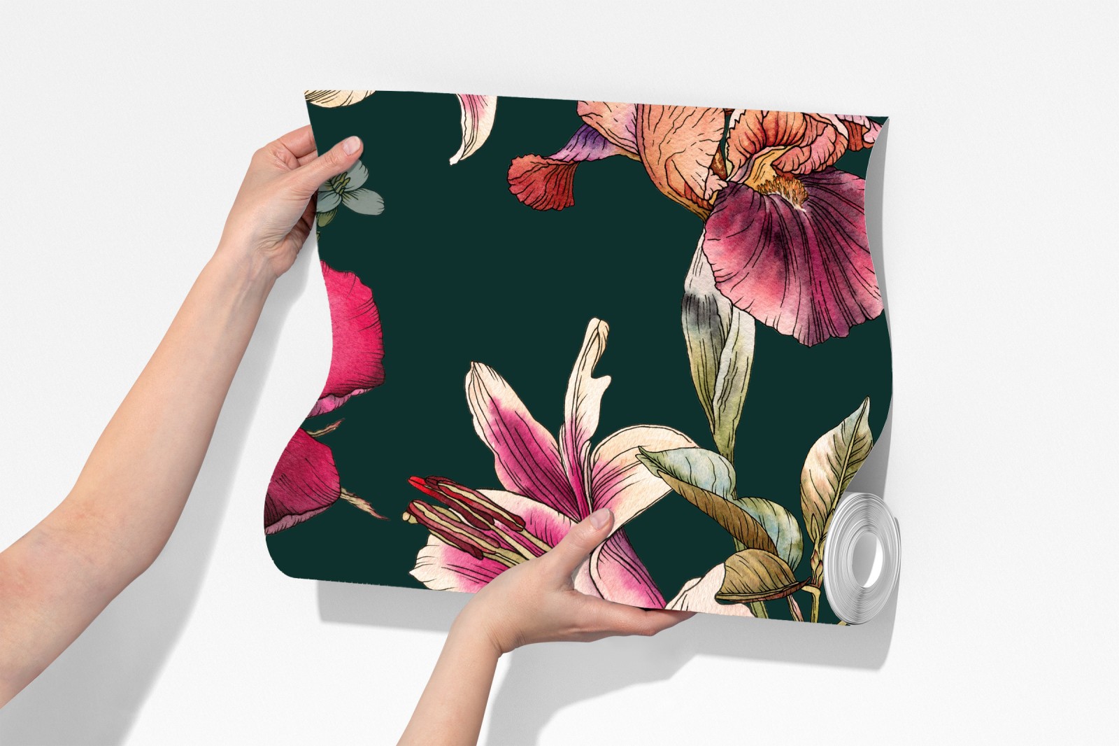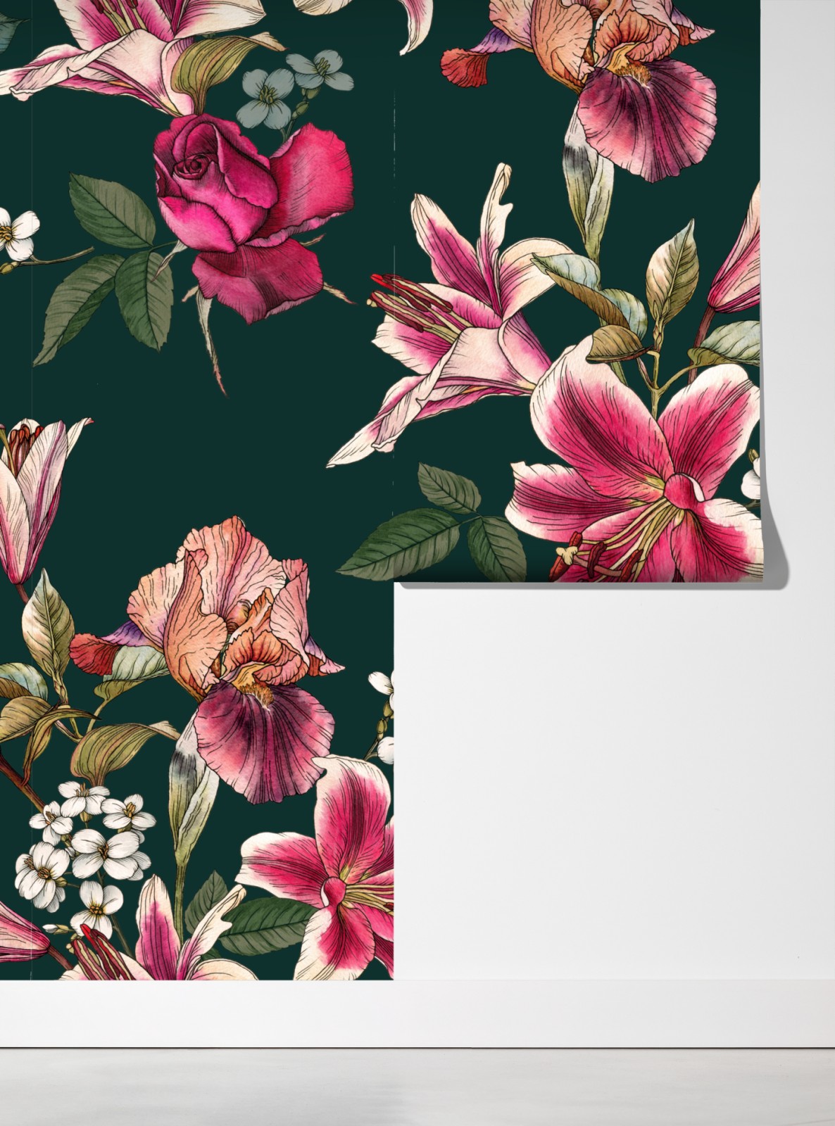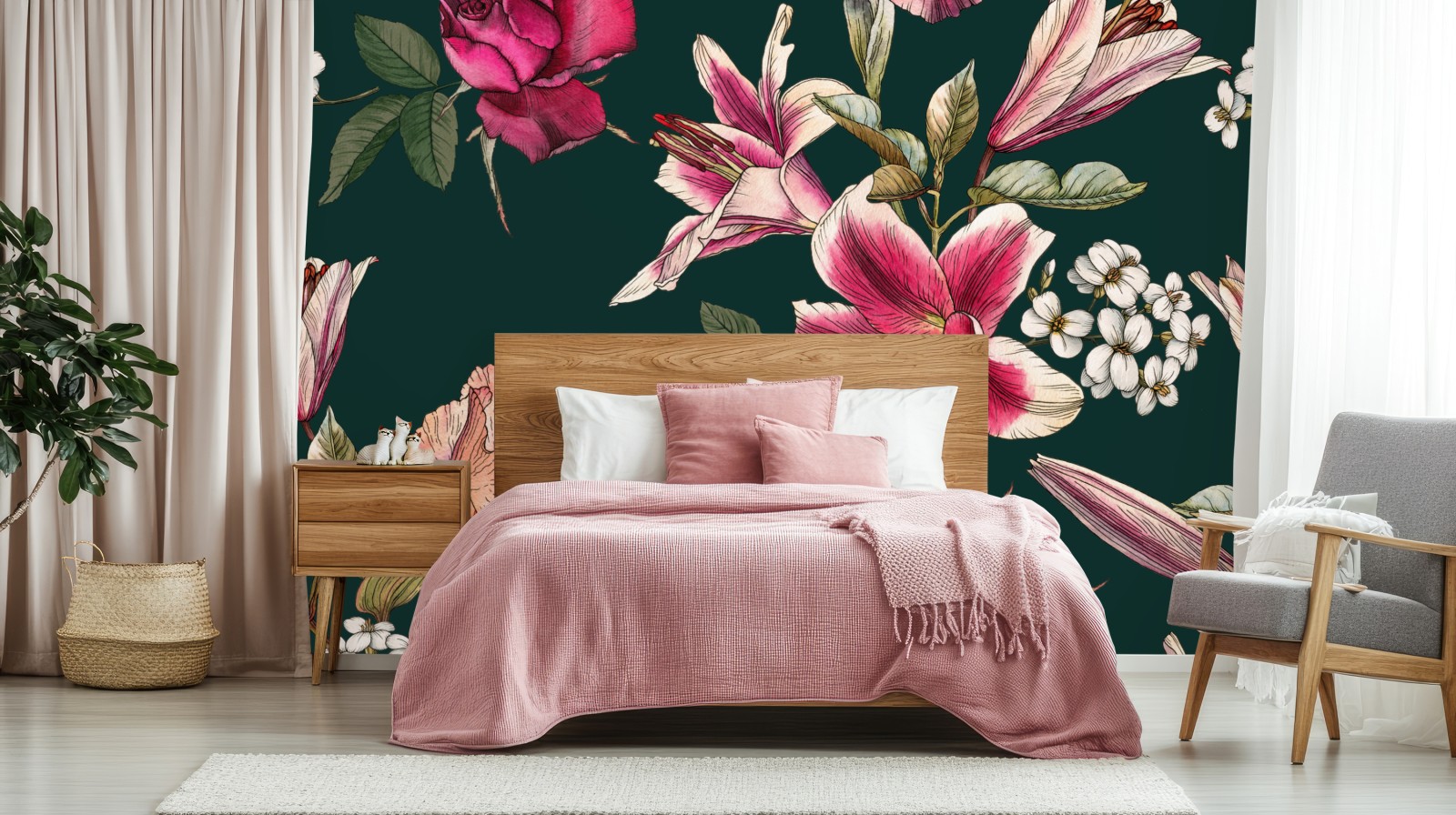 Dodaj ponadczasową kwiatową elegancję do wnętrza dzięki temu botanicznemu wzorowi w różowych tonach na głębokim zielonym tle.