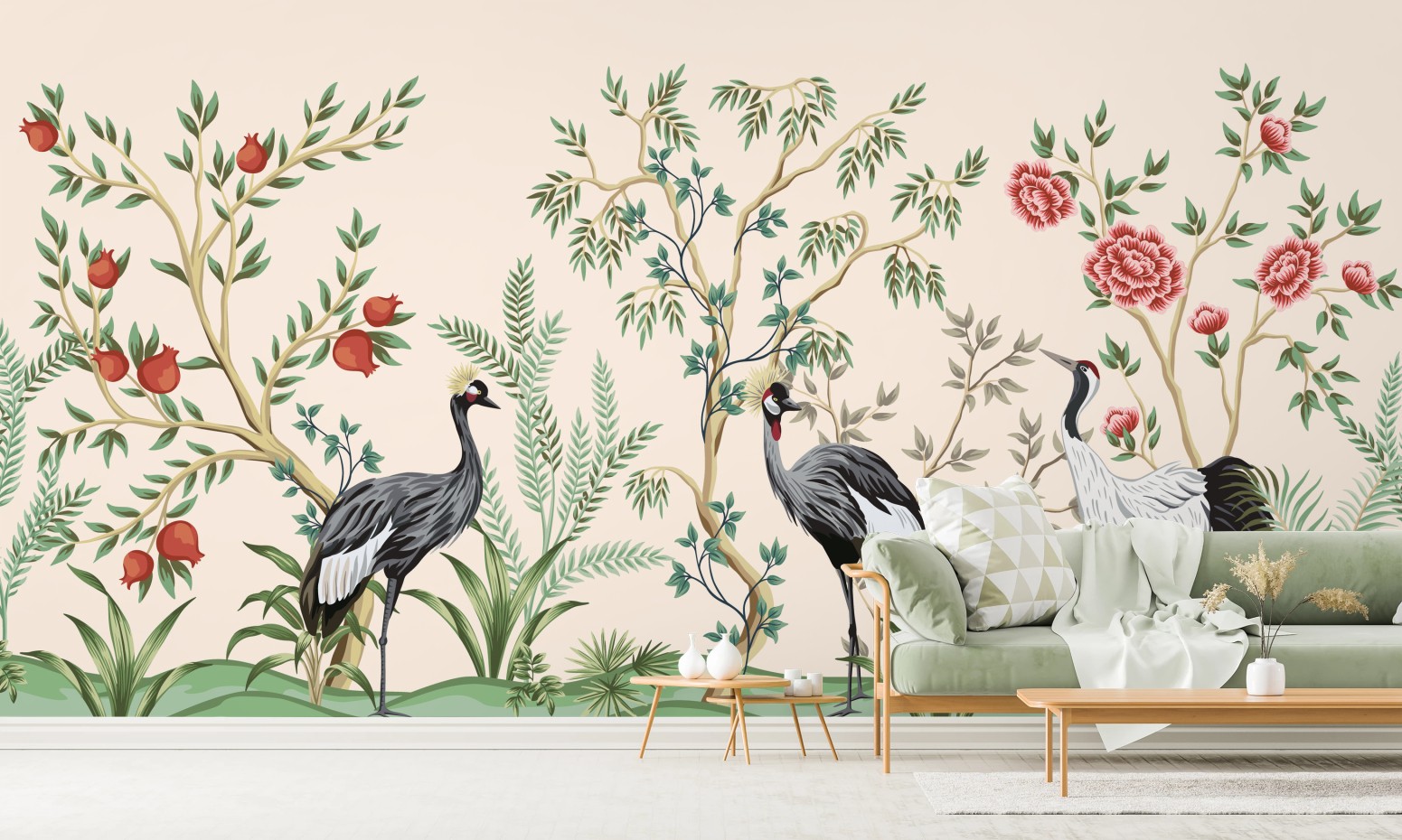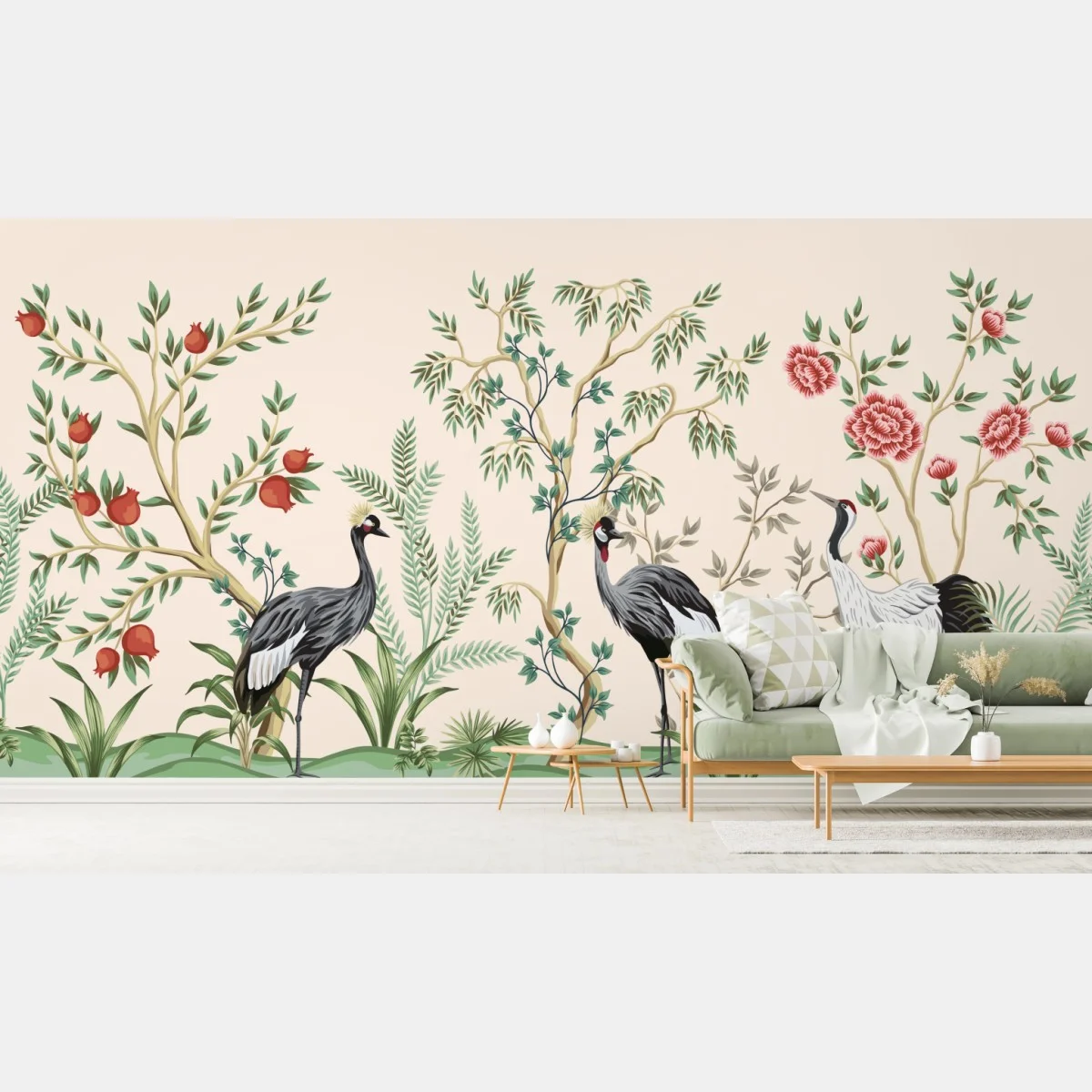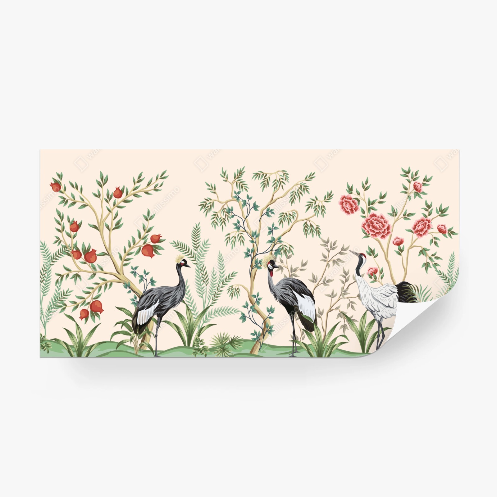 - pastel, ilustracja, liście, kwiaty, ptaki, orientalny, żurawie, peonie, ogród, owoce granatu