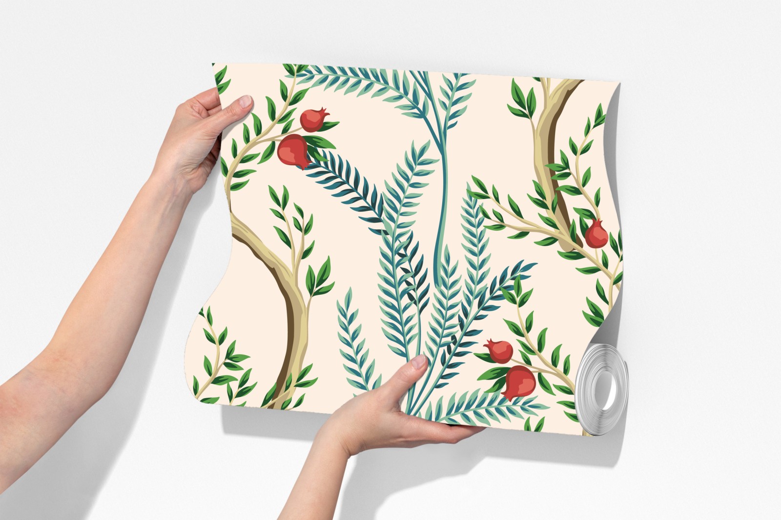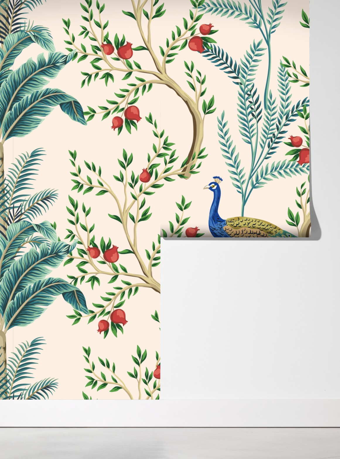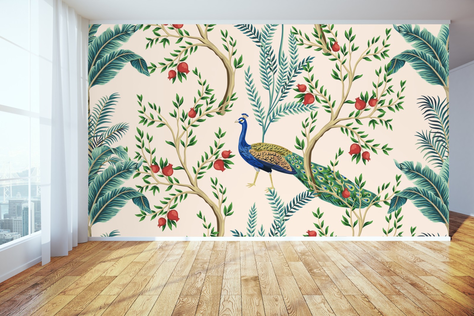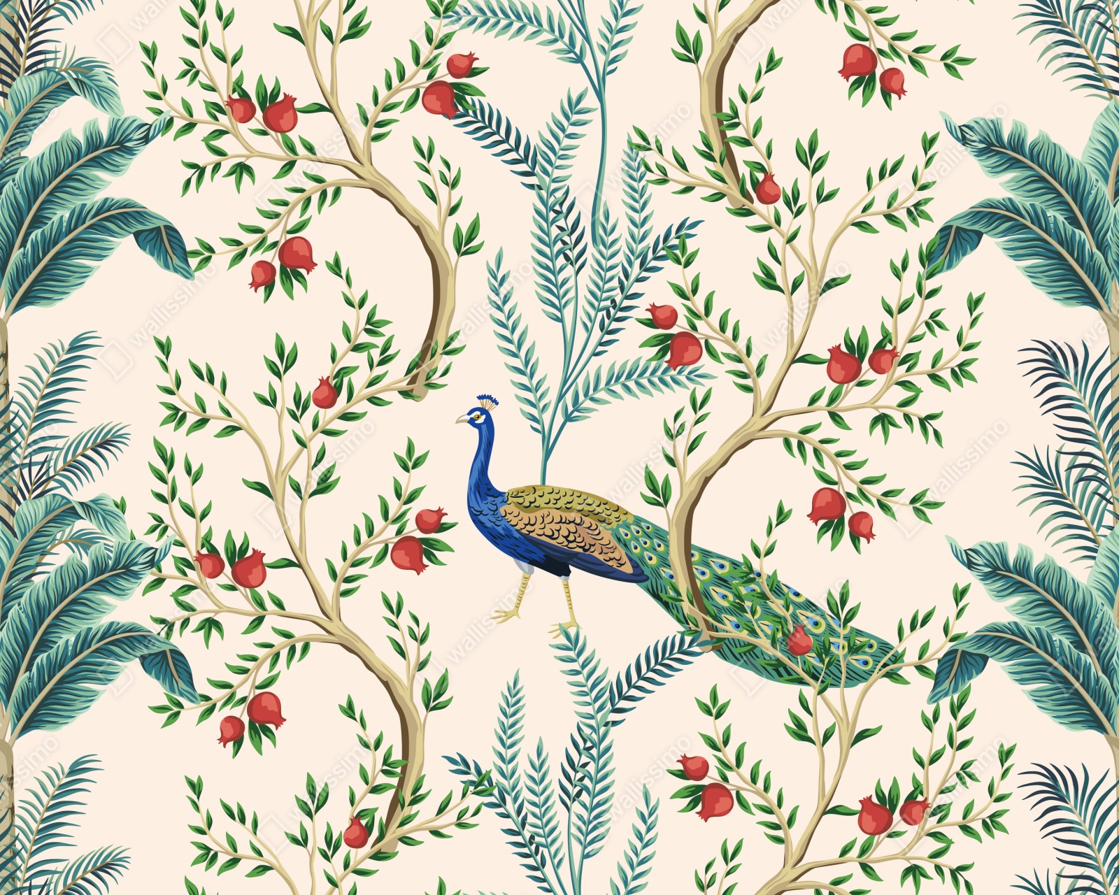 Dodaj egzotycznej elegancji do wnętrza dzięki barwnej ilustracji pawia i motywowi roślinnemu z granatami.