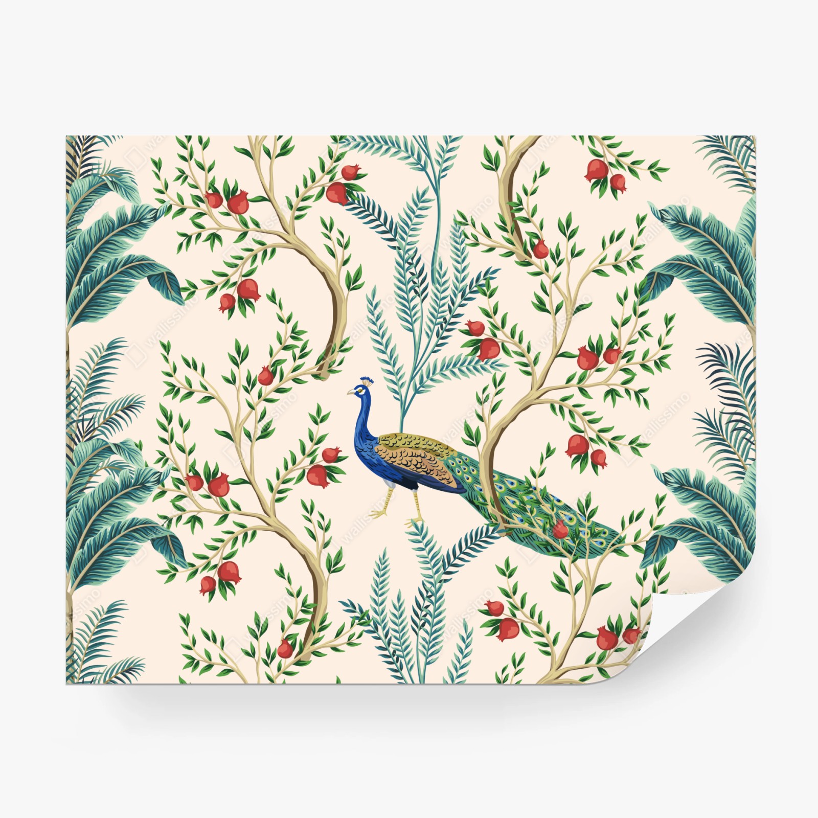 - vintage, ilustracja, botaniczny, wzór, tropikalny, liście, egzotyczny, palma, paw, granat