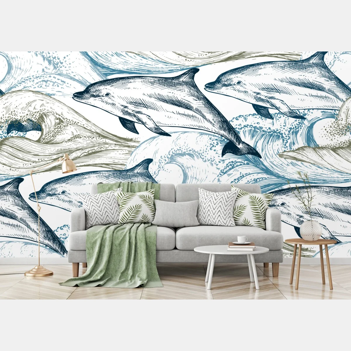 - vintage, ilustracja, wzór, ręcznie rysowane, morze, niebieski, fale, marynistyczny, delfiny, morskie życie