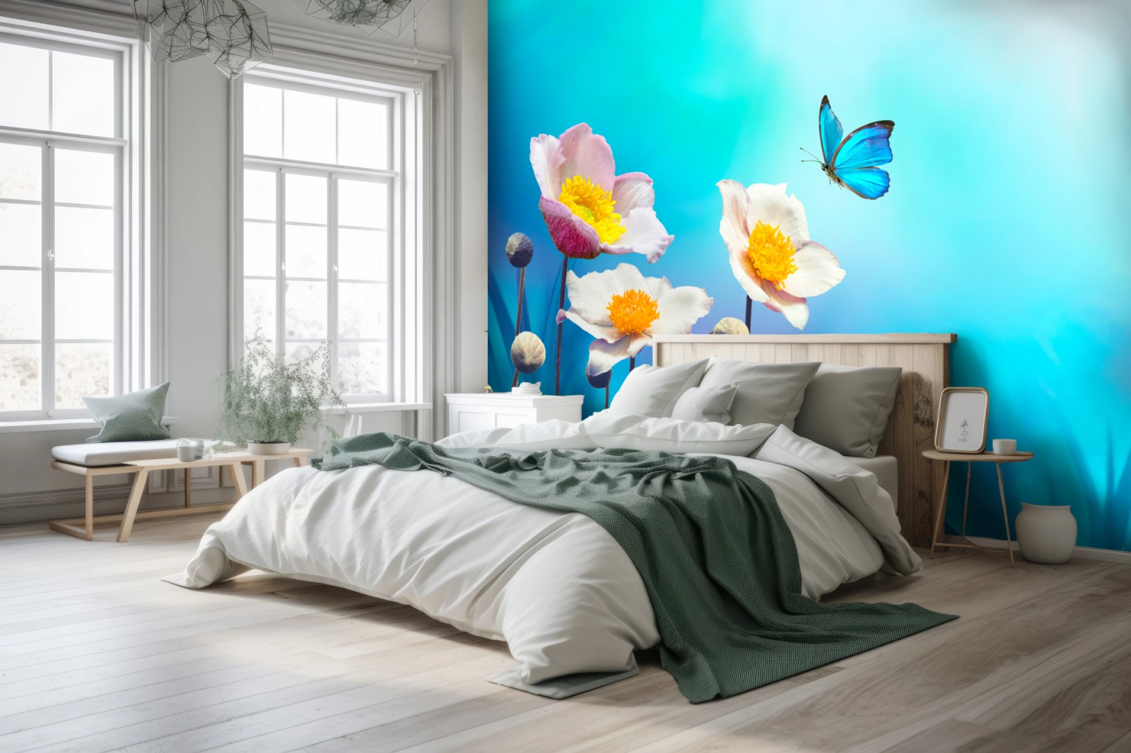 Fototapeta Delikatne różowe anemony i niebieski motyl