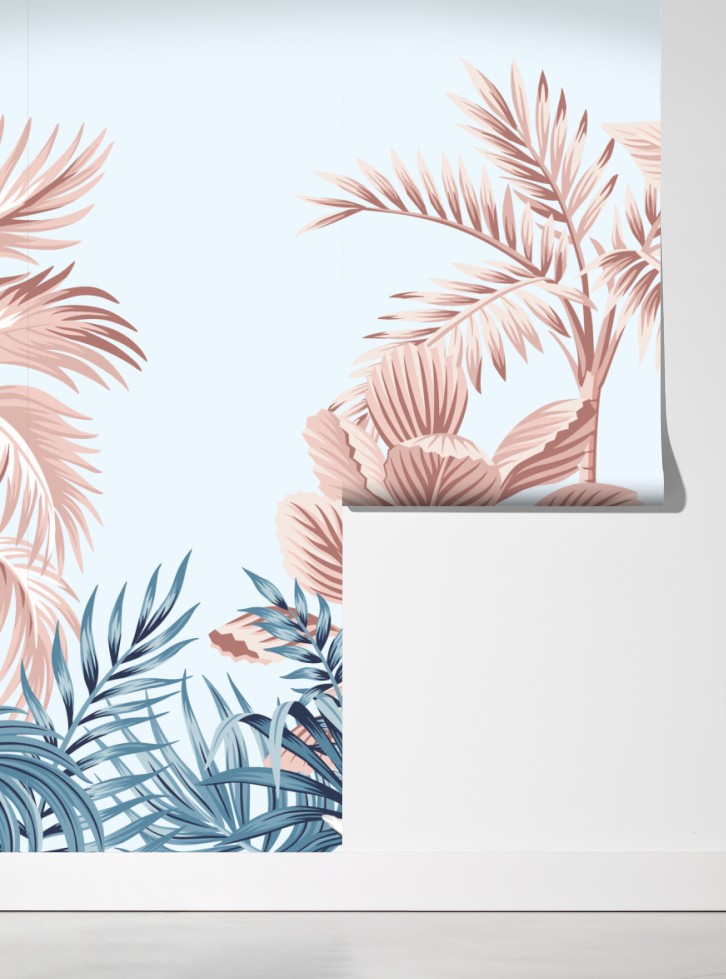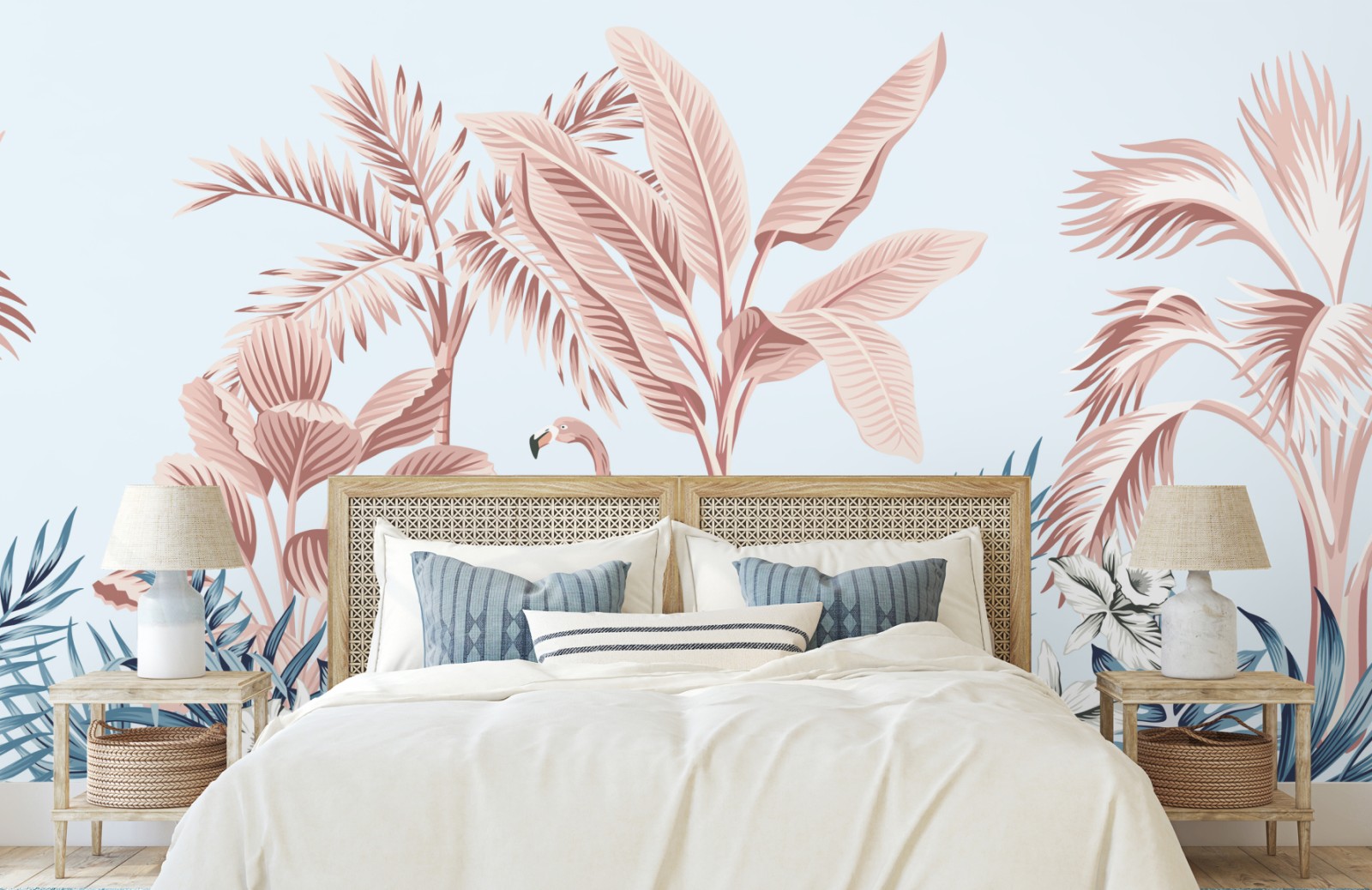 Dodaj spokojny tropikalny akcent do wnętrza dzięki tej pastelowej ilustracji z flamingiem i bujną roślinnością.