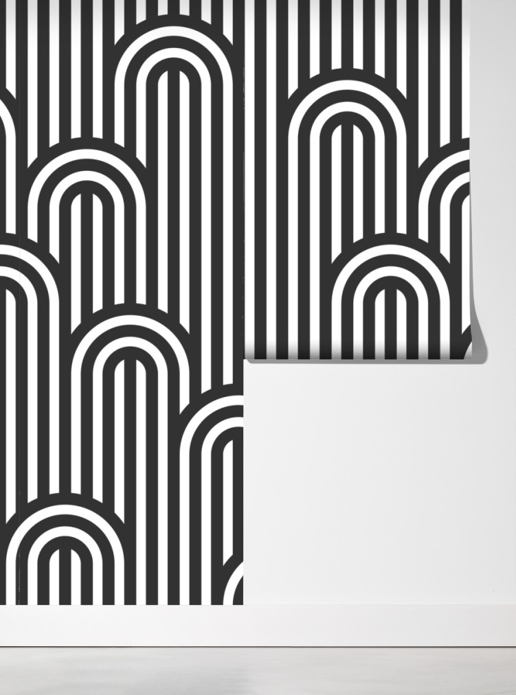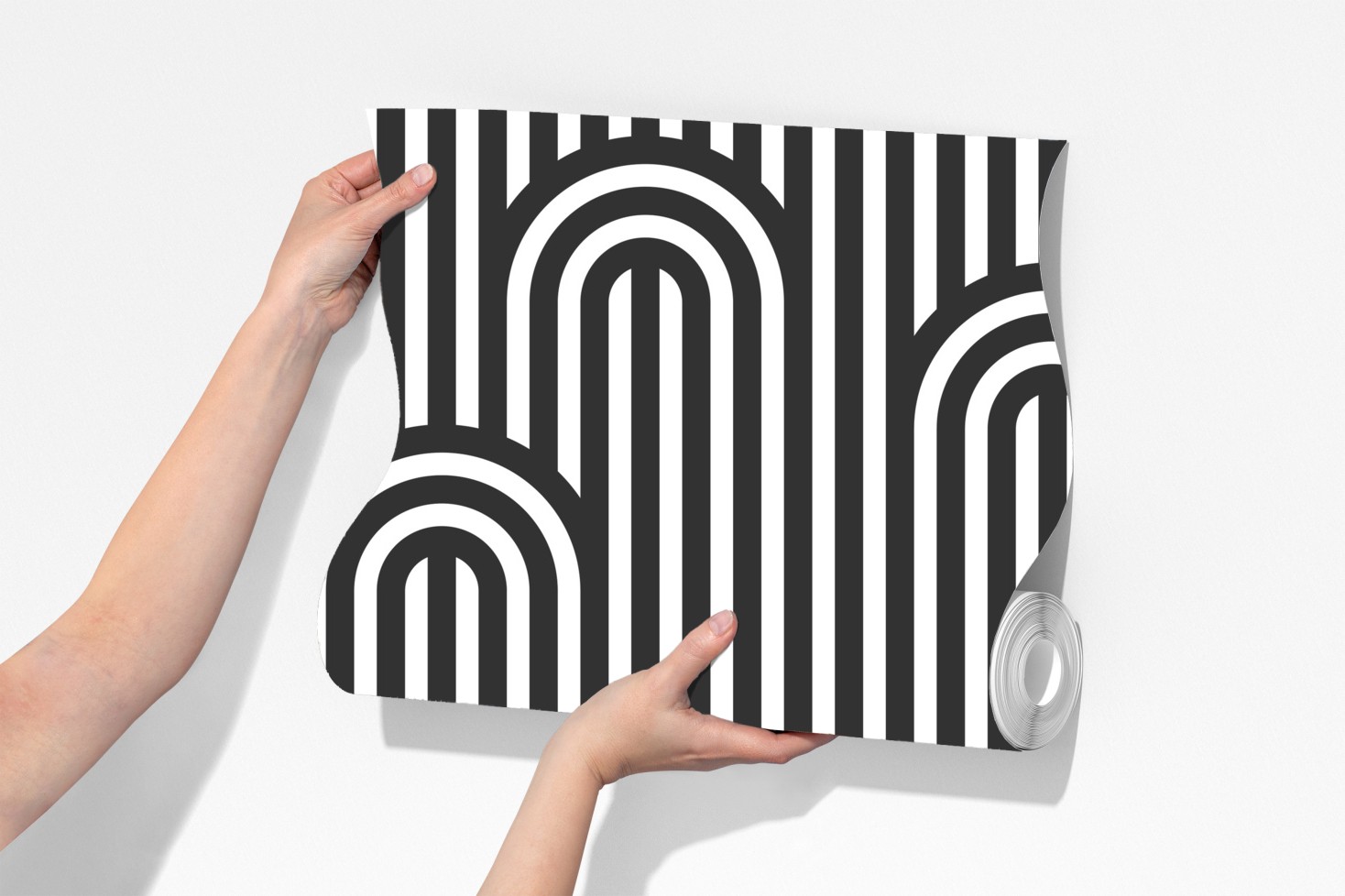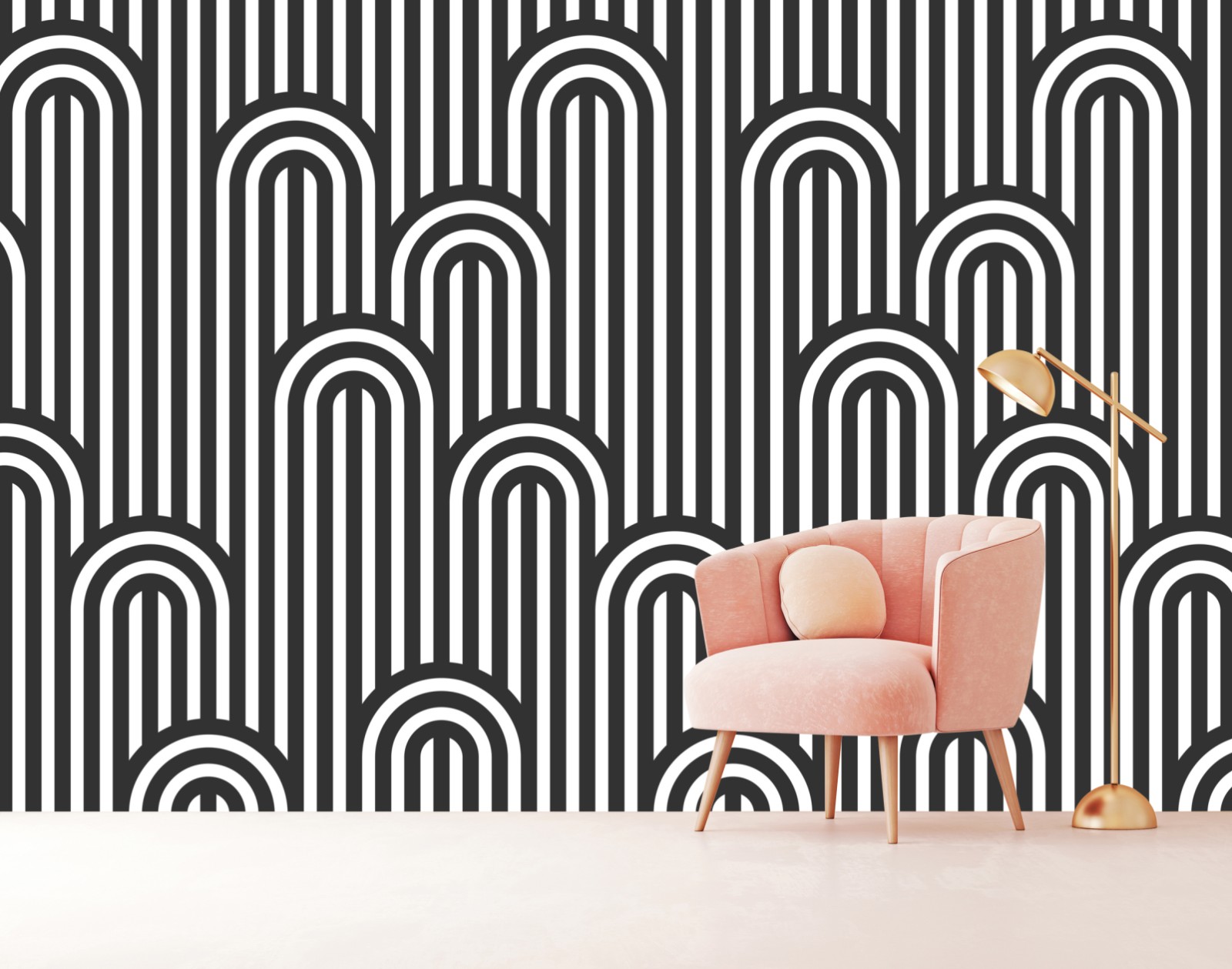 Dodaj śmiałego, nowoczesnego charakteru ścianom dzięki temu czarno-białemu geometrycznemu wzorowi w paski, idealnemu do salonu i biura.