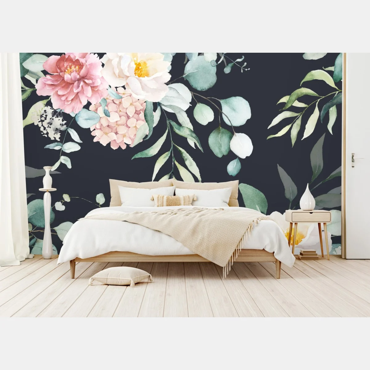 - wzór kwiatowy, botaniczny, tapeta, kwiaty, akwarela, eukaliptus, ciemne tło, romantyczny, piwonie, hortensja