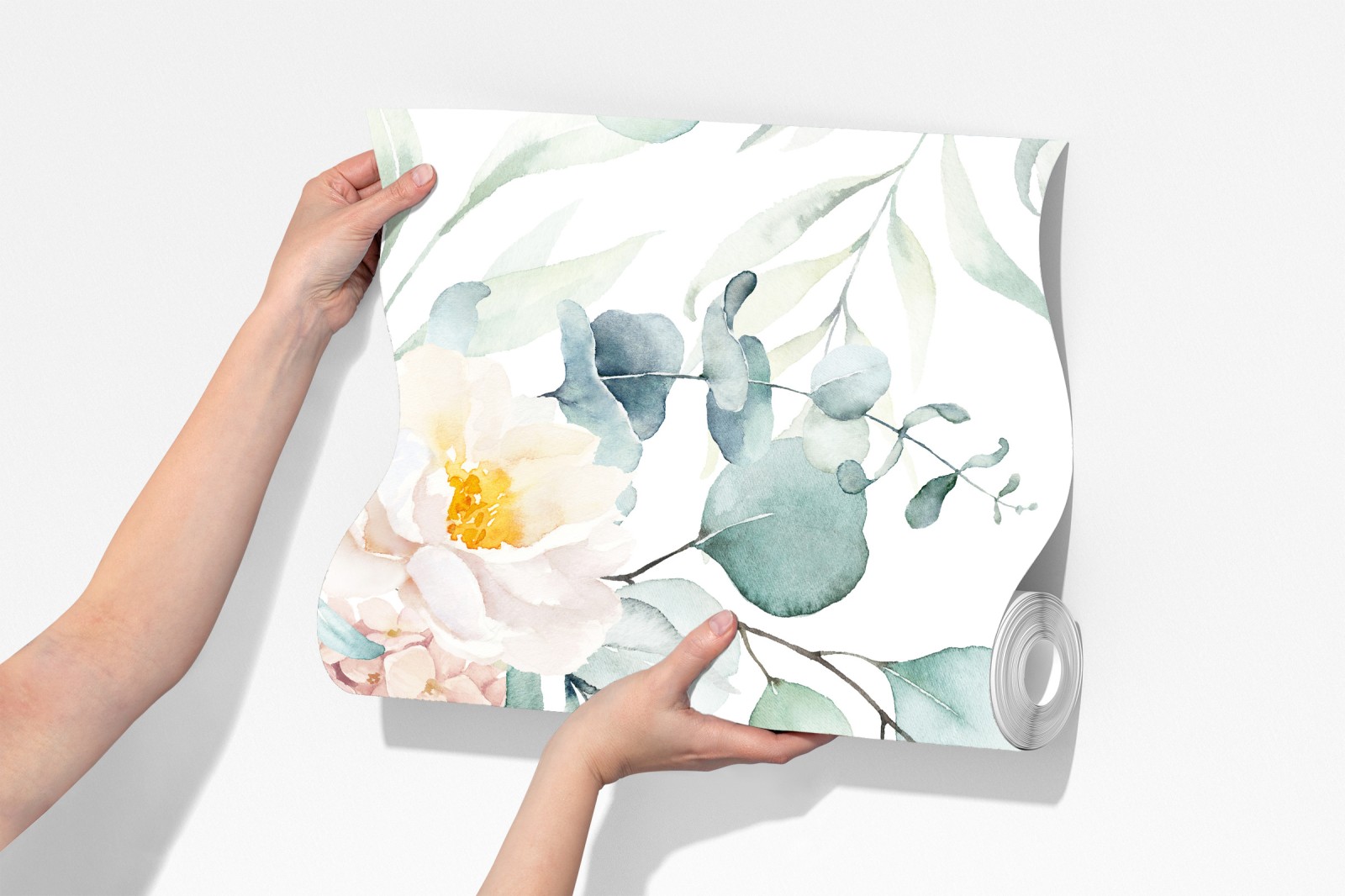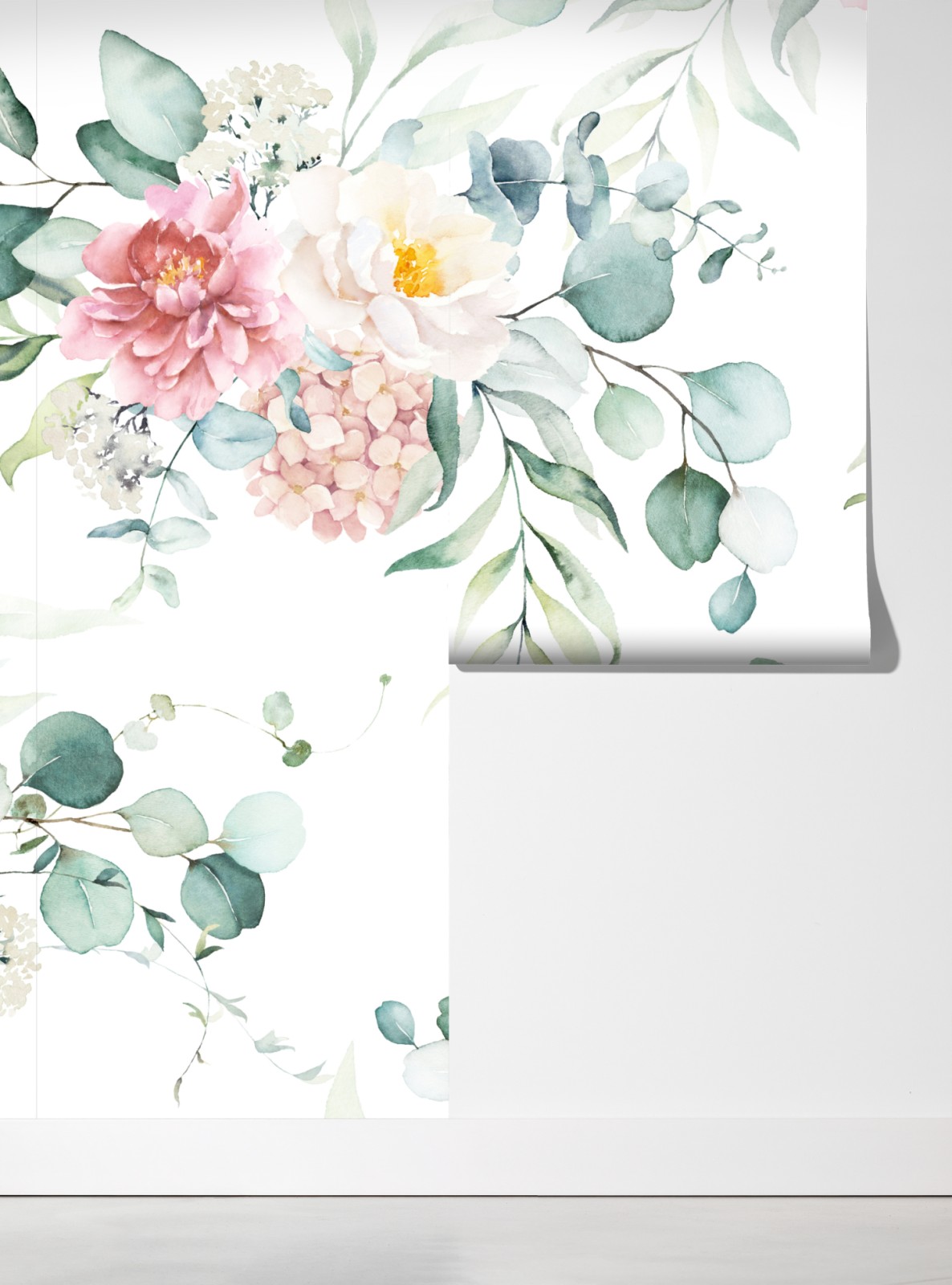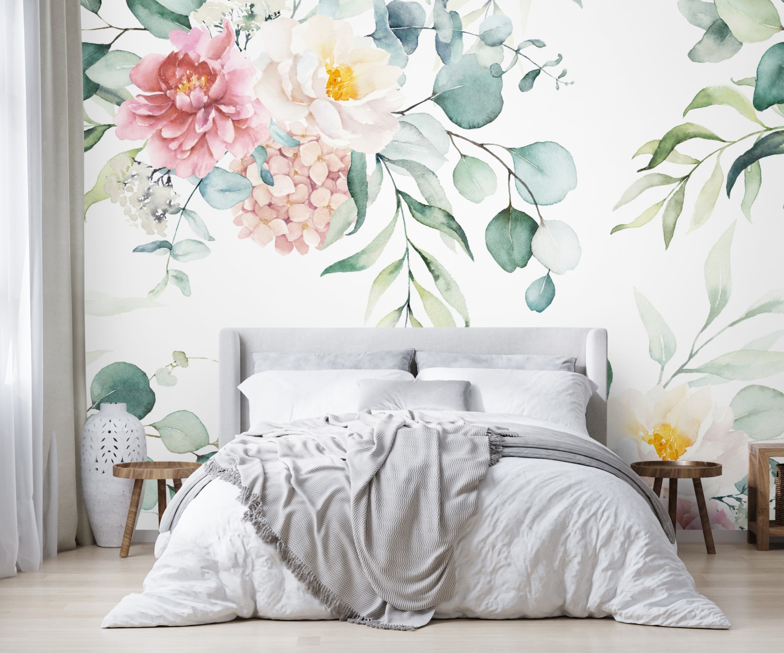 Delikatne akwarelowe kwiaty w subtelnych pastelach wprowadzają do wnętrza spokojny, botaniczny akcent.