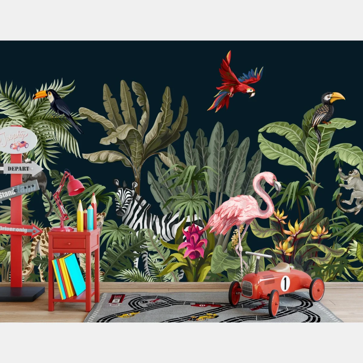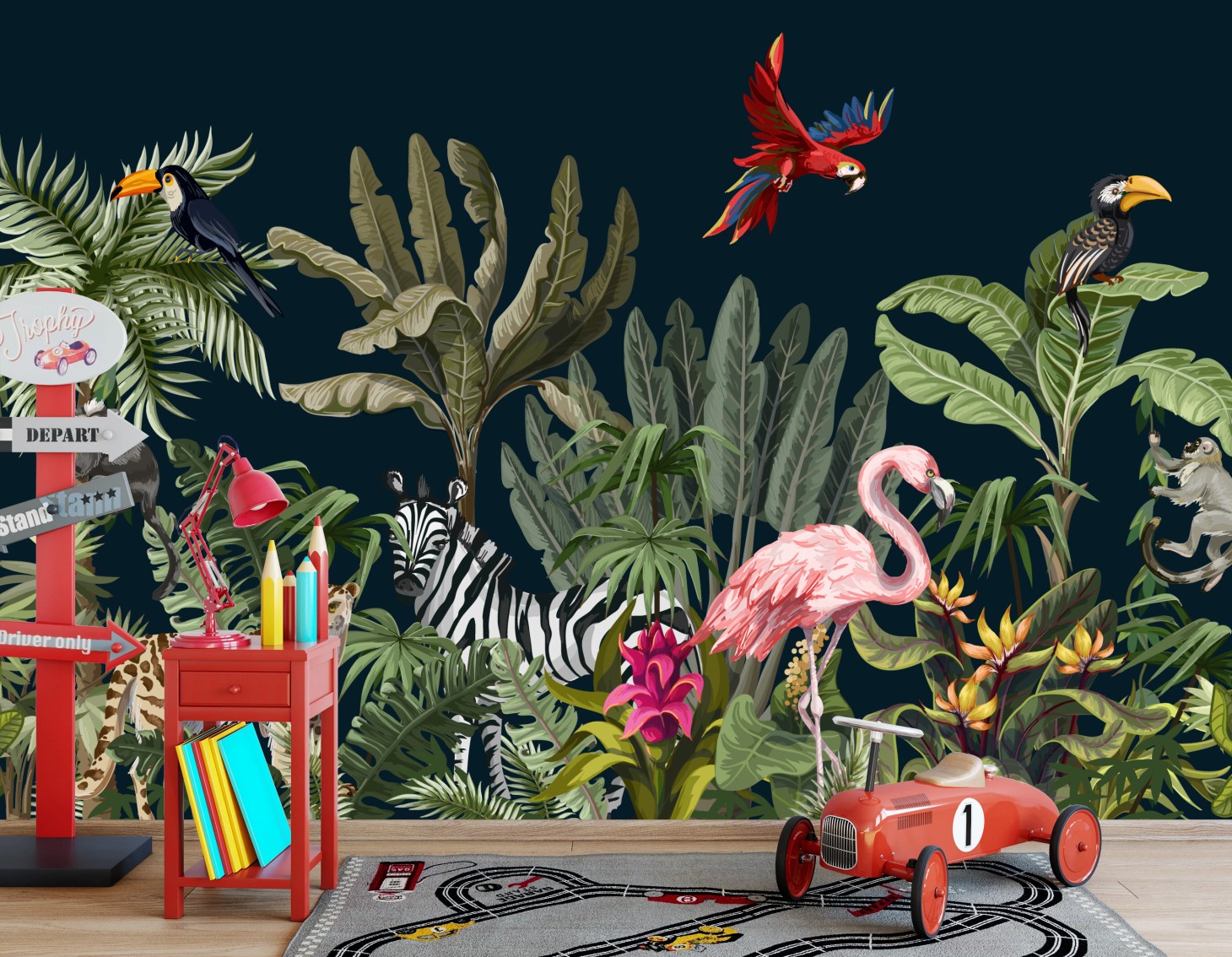 - zebra, dzikie zwierzęta, botaniczny, tropikalny, egzotyczny, dżungla, flaming, tukan, papuga, bananowe liście