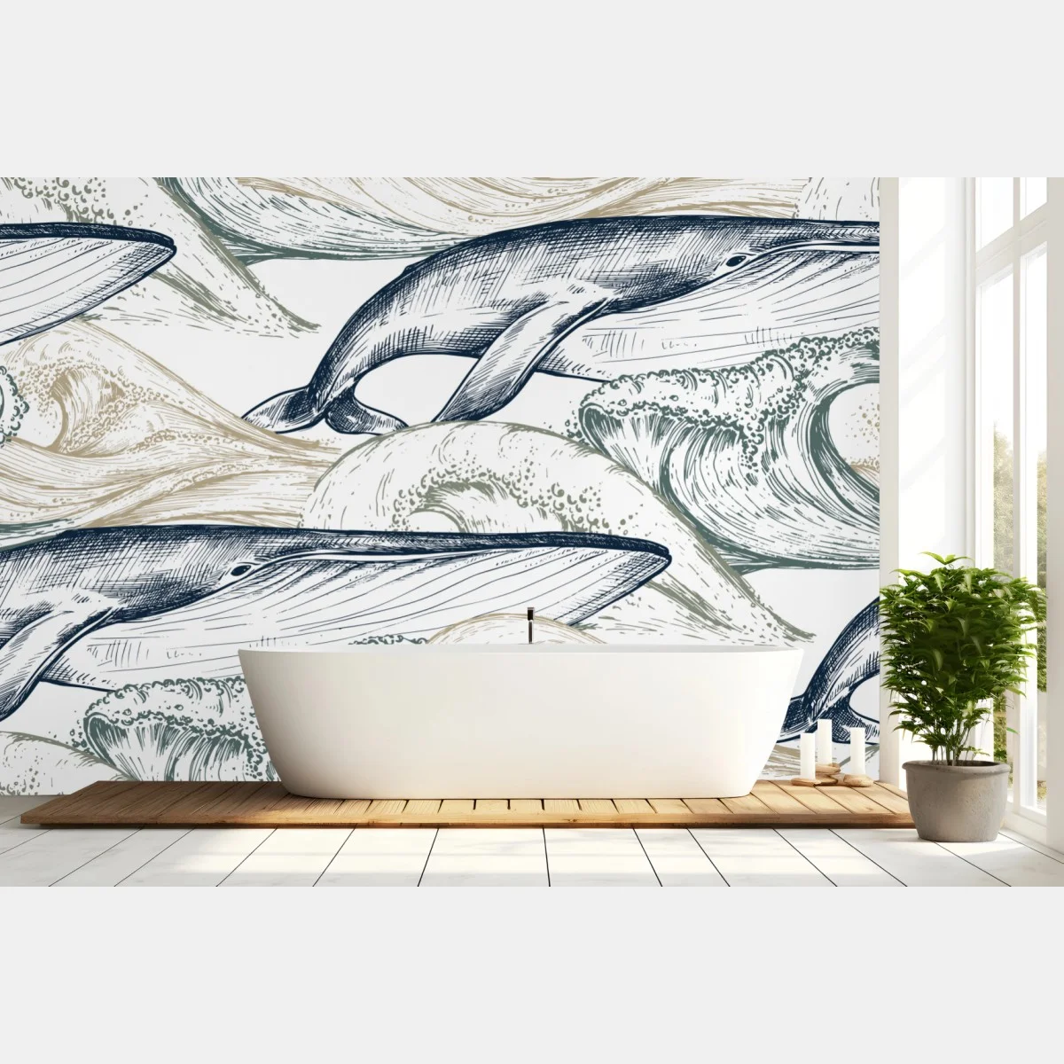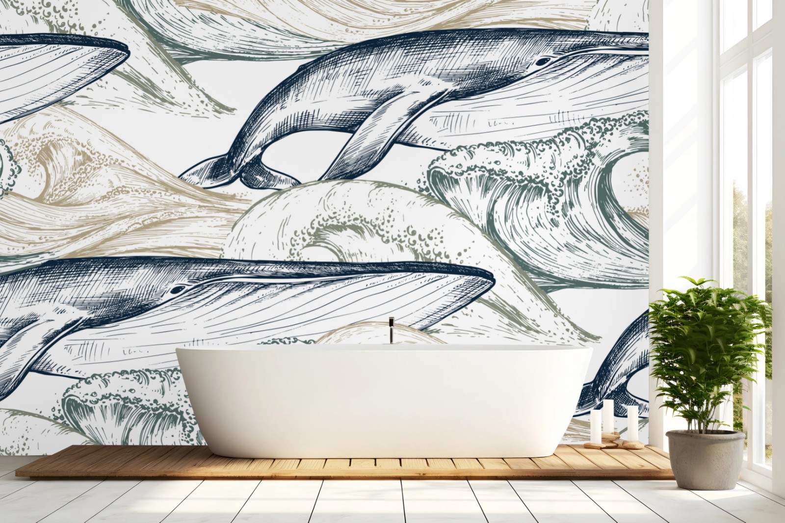 - ocean, ilustracja, wzór, morze, rysunek, fale, morskie, marynistyczny, wieloryby, płetwal
