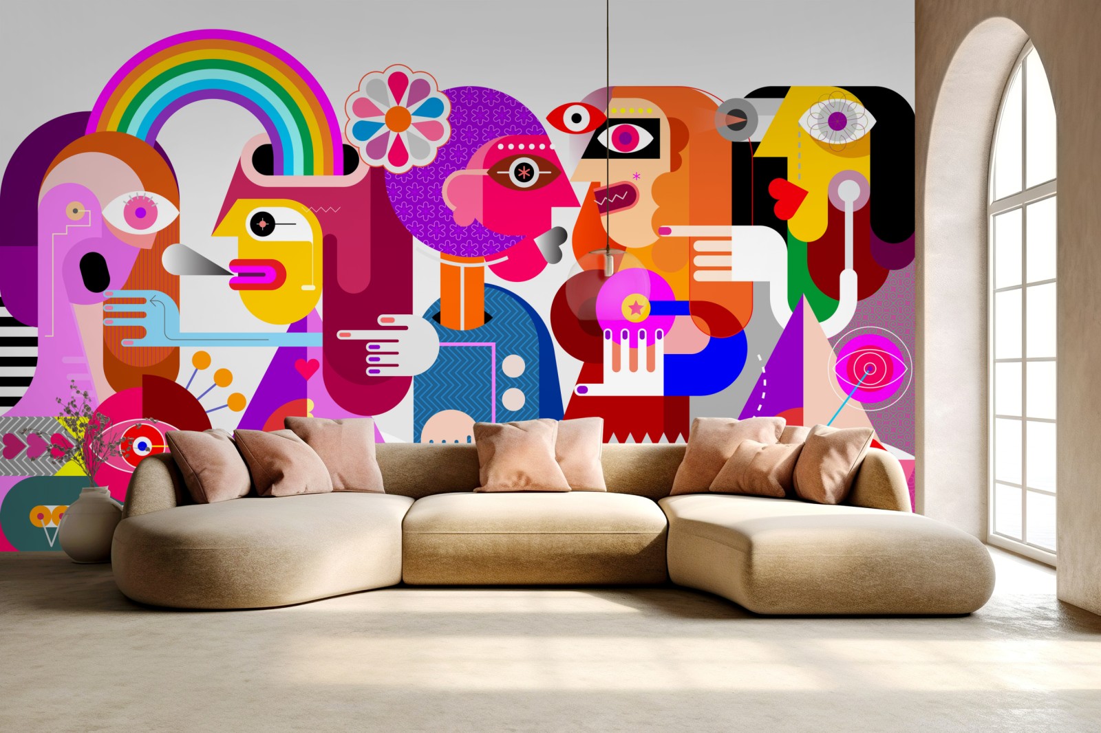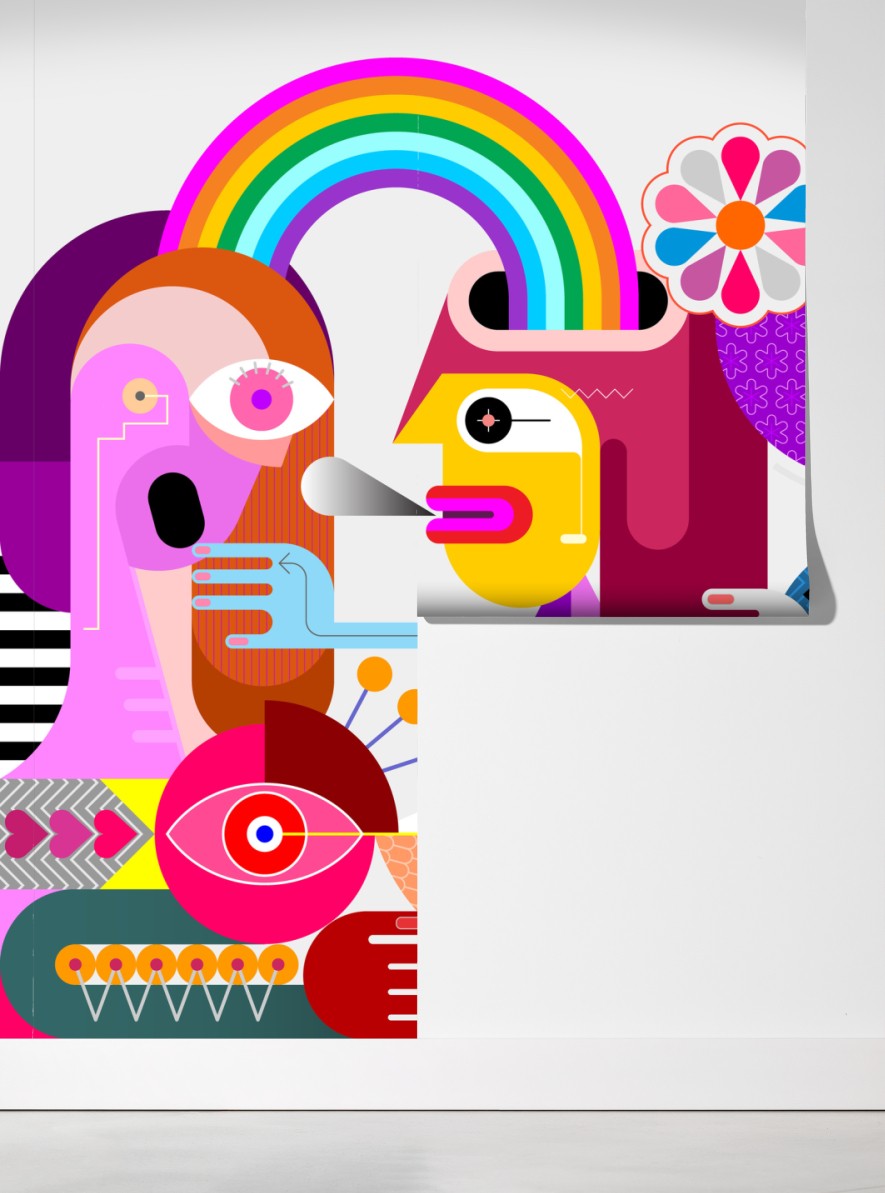 Dodaj odważne kolory i zabawną surrealistyczną estetykę do wnętrza dzięki tej nowoczesnej geometrycznej ilustracji mężczyzny jadącego na ptaku.