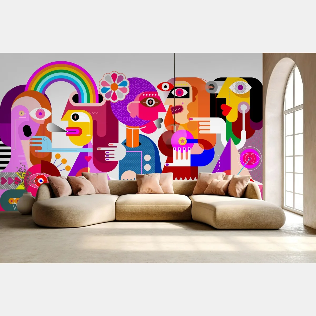 Dodaj odważne kolory i zabawną surrealistyczną estetykę do wnętrza dzięki tej nowoczesnej geometrycznej ilustracji mężczyzny jadącego na ptaku.WięcejMniej