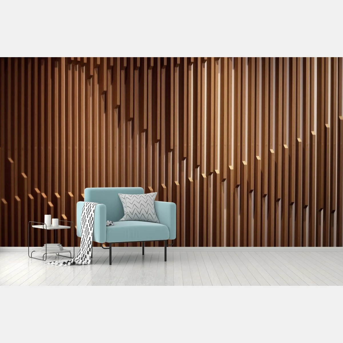 - tekstura, geometryczny wzór, aranżacja wnętrz, styl skandynawski, nowoczesny wystrój, ciepłe tony, drewniane lamele, panel ścienny, pionowe linie, panele akustyczne