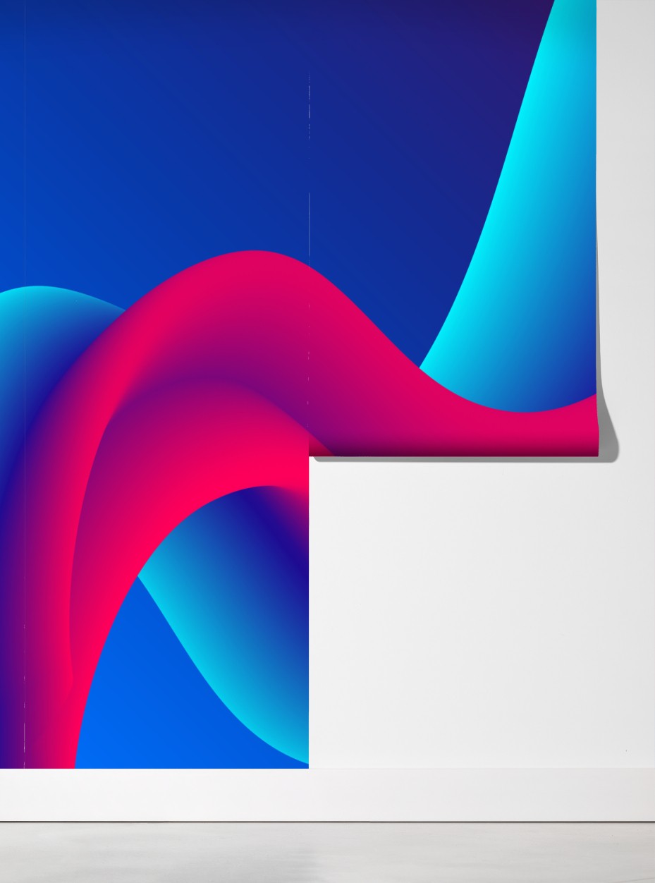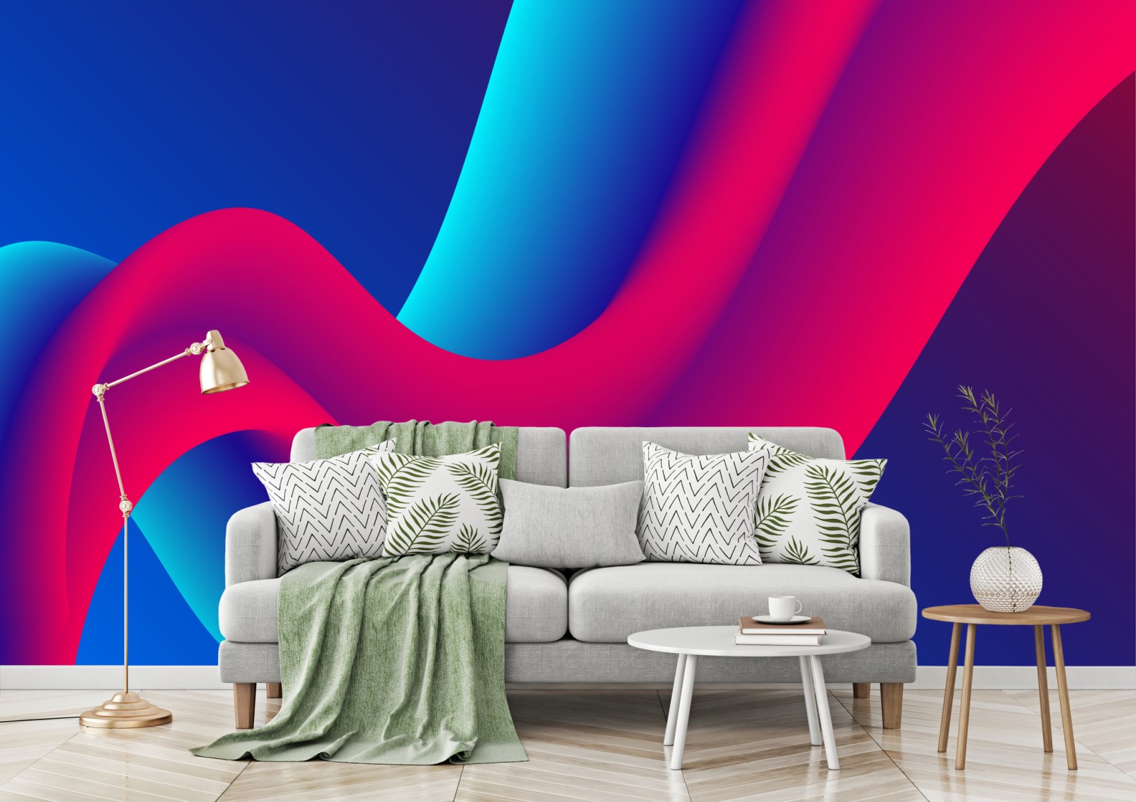 Dodaj energii do wnętrza dzięki żywym falującym gradientom w intensywnych różowo-turkusowych tonach, idealnym do nowoczesnych pomieszczeń.