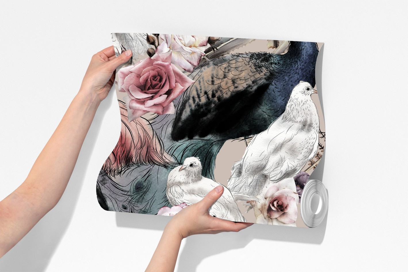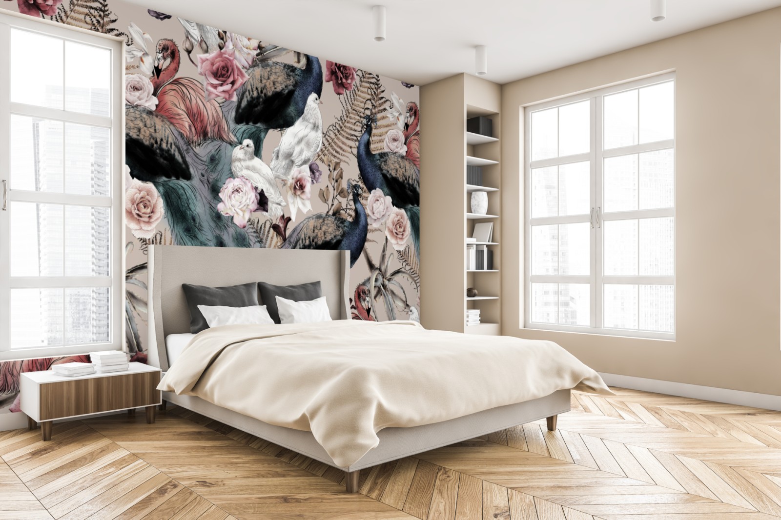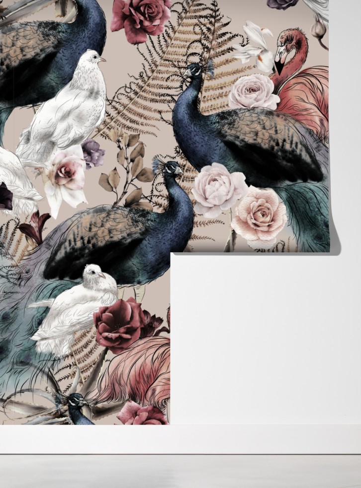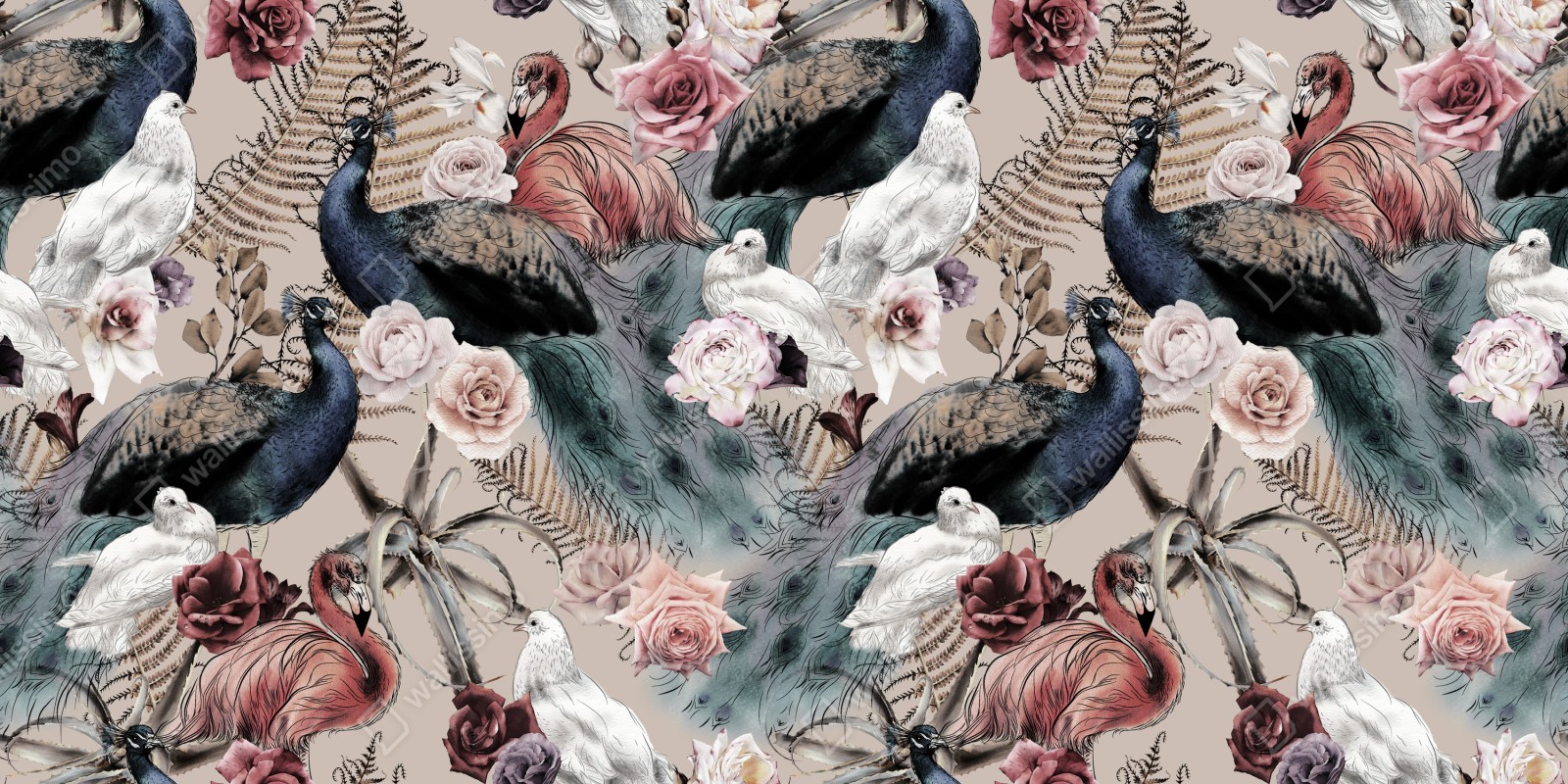 Dodaj ścianom ponadczasowej elegancji dzięki akwarelowemu wzorowi z pawiem, flamingiem i różami, który wnosi subtelne kolory i urok do każdego wnętrza.