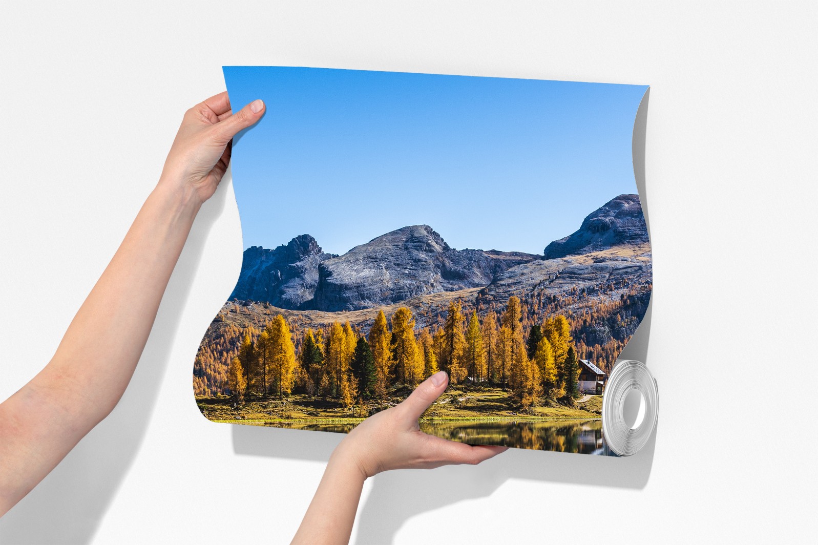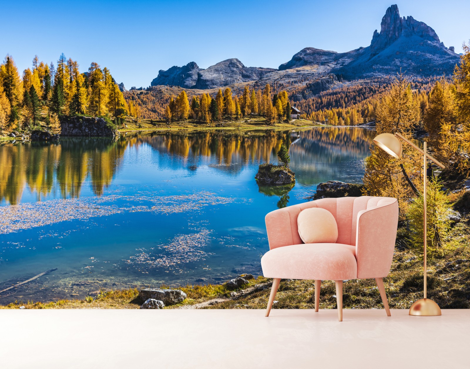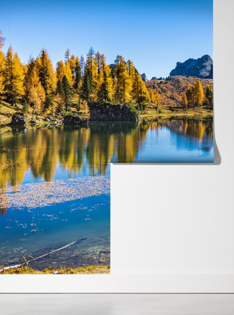 Odkryj spokój alpejskiej scenerii z jesiennymi barwami odbijającymi się w krystalicznie czystym jeziorze.
