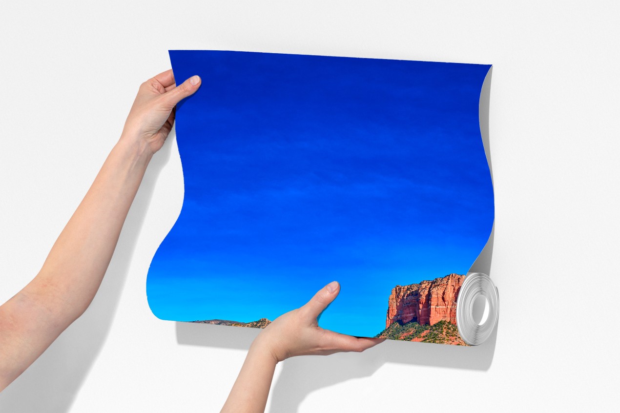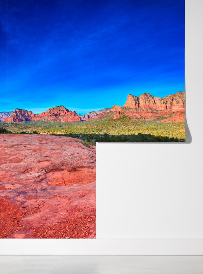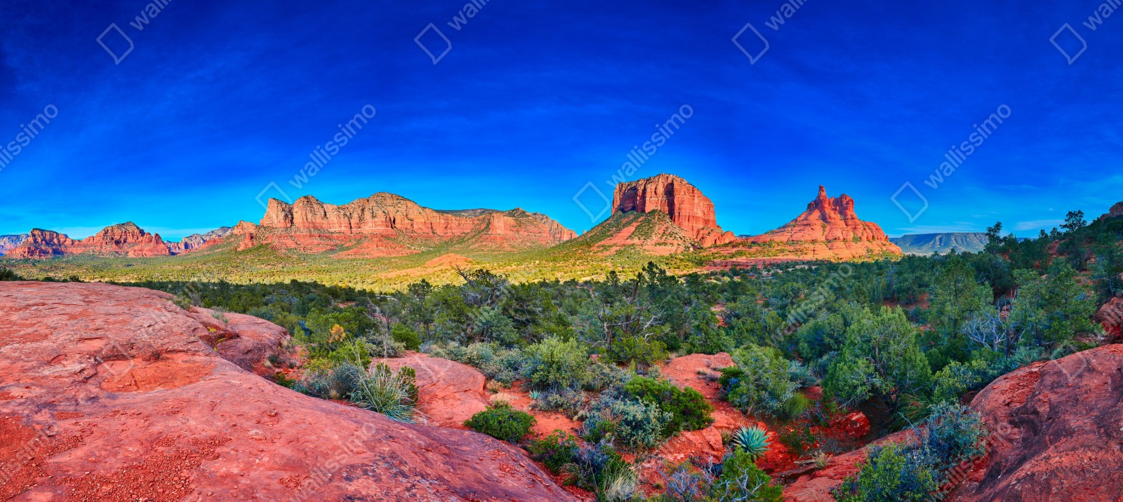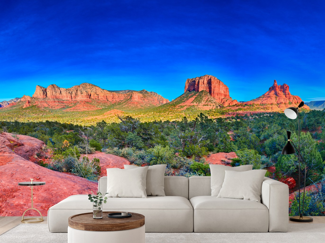 Wprowadź dramatyczne kolory czerwonych skał Sedony do wnętrza dzięki tej panoramicznej grafice ukazującej Bell Rock i Courthouse Butte pod intensywnym niebem.