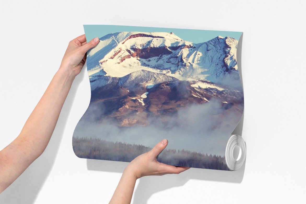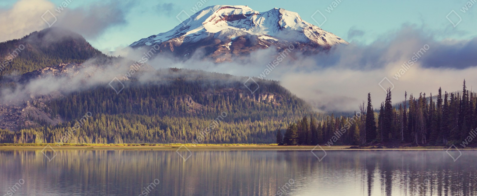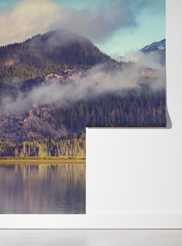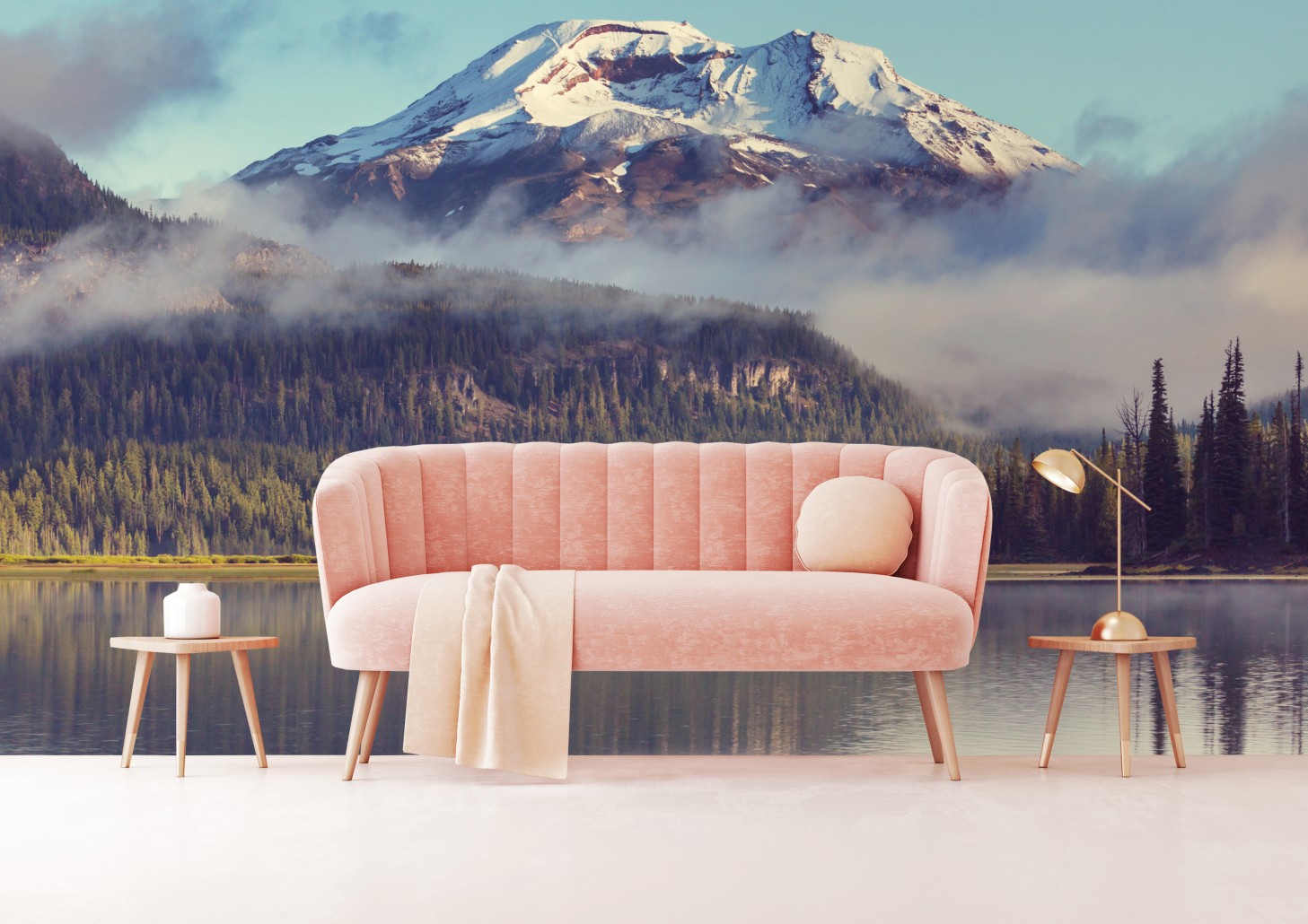 Wprowadź spokój i naturalne piękno do wnętrza dzięki scenie z jeziorem i ośnieżonym szczytem o porannej mgle.