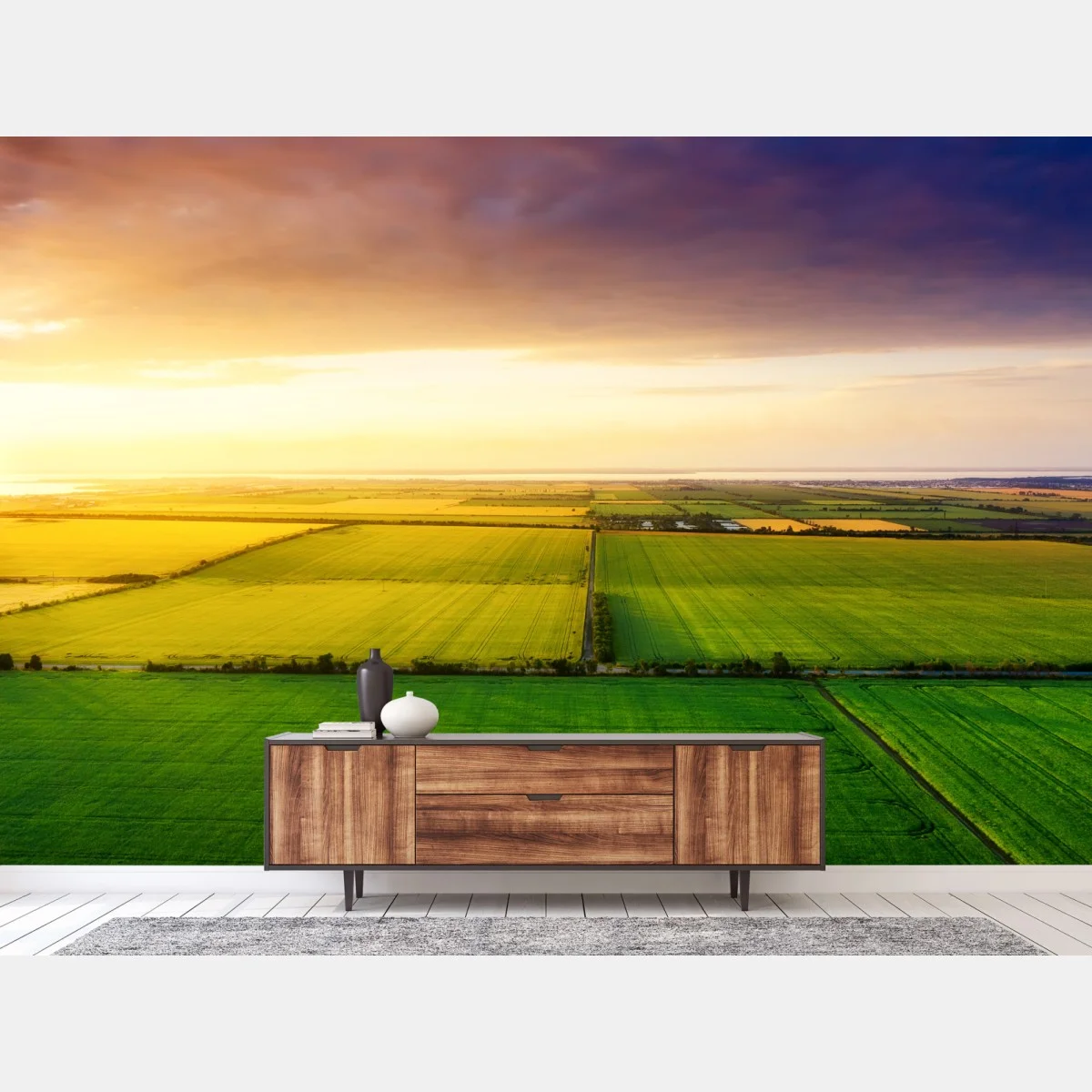 - panorama, krajobraz, wieś, zachód słońca, horyzont, widok z lotu ptaka, pola, dron, zielone pola, rolnictwo