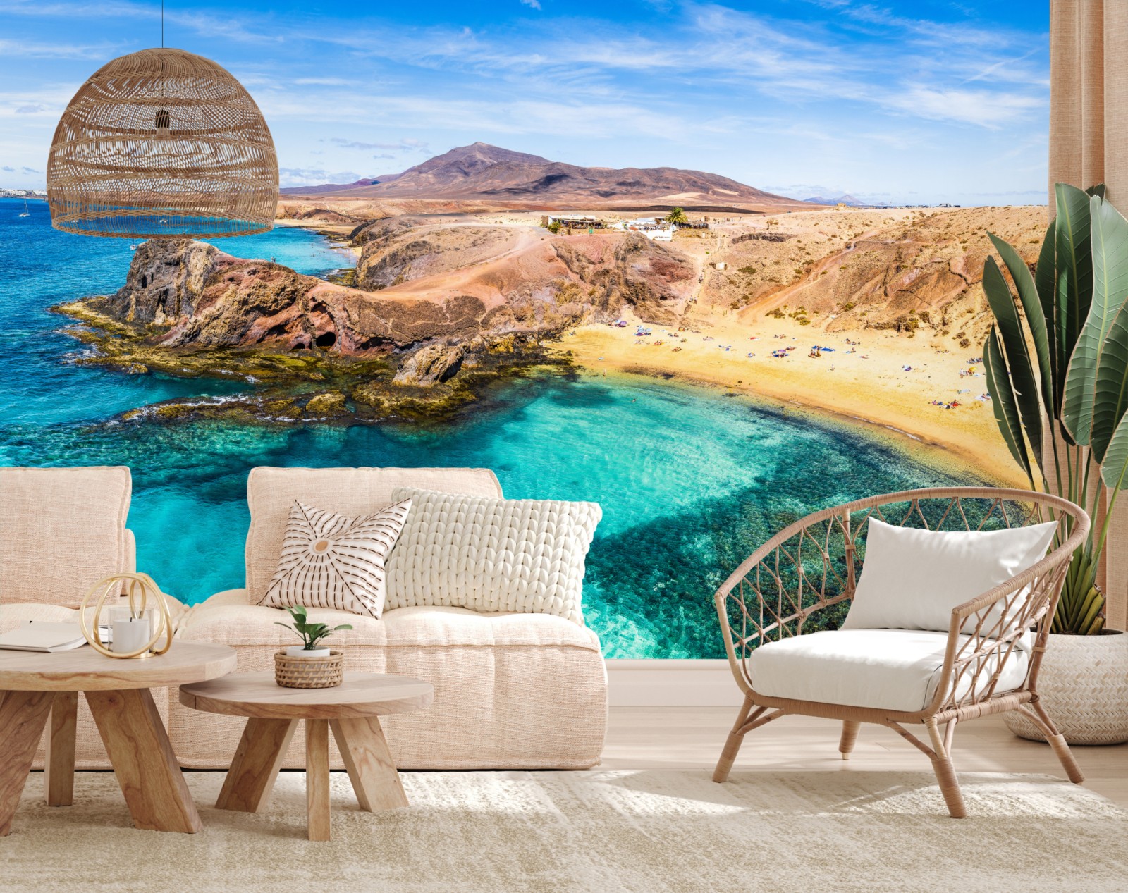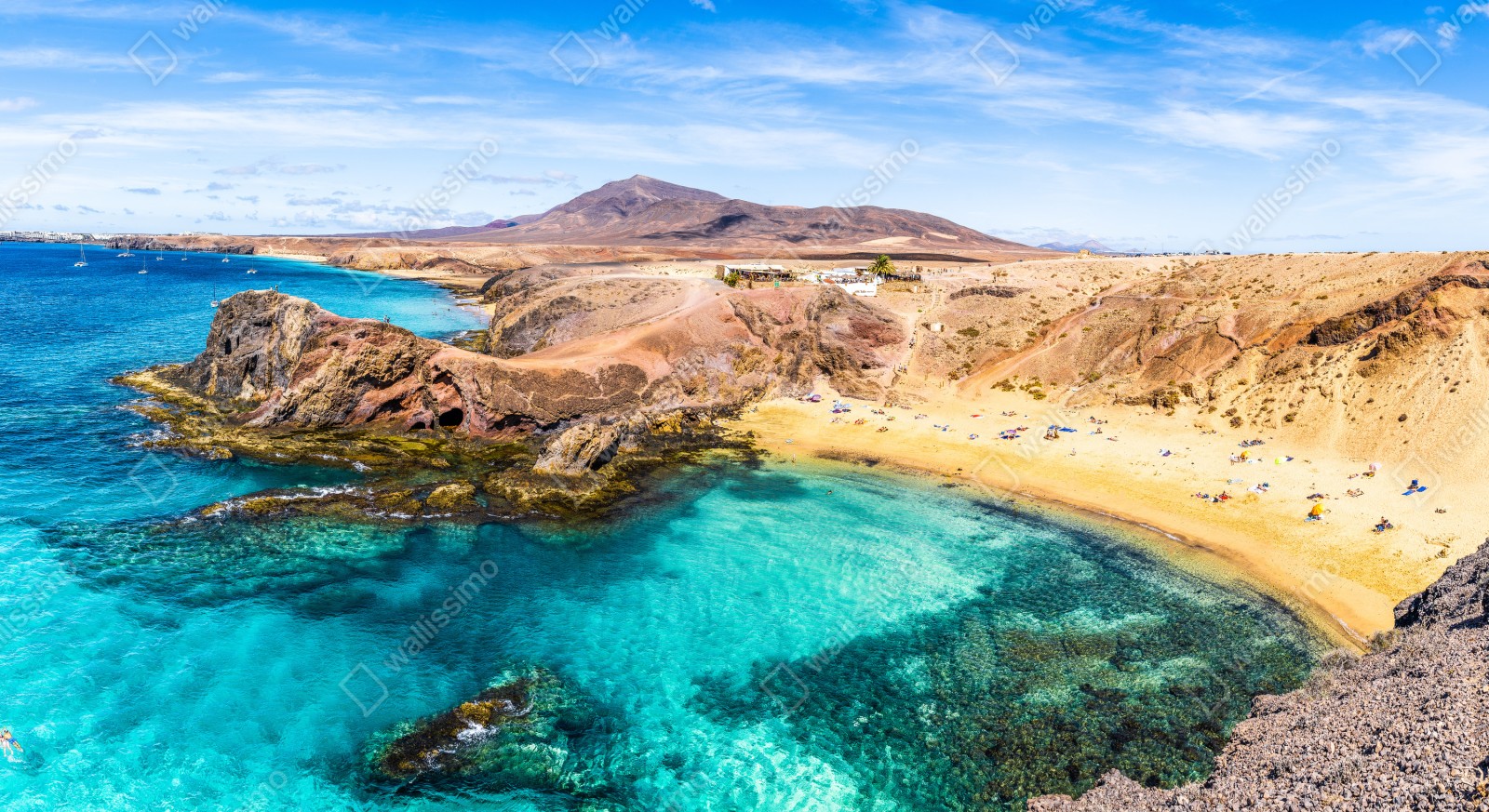Poczuj spokój turkusowych wód i złotych piasków plaży Papagayo na panoramicznym ujęciu.