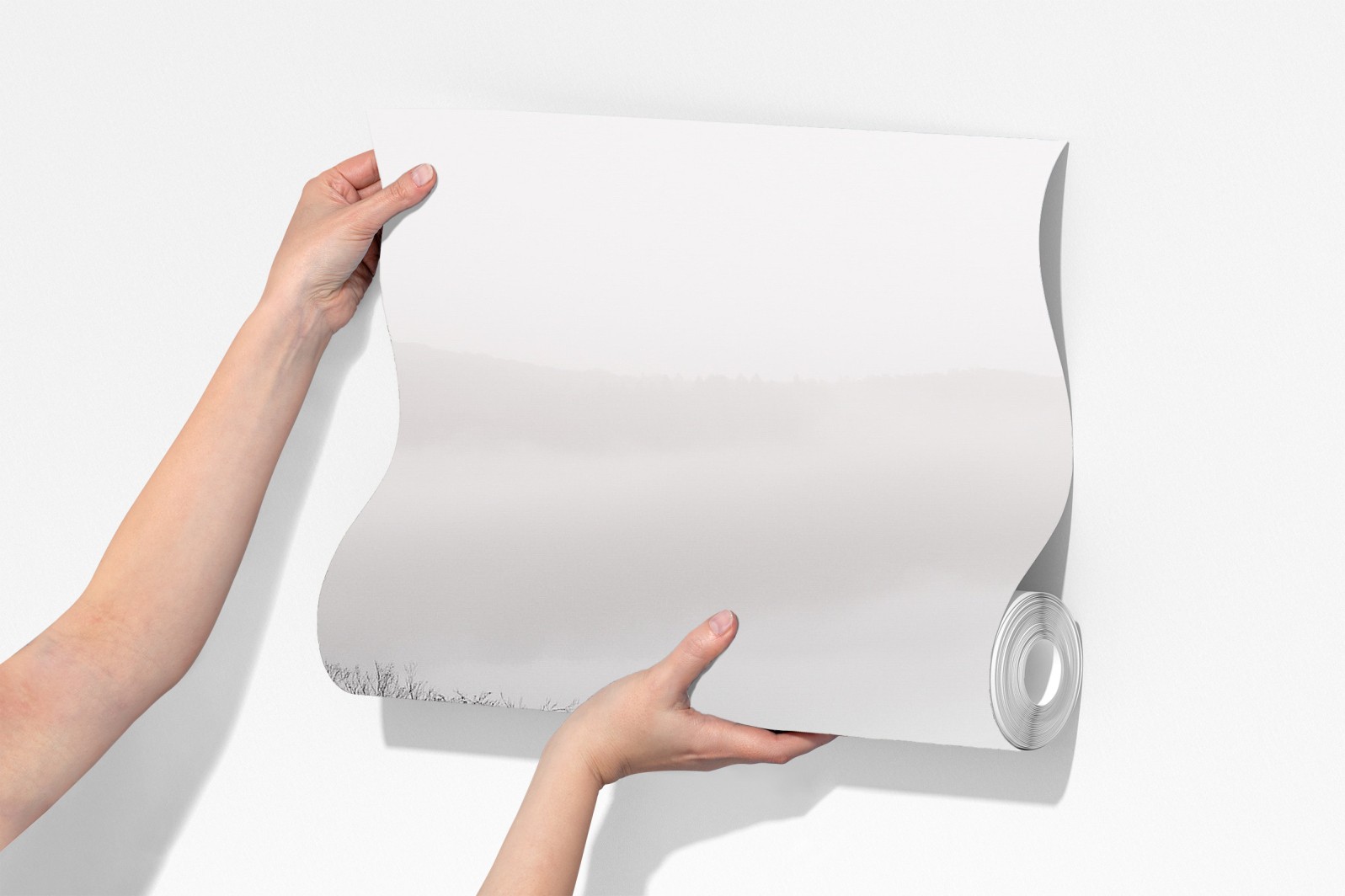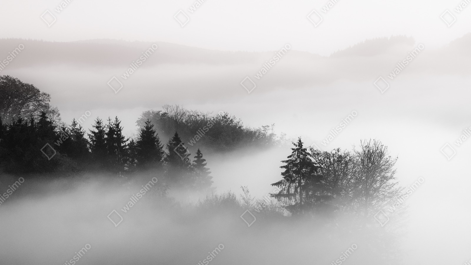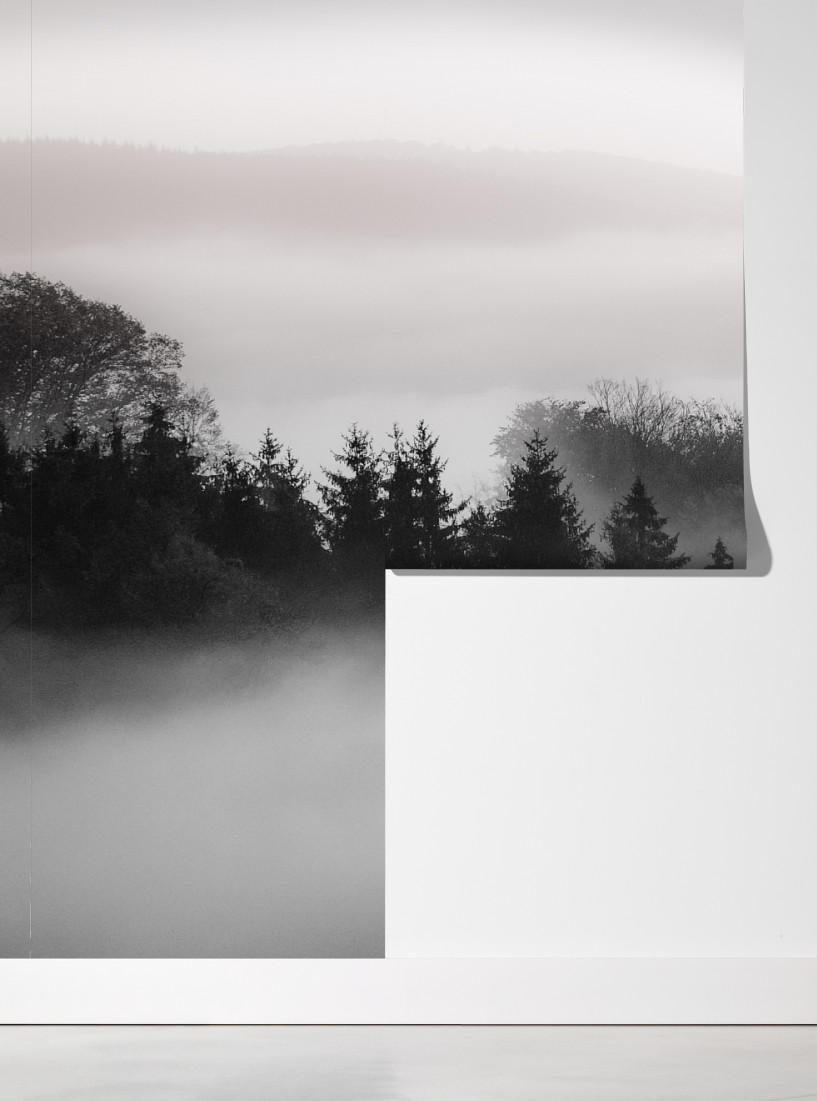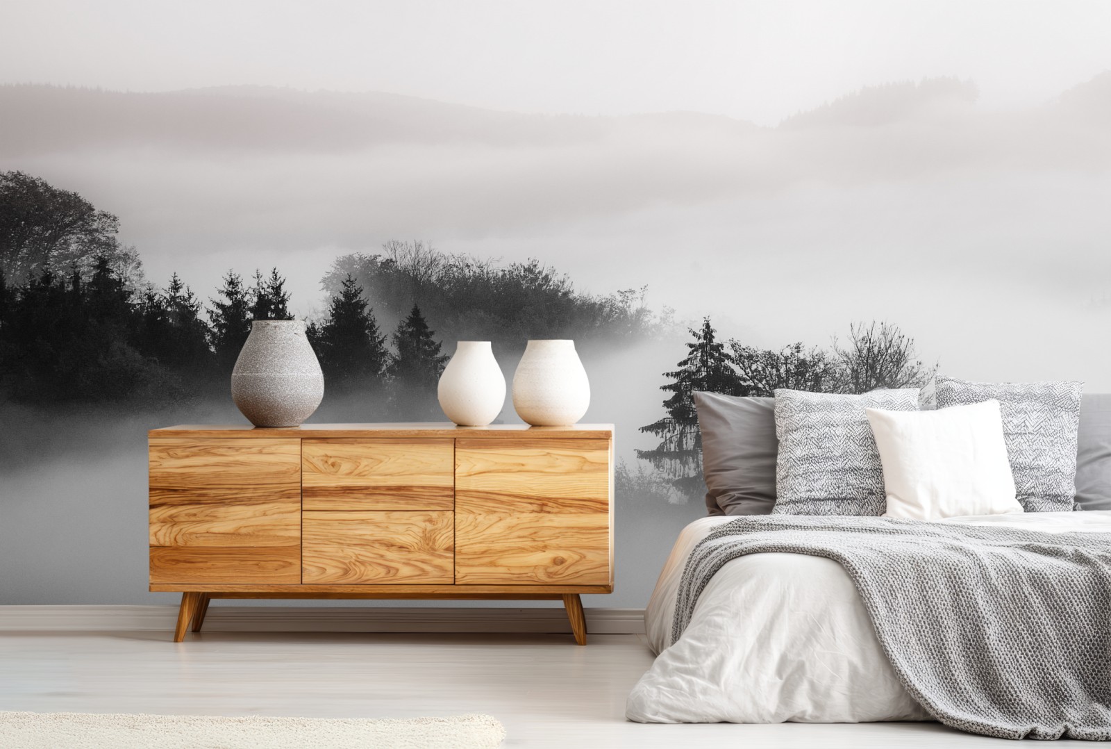 Odkryj spokojną urodę lasu spowitego mgłą w ponadczasowej, czarno-białej estetyce idealnej do wnętrz.