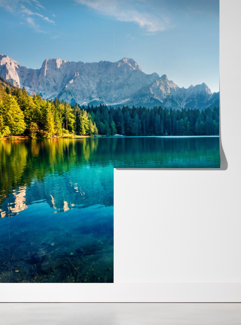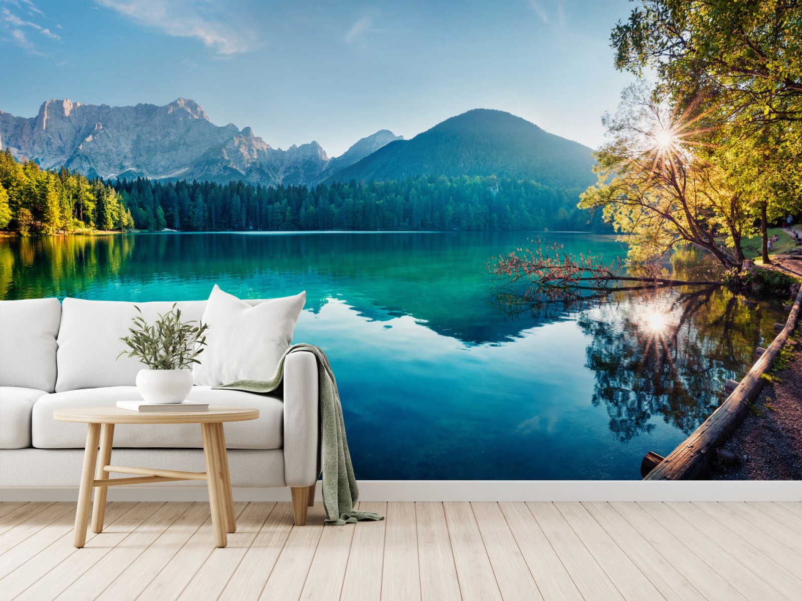 Poczuj spokój jeziora Fusine o wschodzie słońca z turkusową wodą, górskimi odbiciami i słonecznym lasem jako dekoracją ścienną.