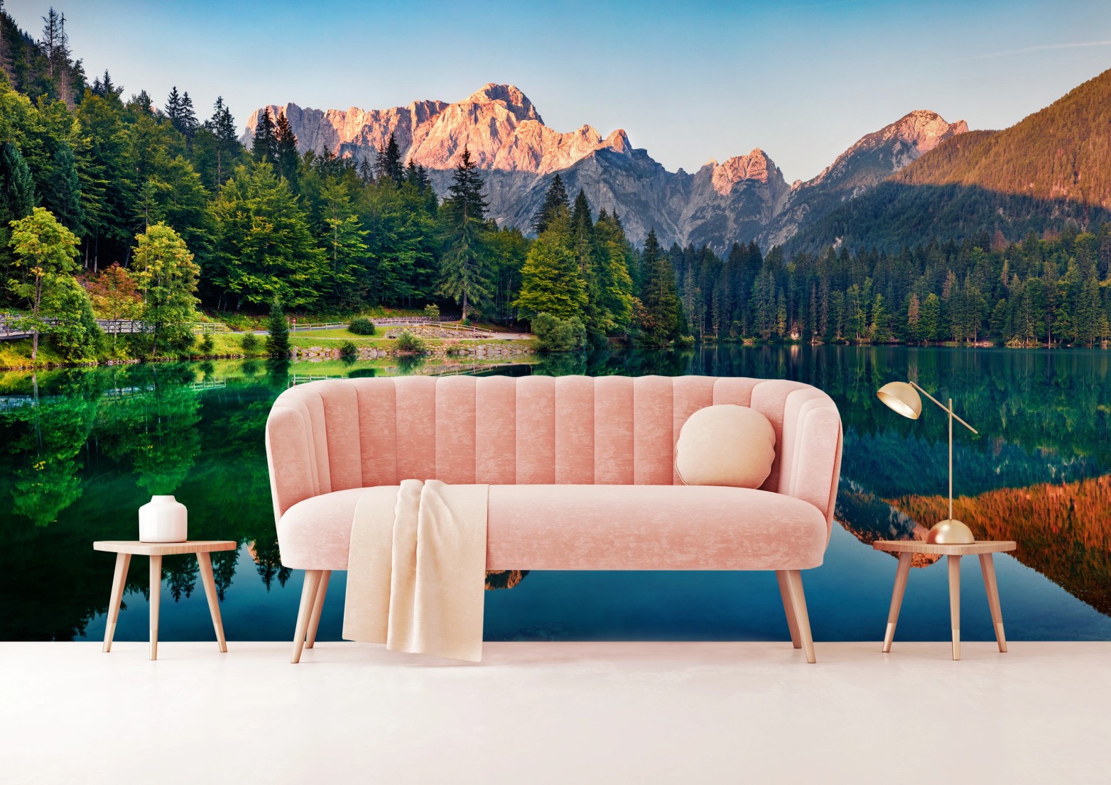 Fototapeta Spokojny poranek nad jeziorem Fusine, Alpy Julijskie