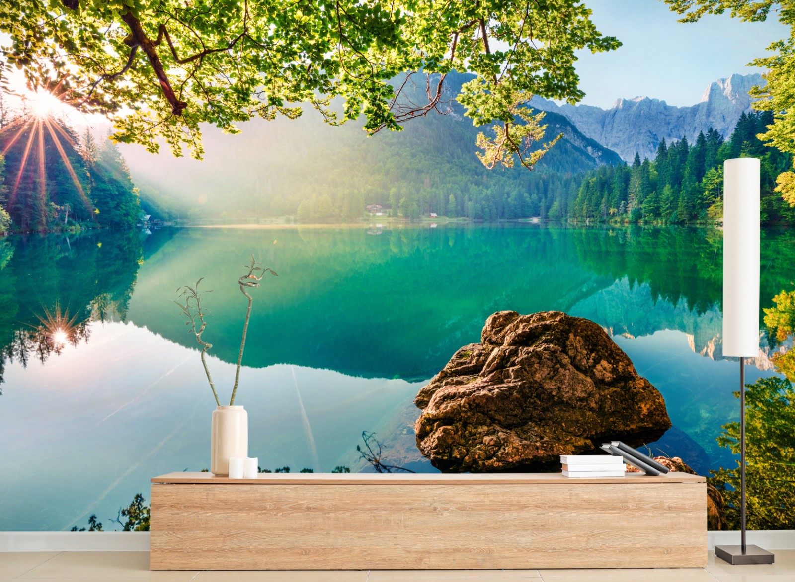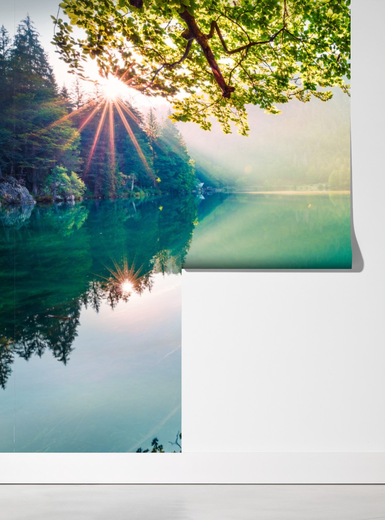 Wprowadź do wnętrza spokój górskich odbić dzięki temu żywemu widokowi na Jezioro Fusine i szczyt Mangart o wschodzie słońca.