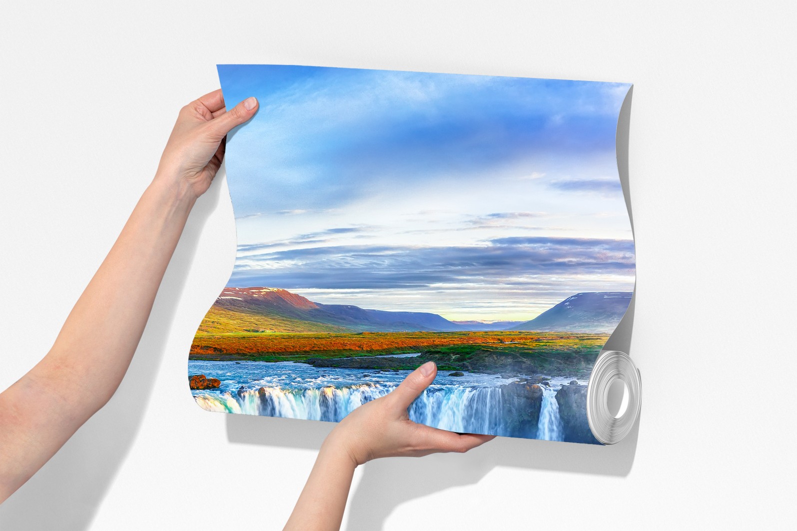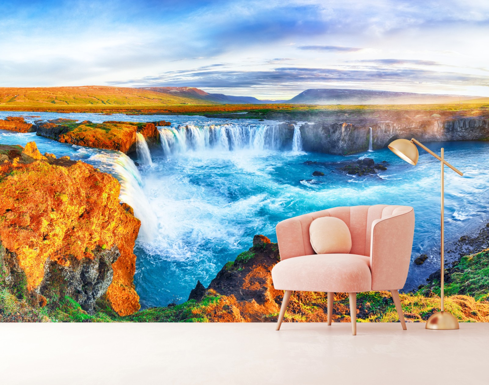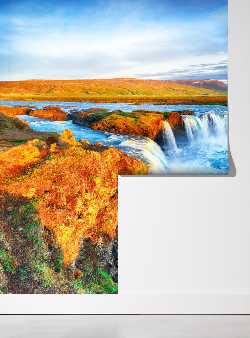 Poczuj surowe piękno wodospadu Godafoss dzięki tej żywej panoramicznej scenie, która wnosi dramatyczne niebo i turkusowe wody do każdego wnętrza.