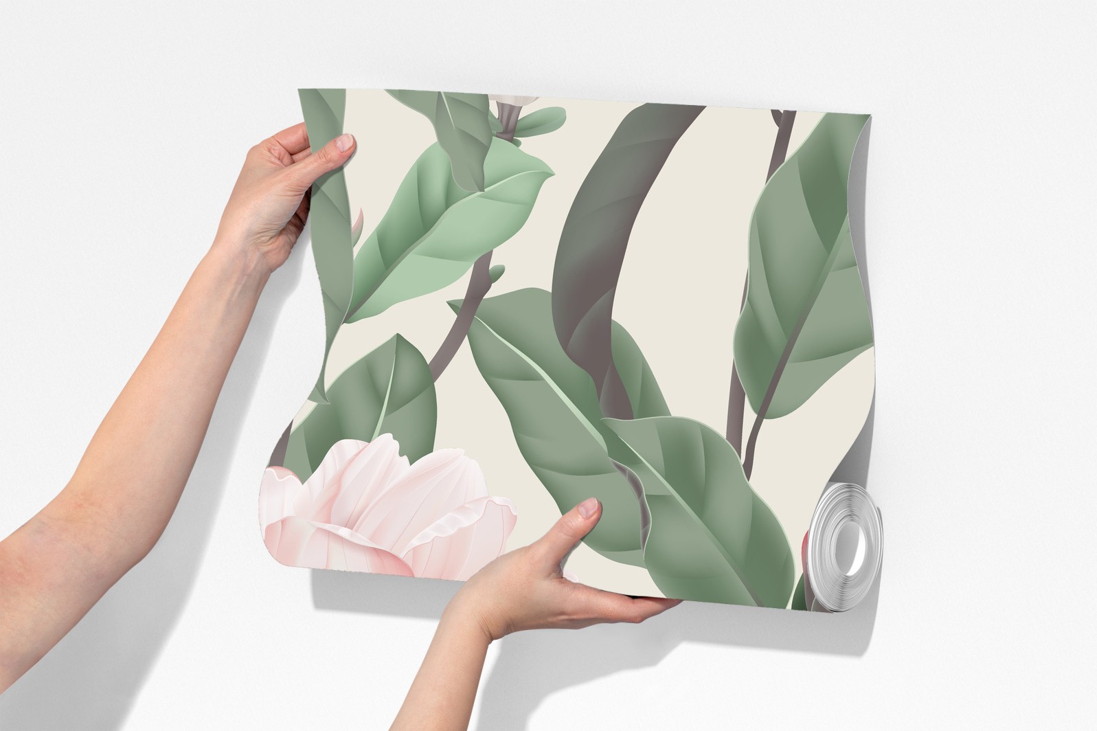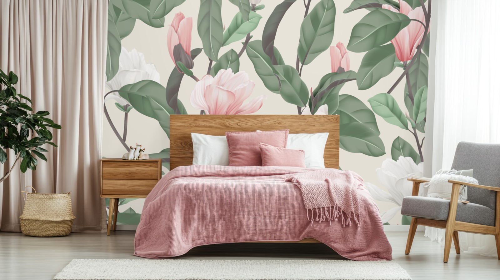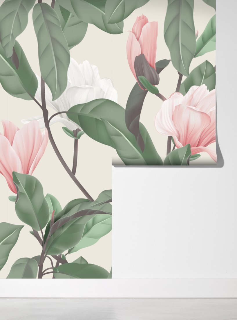 Wprowadź delikatny vintage urok do wnętrza dzięki pastelowemu wzorowi z magnoliami, z różowymi i białymi kwiatami oraz zielonymi liśćmi.