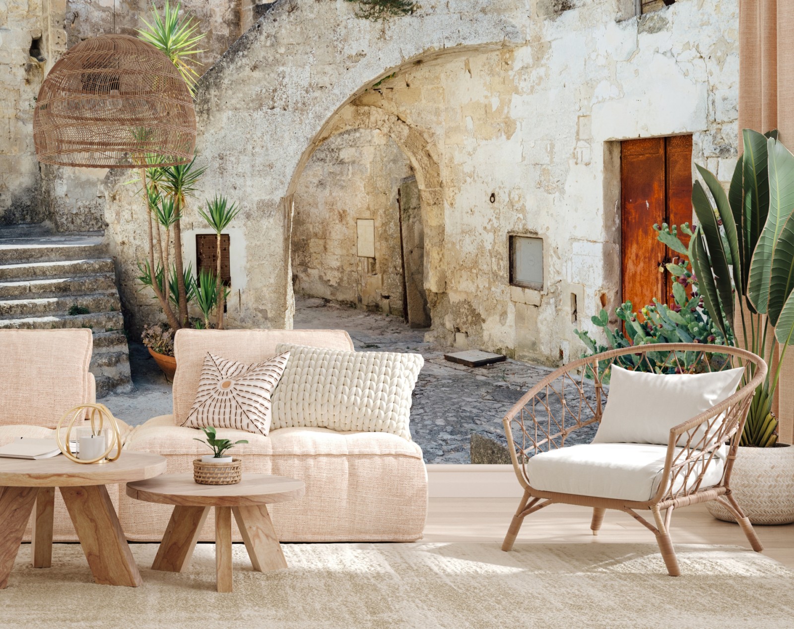 Wprowadź do wnętrza sielski klimat dzięki słonecznemu, kamiennemu dziedzińcowi z łukiem i roślinnością w donicach.