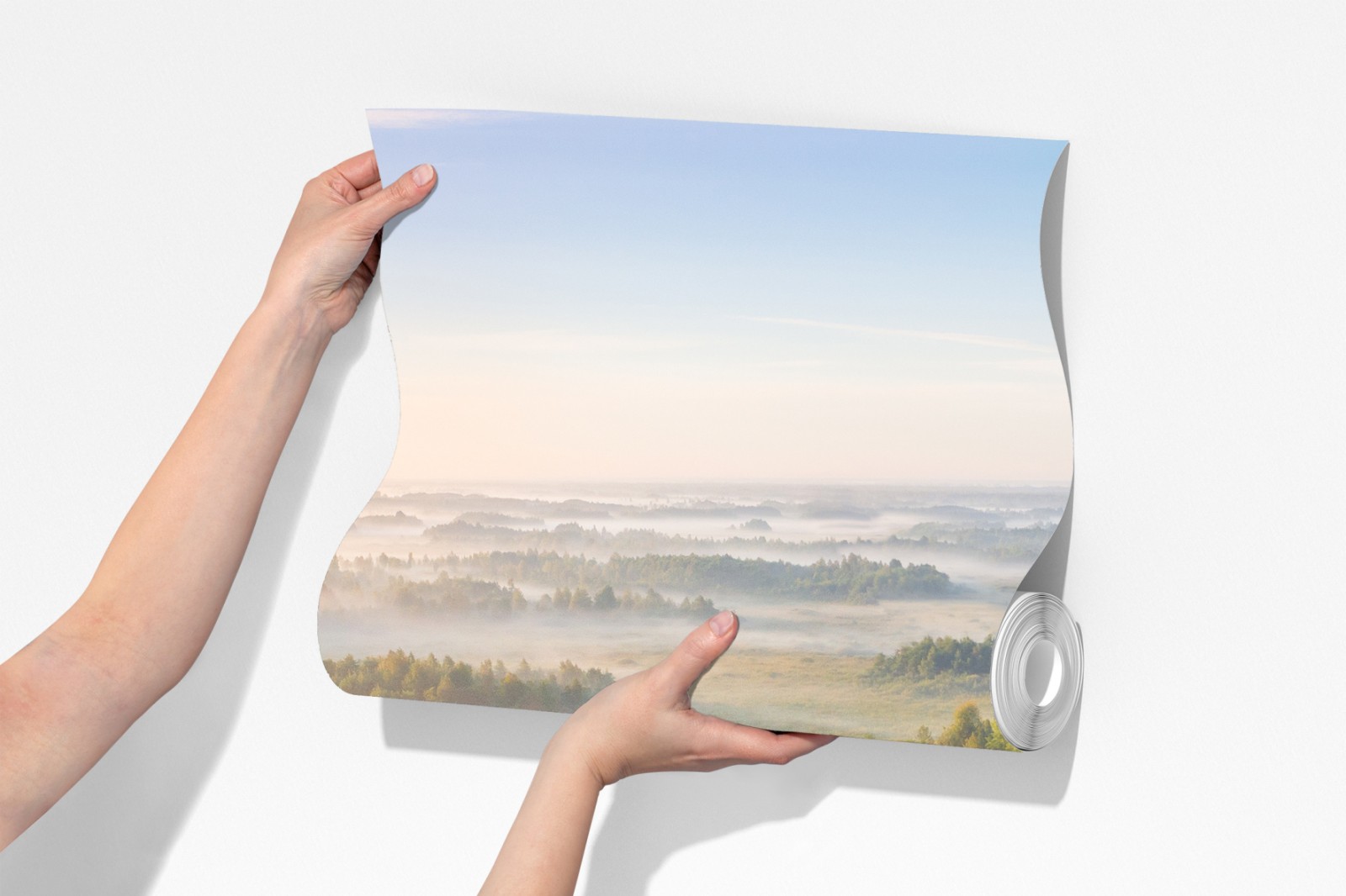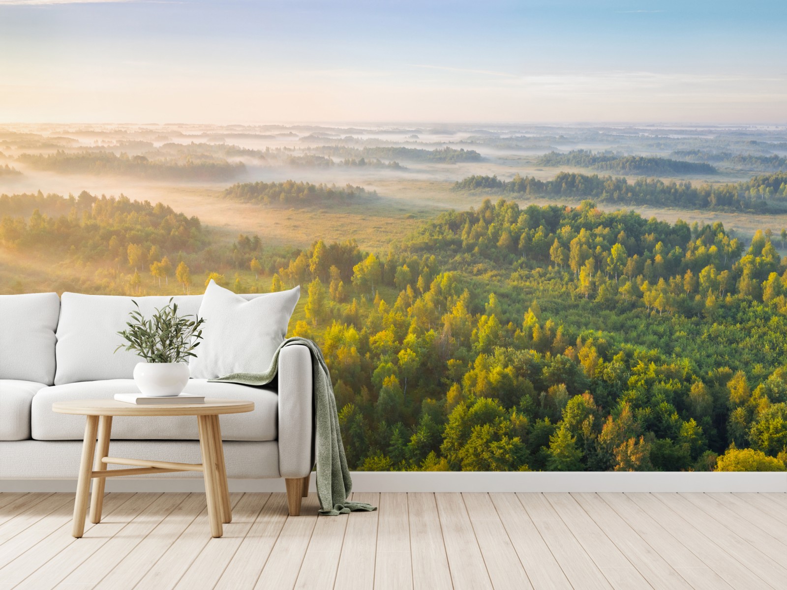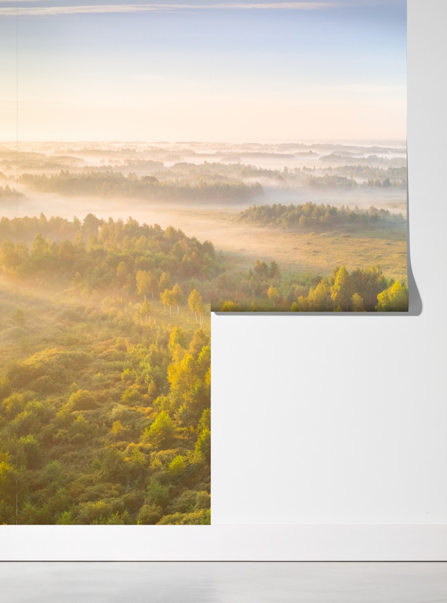 Wprowadź do wnętrza spokojną atmosferę porannej mgły nad bagnem Zvanets dzięki temu nastrojowemu krajobrazowi.