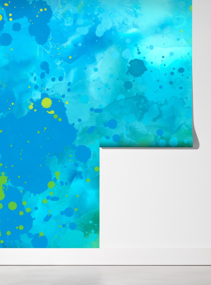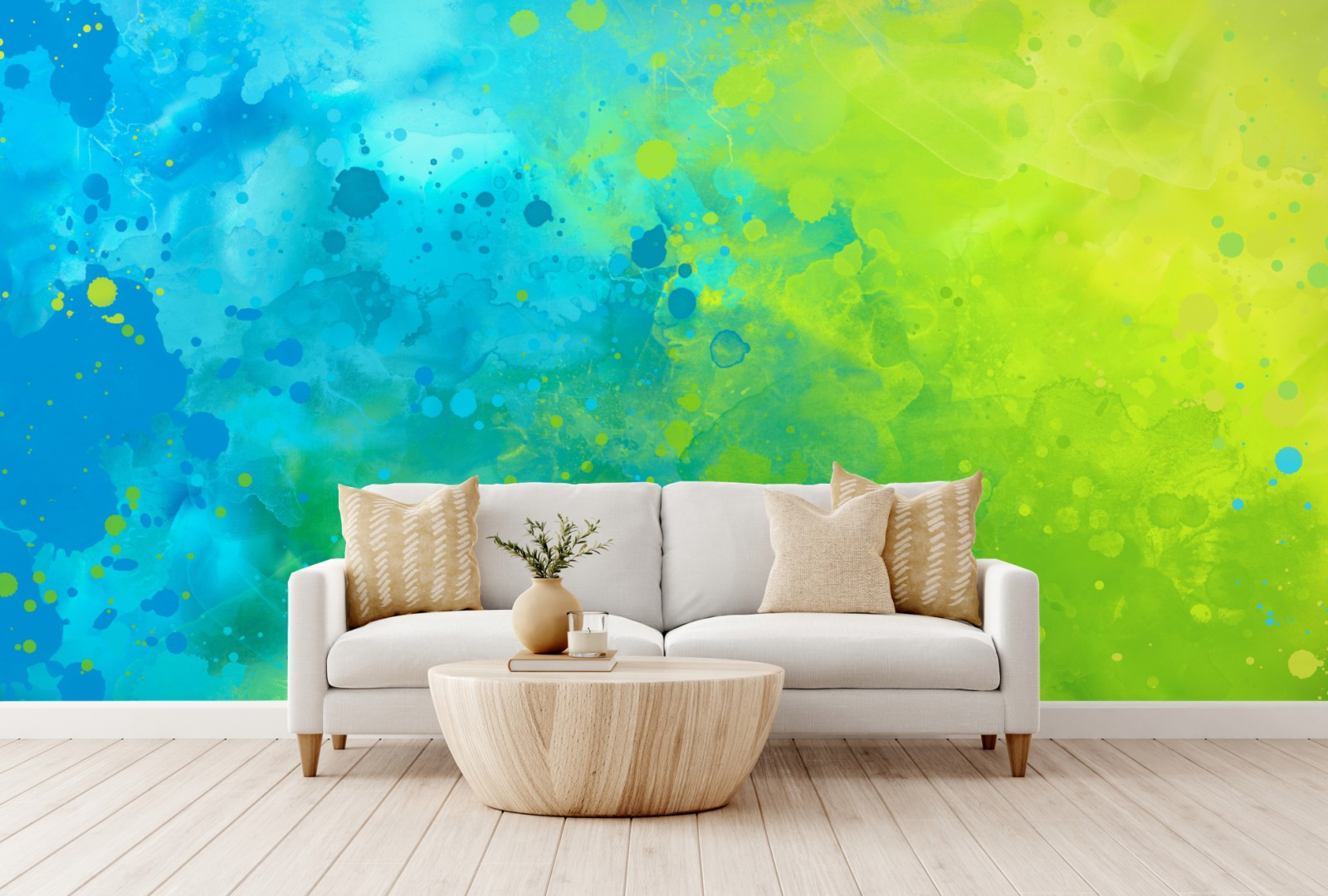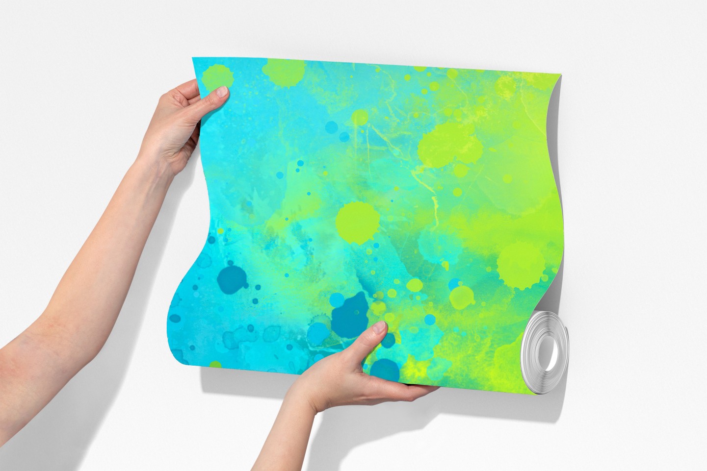 Dodaj energii wnętrzu dzięki intensywnej turkusowej akwareli z limonkowymi akcentami, idealnej do nowoczesnych pomieszczeń.
