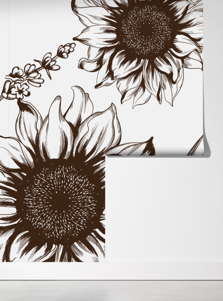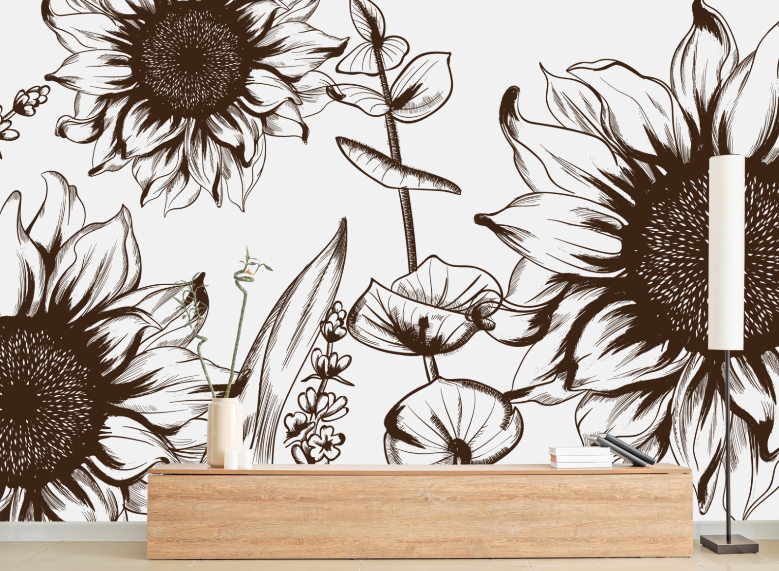 Dodaj rustykalnego uroku do wnętrza dzięki tej szczegółowej ilustracji słonecznika w sepii, idealnej do stworzenia ciepłej, vintage atmosfery.