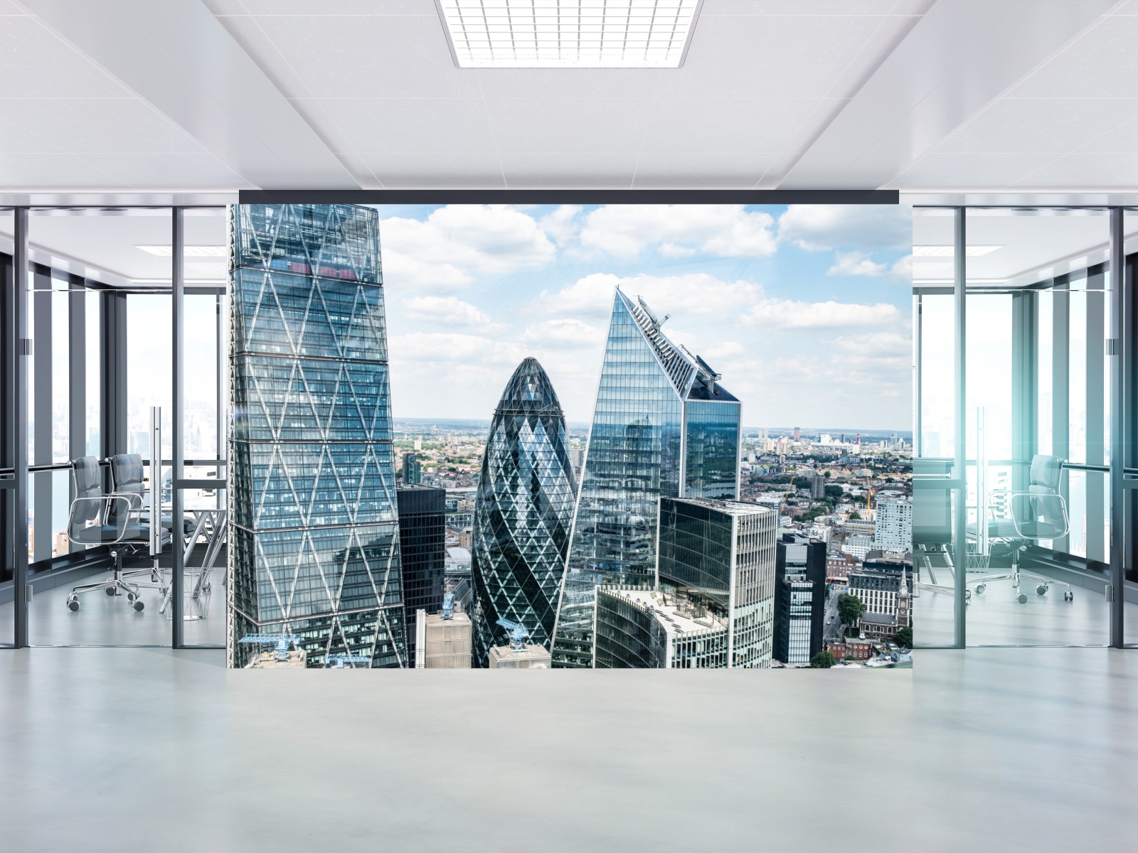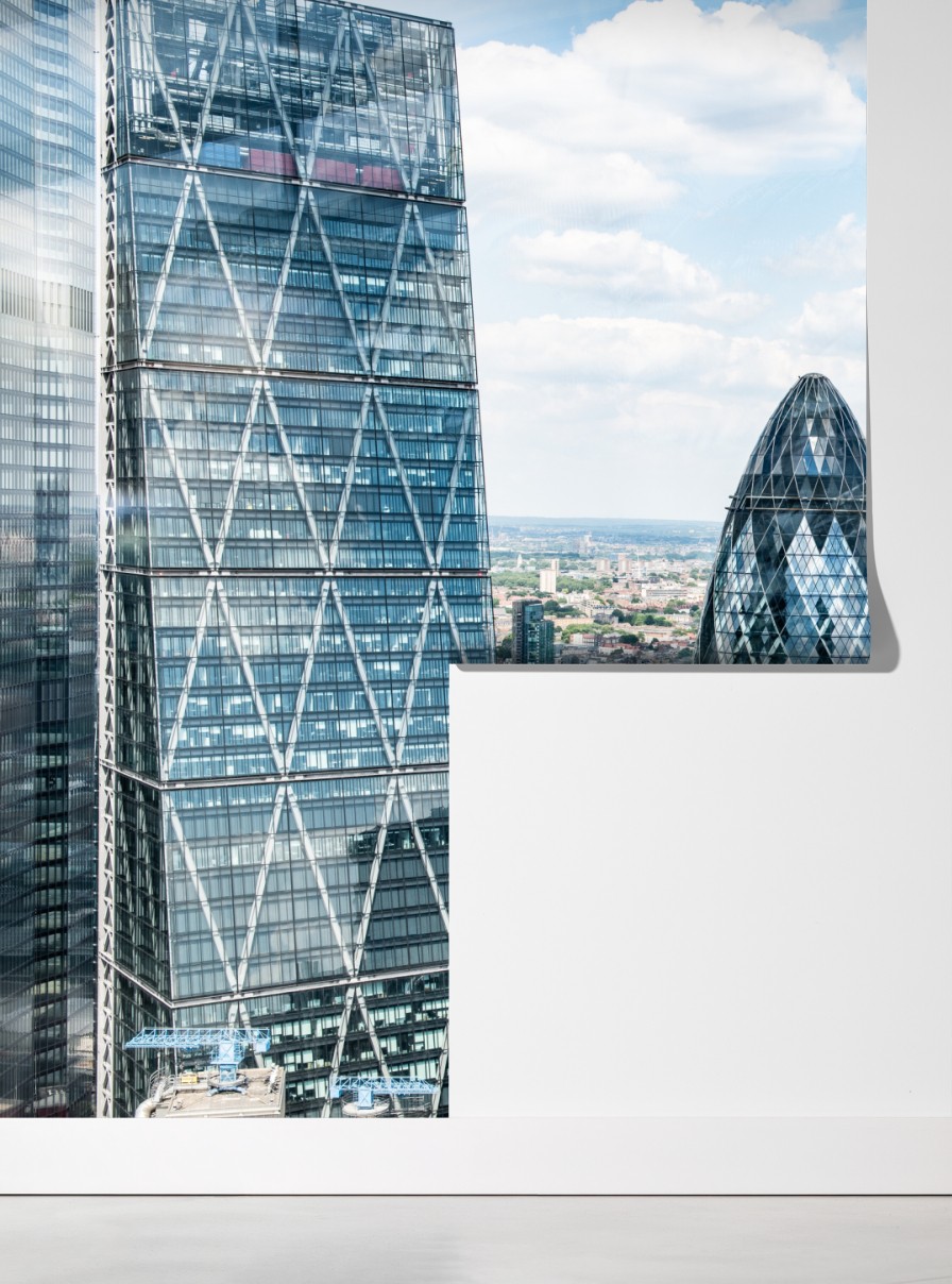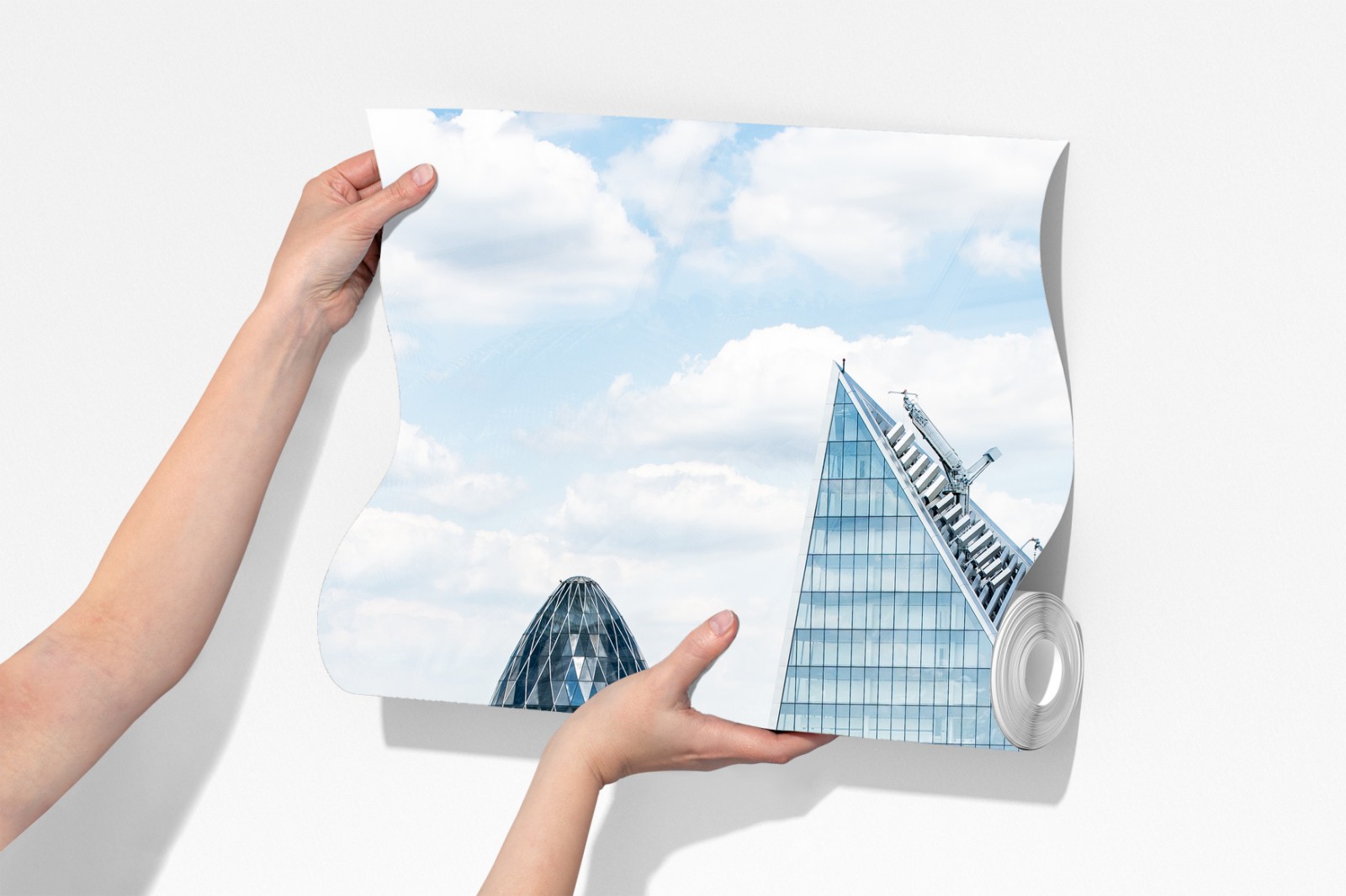 Wprowadź energię londyńskiego skyline'u do wnętrza dzięki temu wyraźnemu zdjęciu przedstawiającemu szklane wieżowce i jasne niebo.
