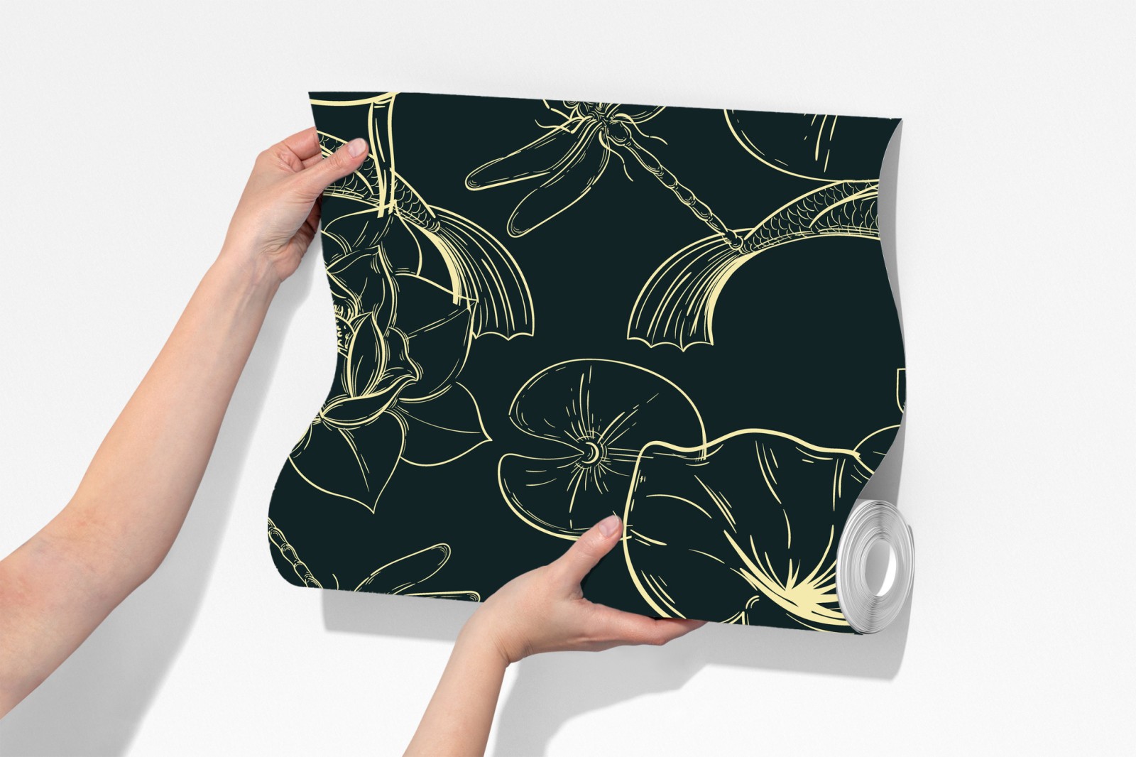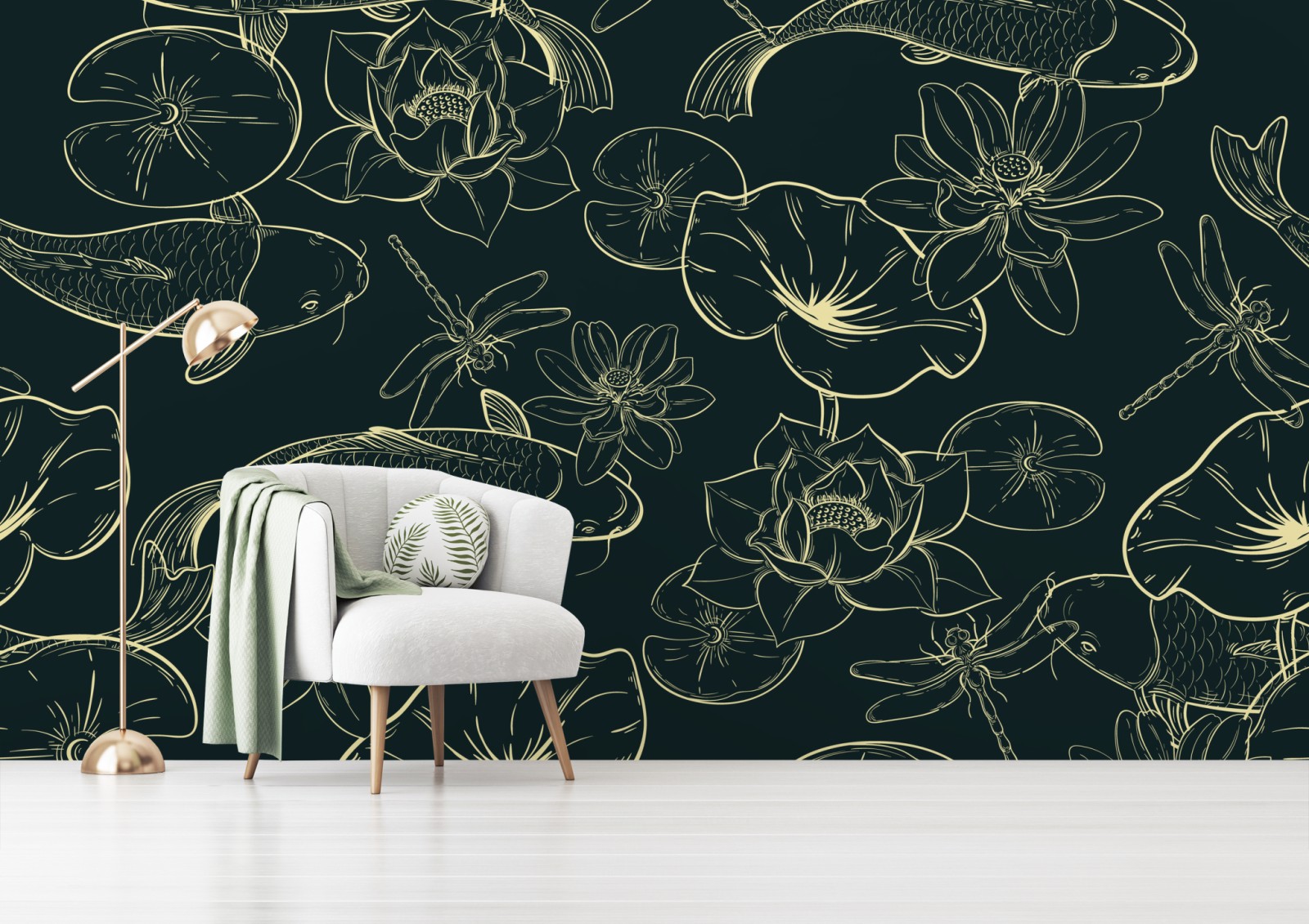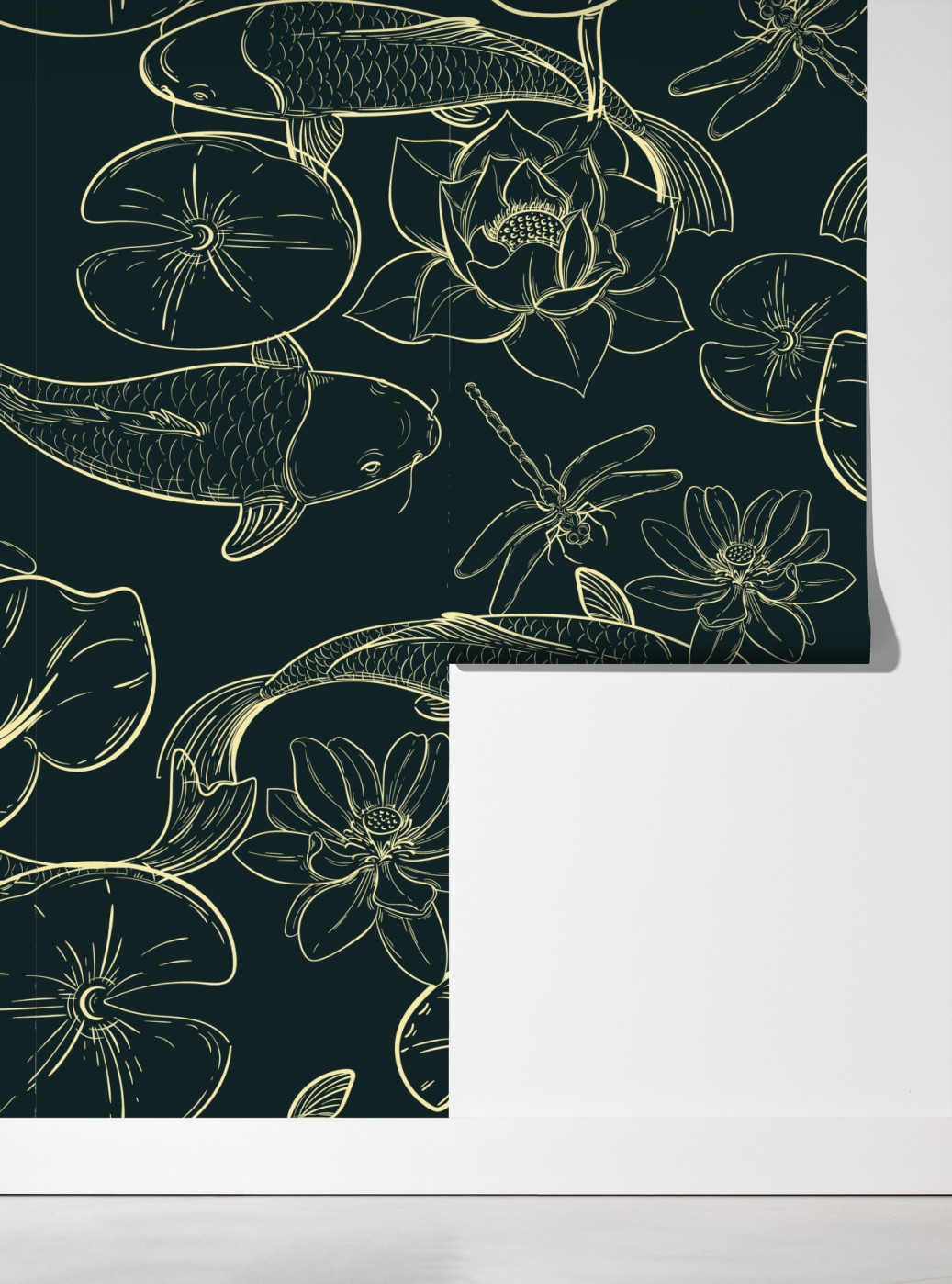 Dodaj elegancji do wnętrza dzięki temu ręcznie rysowanemu wzorowi koi i lotosu w stonowanych barwach, idealnemu do stworzenia uspokajającej atmosfery.
