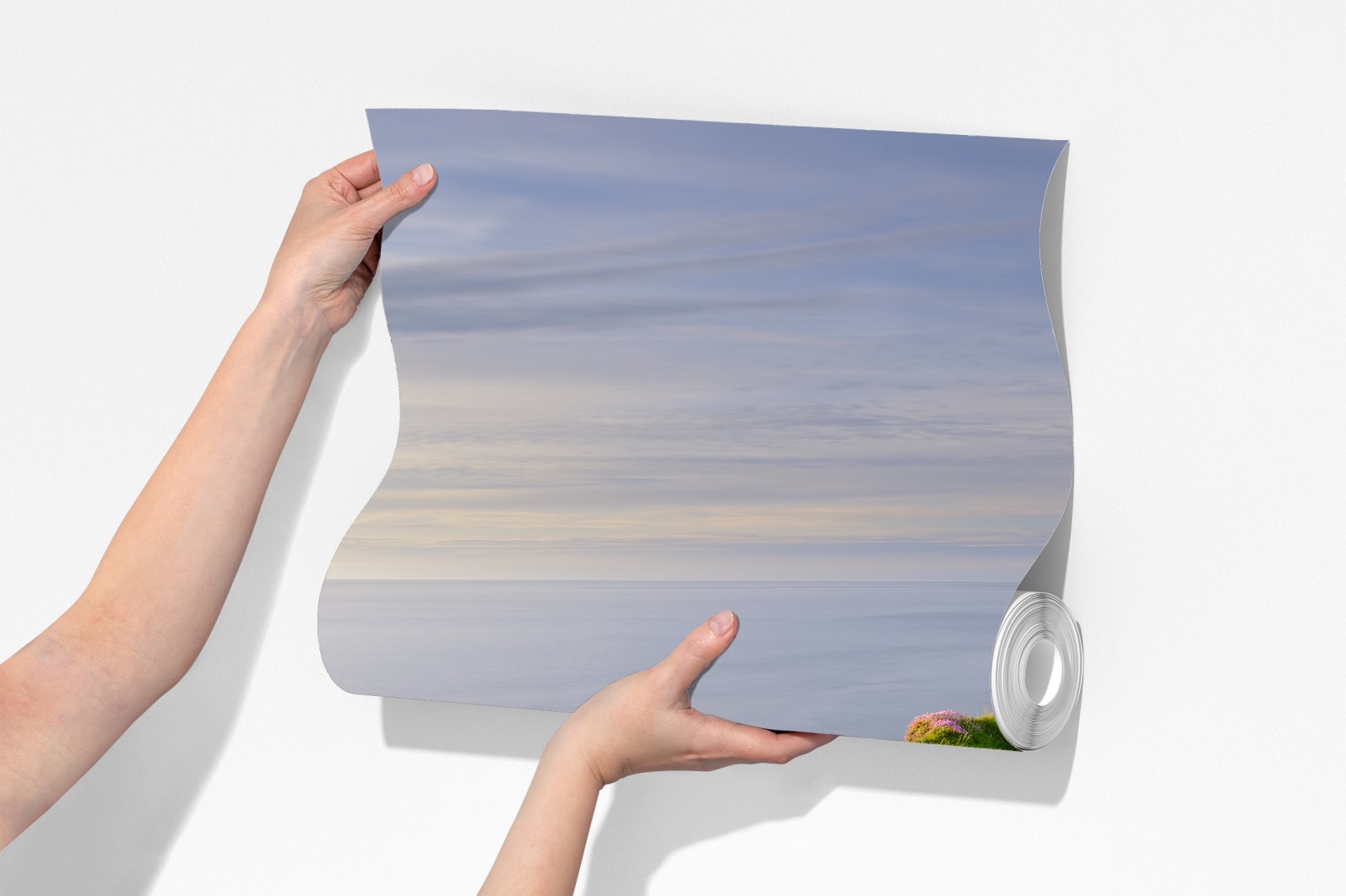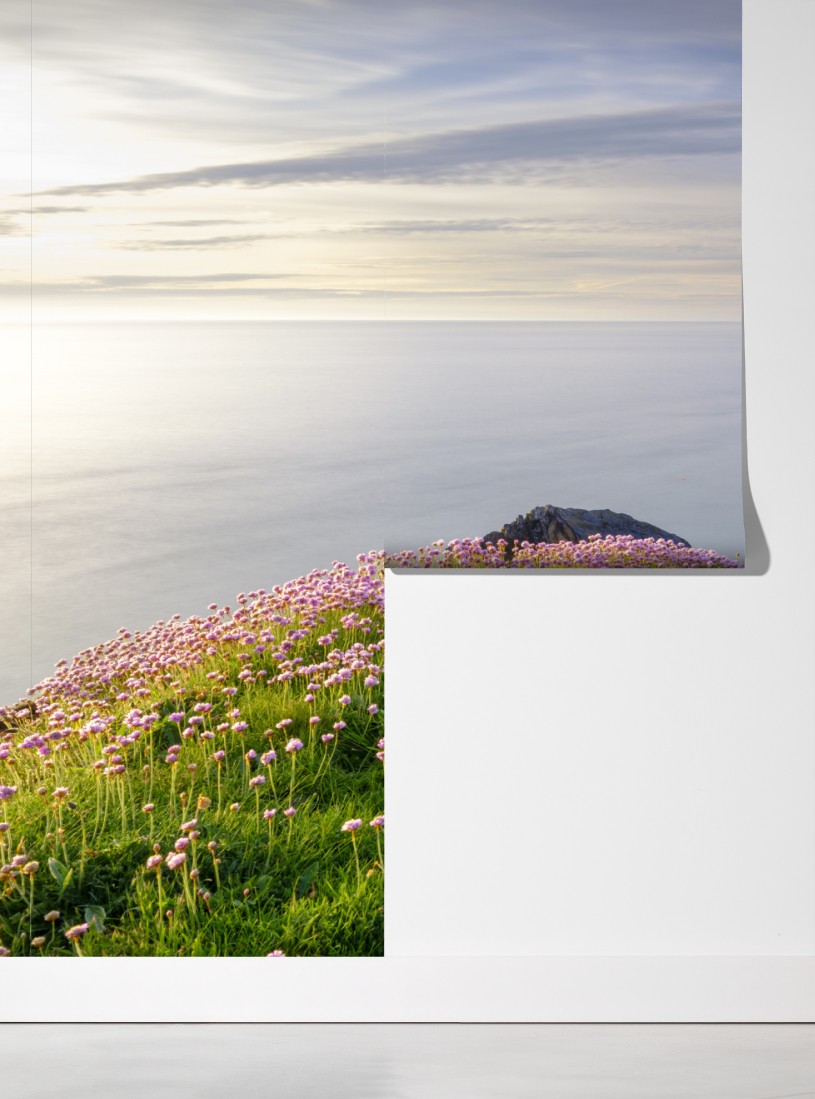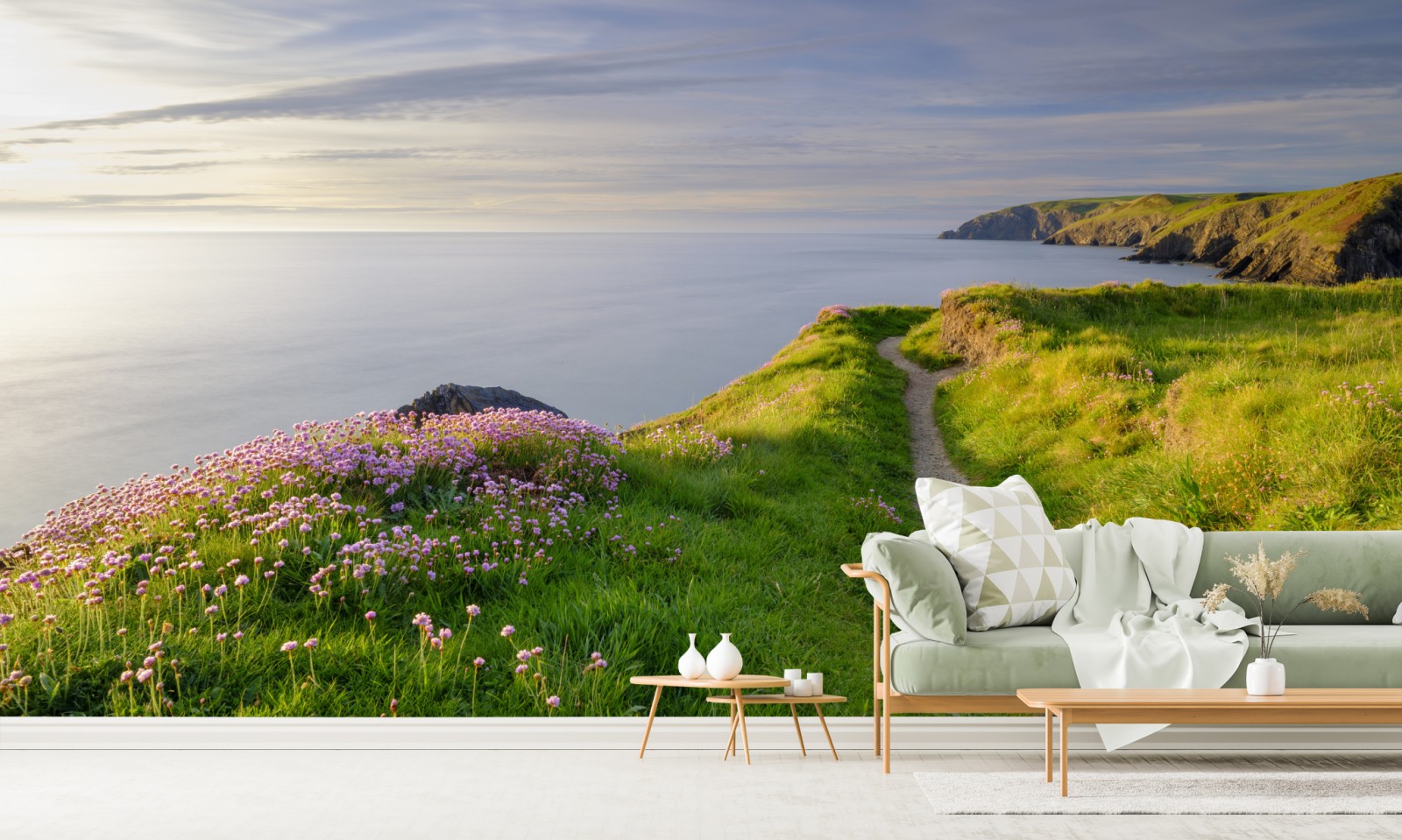 Wprowadź do wnętrza spokojny nadmorski krajobraz ze słoneczną ścieżką, klifami i morskimi goździkami.