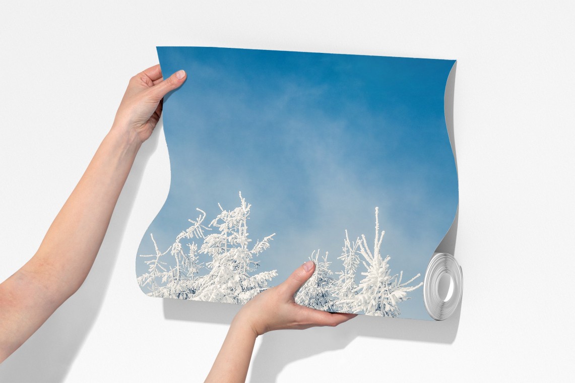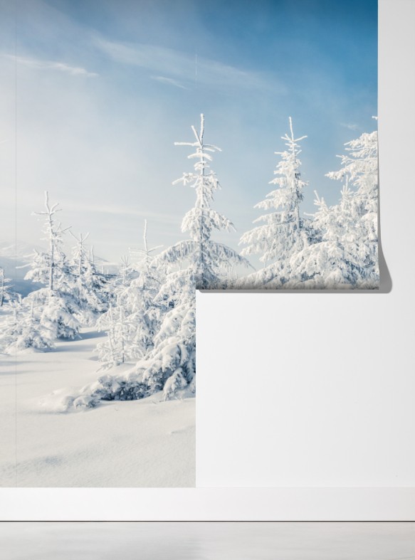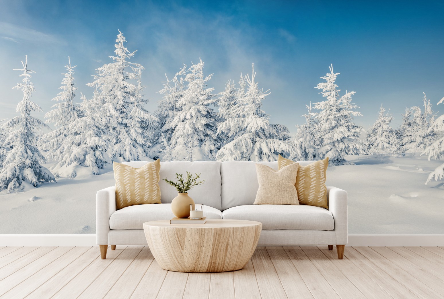 Odkryj spokojną urodę śnieżnego lasu uchwyconą w szerokiej panoramie, idealną do wprowadzenia chłodnej i świeżej atmosfery do wnętrza.